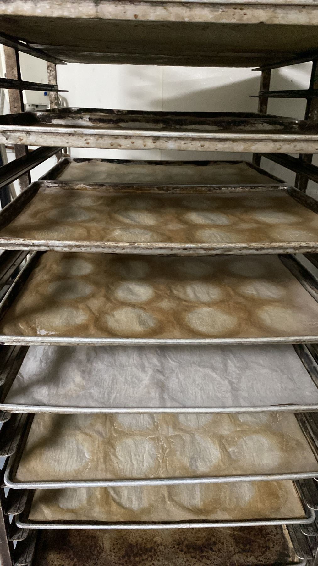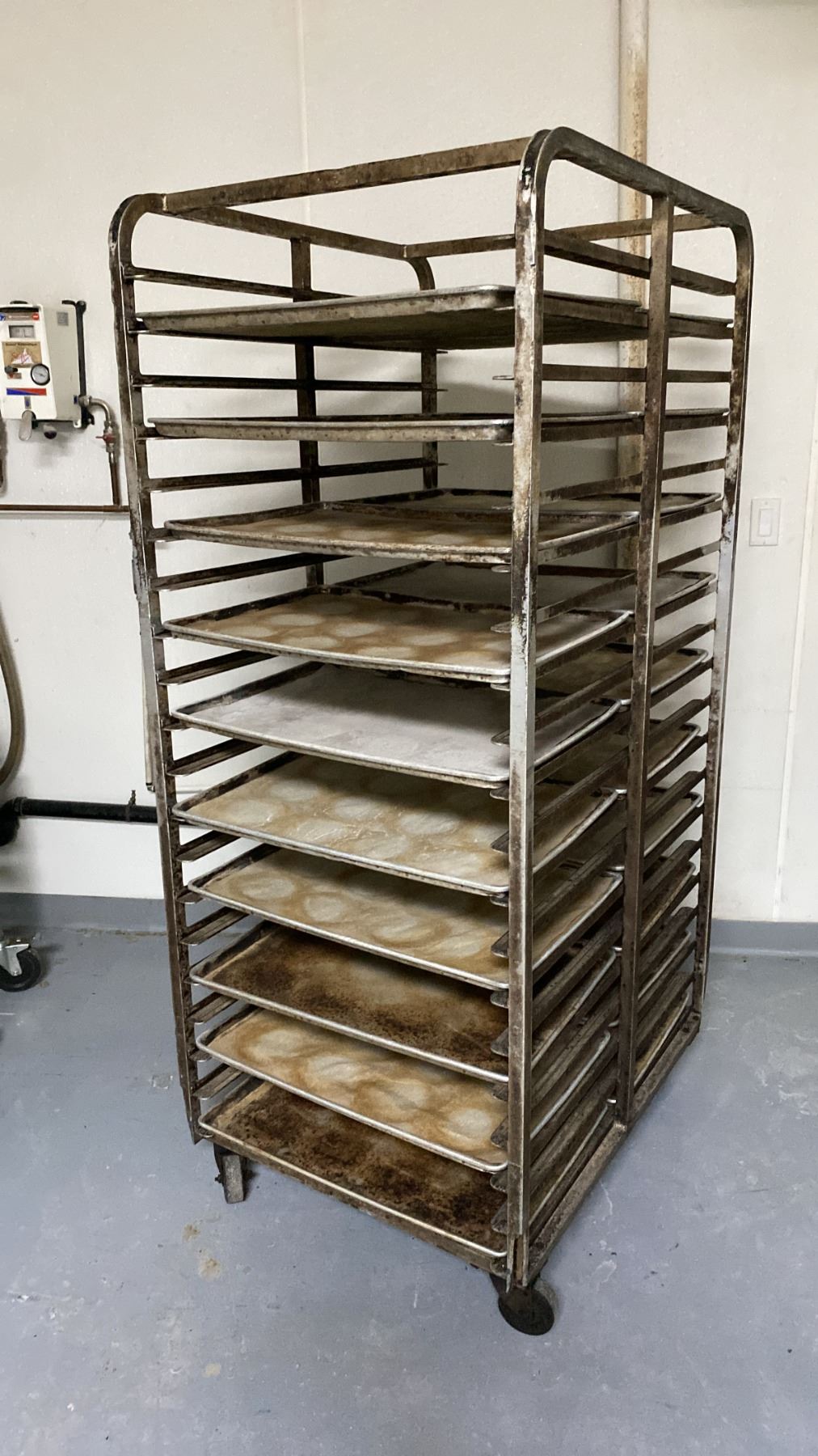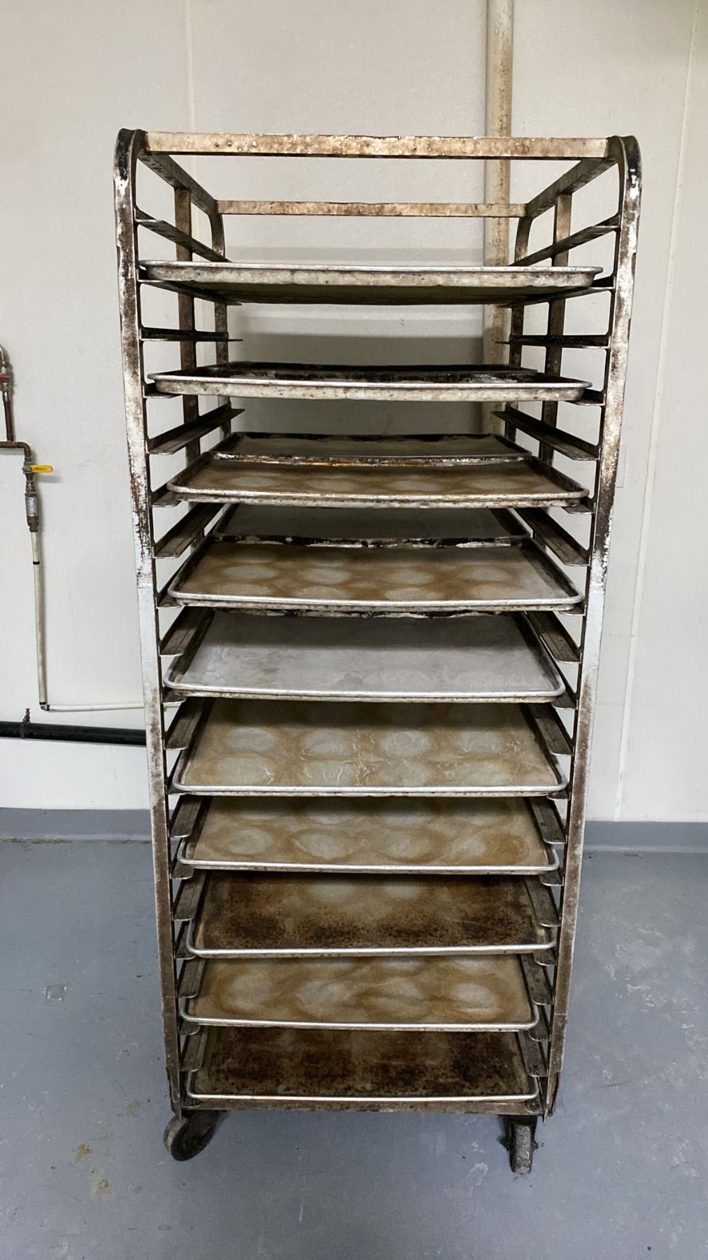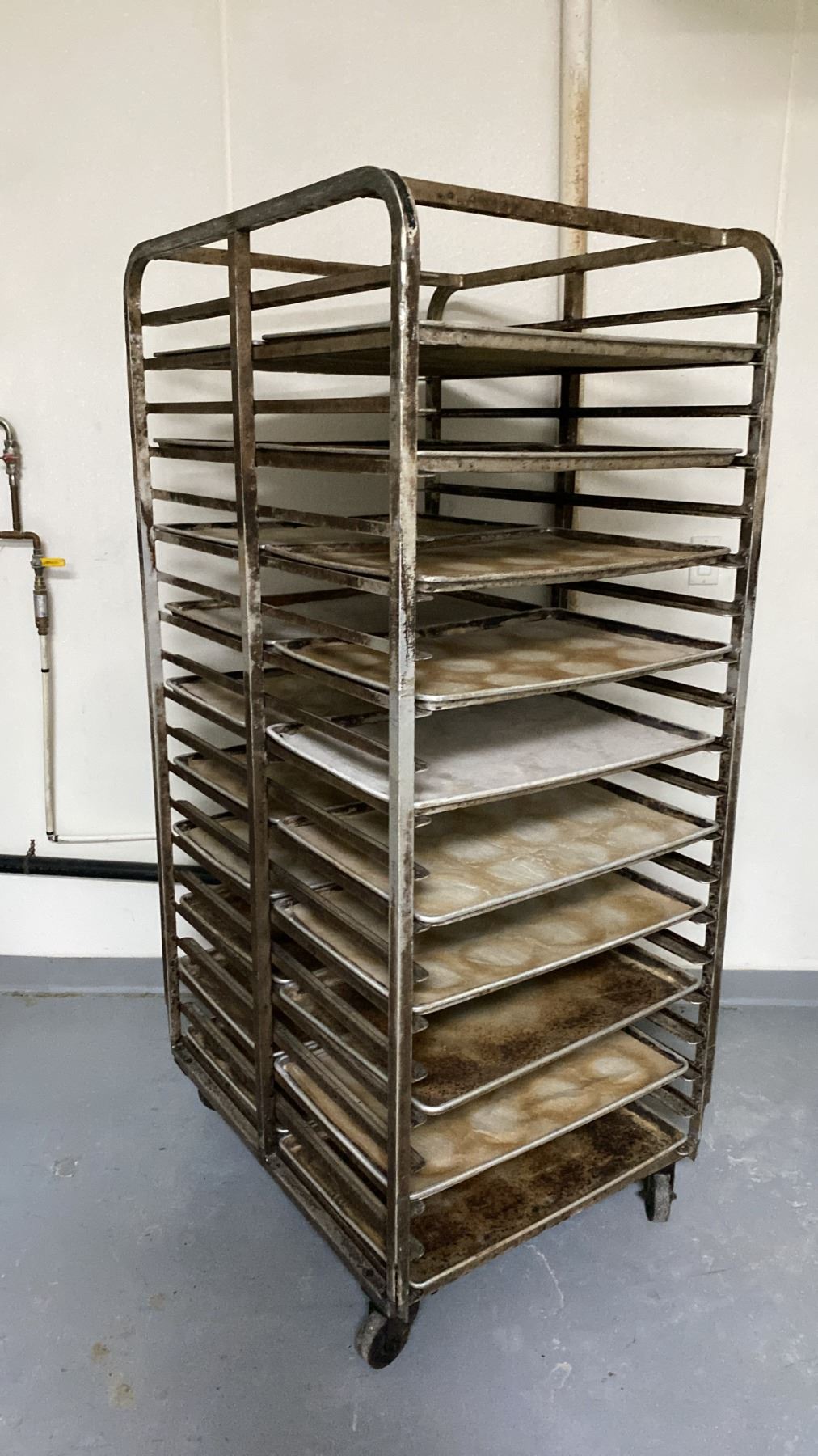 40 TRAY ALUMINUM MOBILE COMMERCIAL BAKERS RACK WITH 20 ALUMINUM COMMERCIAL BAKING TRAYS