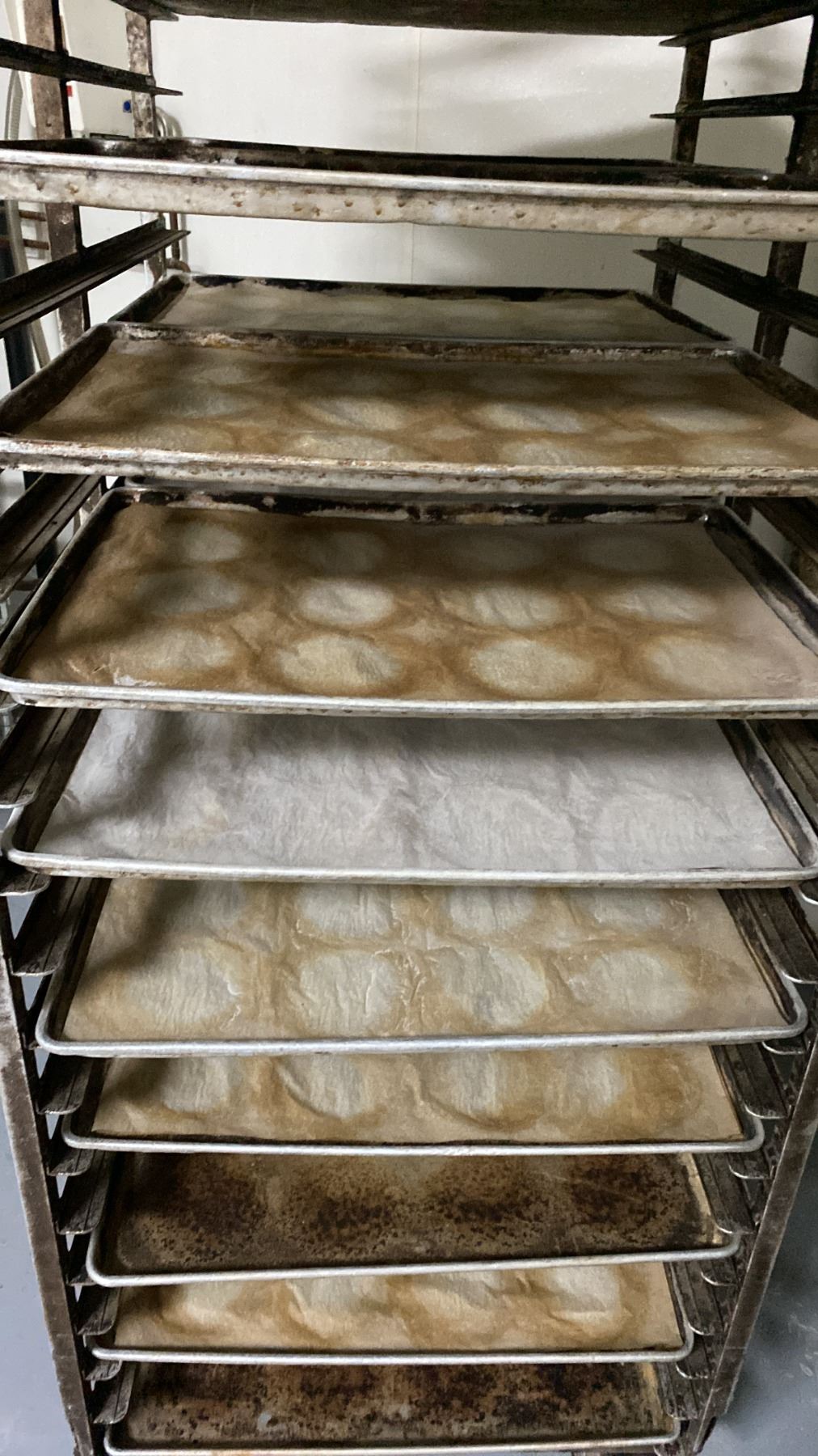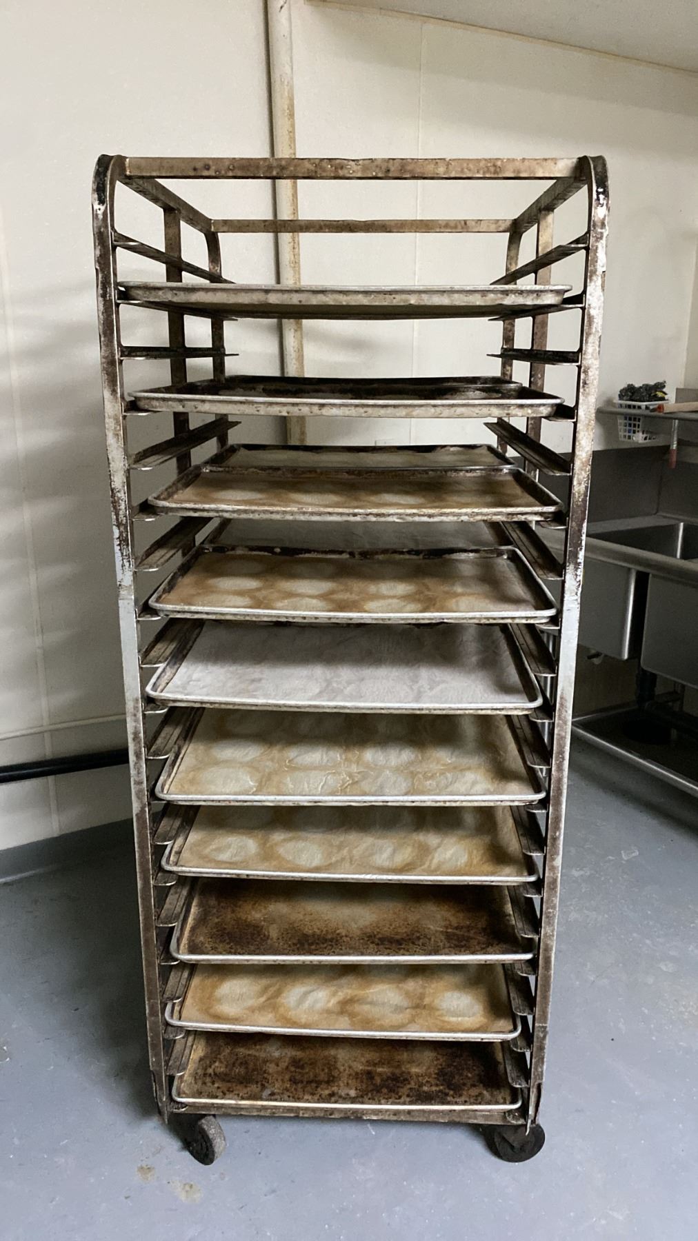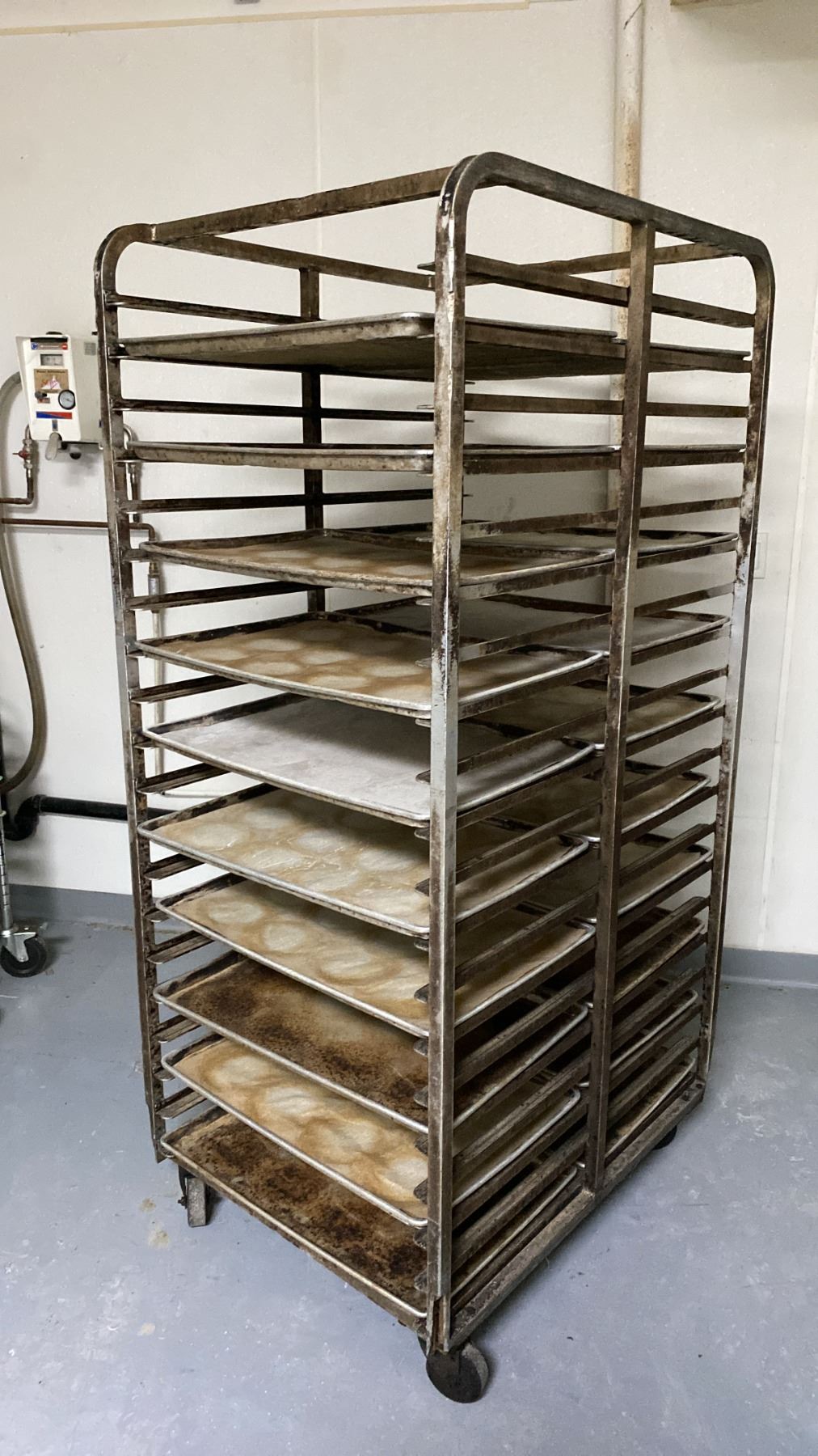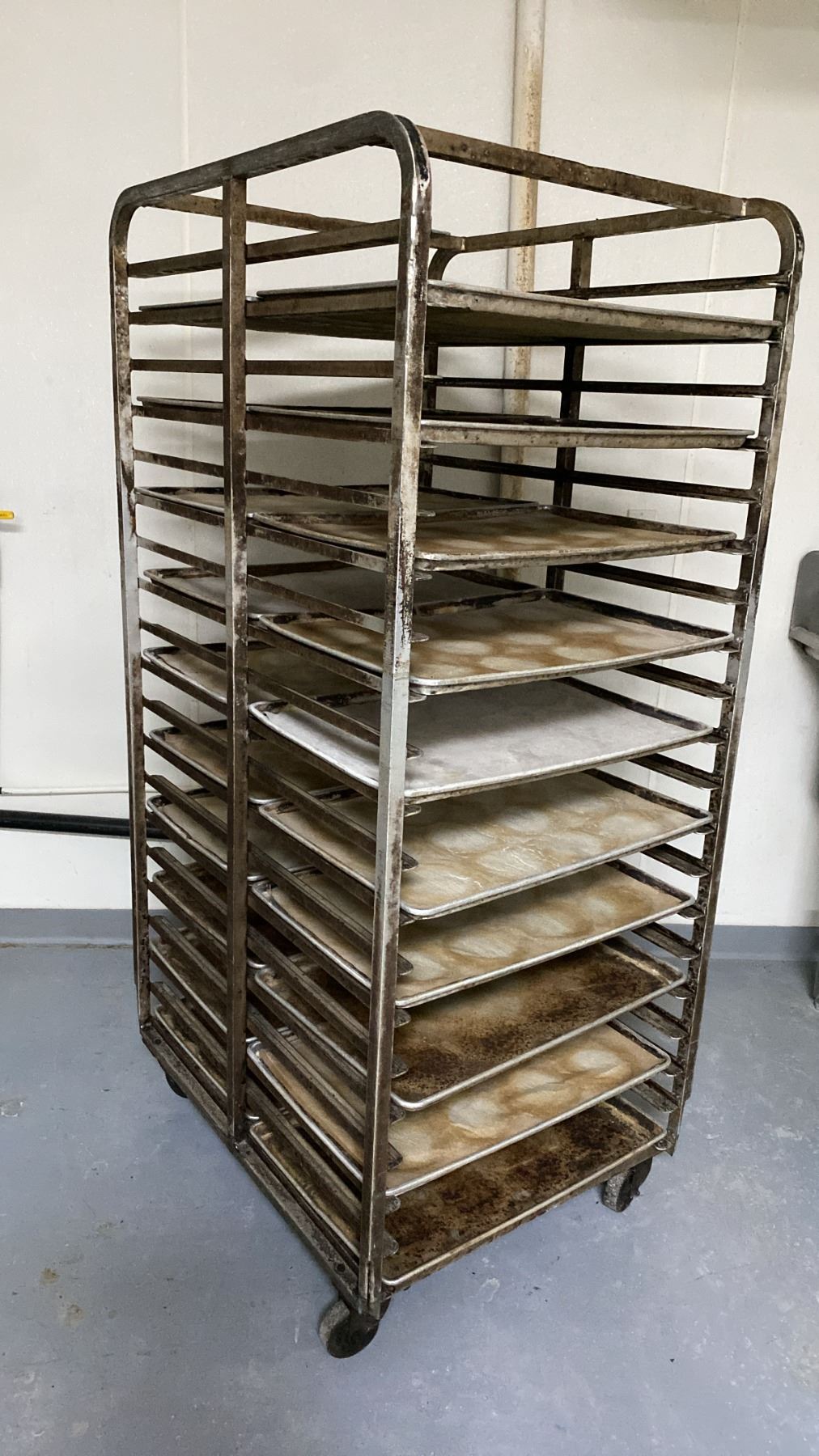 40 TRAY ALUMINUM MOBILE COMMERCIAL BAKERS RACK WITH 20 ALUMINUM COMMERCIAL BAKING TRAYS