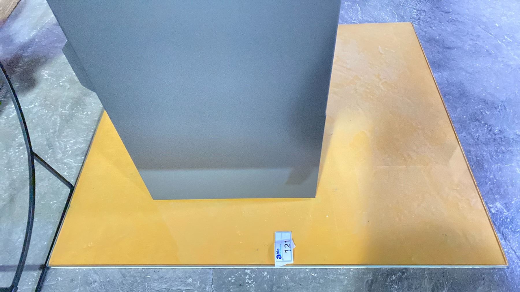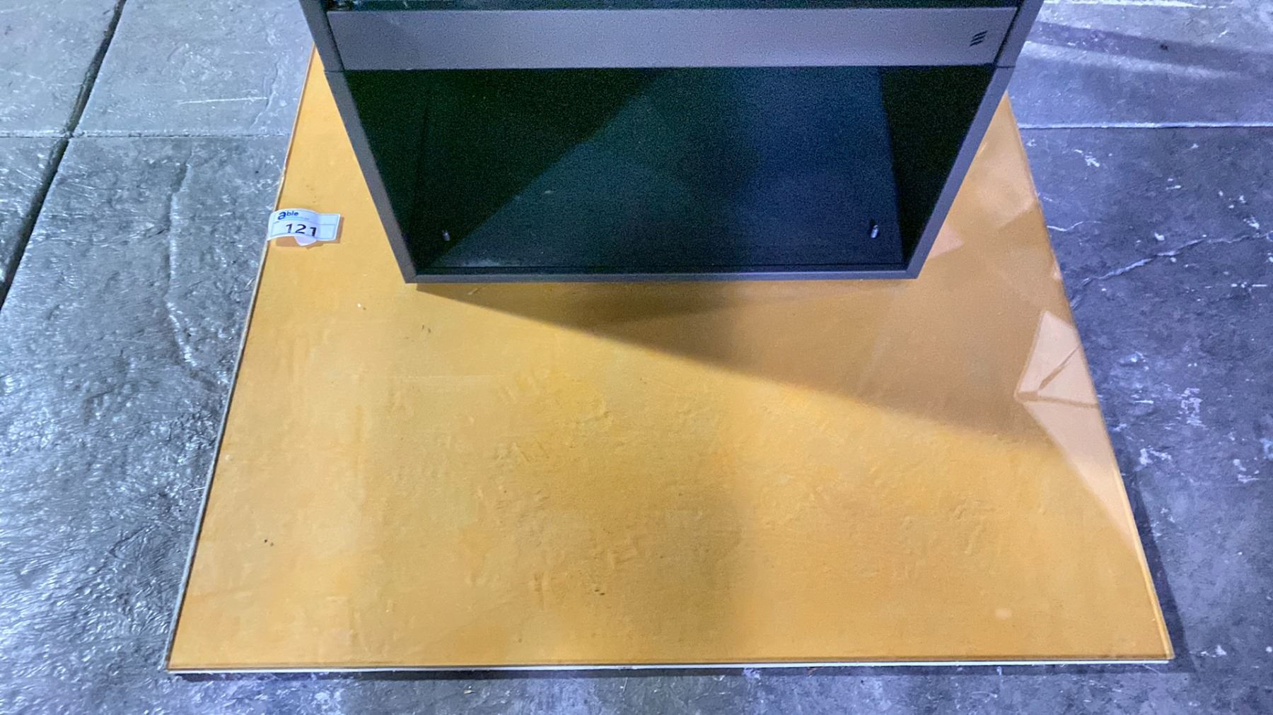 47"X54" CLEAR 1 CM THICK GLASS FIREPLACE BASE (NOTE THIS PIECE IS ON A COLORED BOARD WHICH IS WHY IT LOOKS COLORED) *REMOVAL TUE