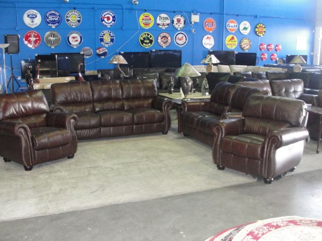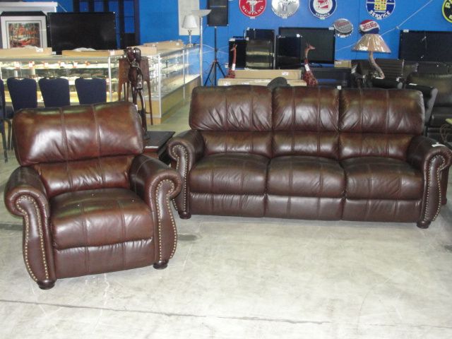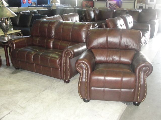 4PC BROWN LEATHER SOFA SET; SOFA, LOVESEAT AND 2 ARM CHAIRS WITH BRASS BUTTON FRONT ACCENTS