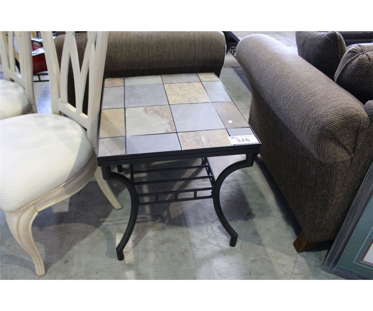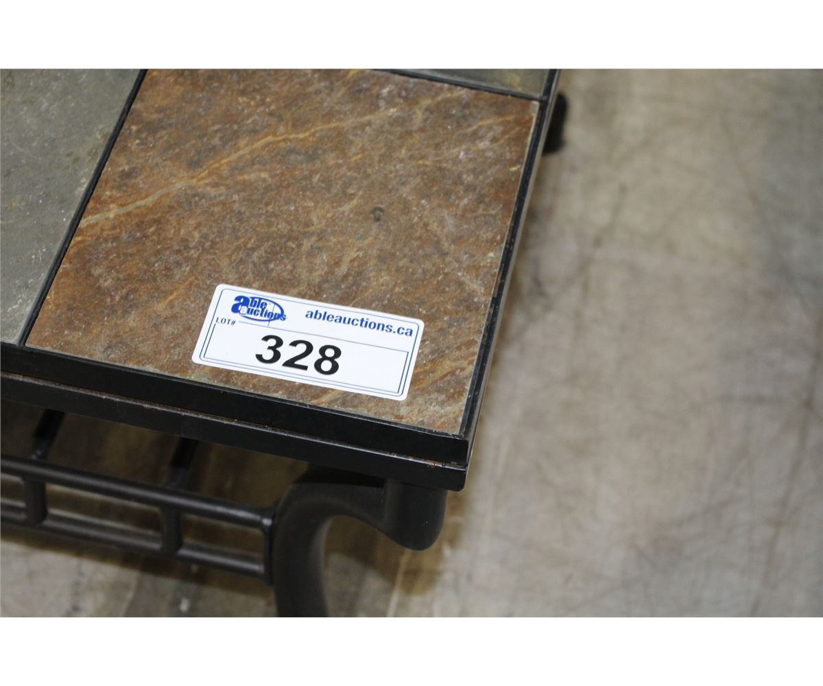4PC STONE TOP COFFEE TABLE SET; COFFEE TABLE, 2 END TABLES (ONE CORNER TILE ON ONE END TABLE CHIPPED), AND SOFA TABLE. COMES WITH BOX OF EXTRA TILE