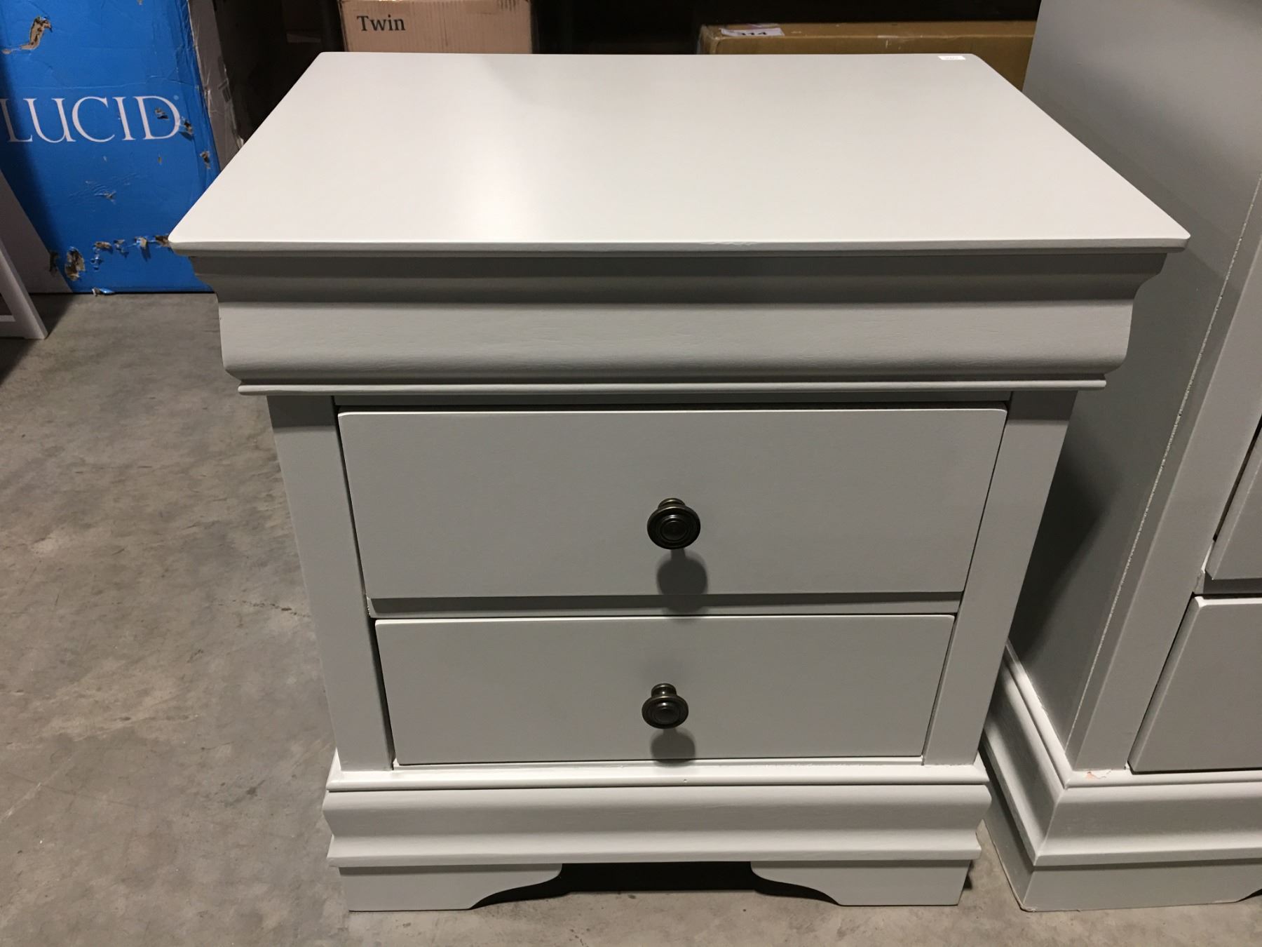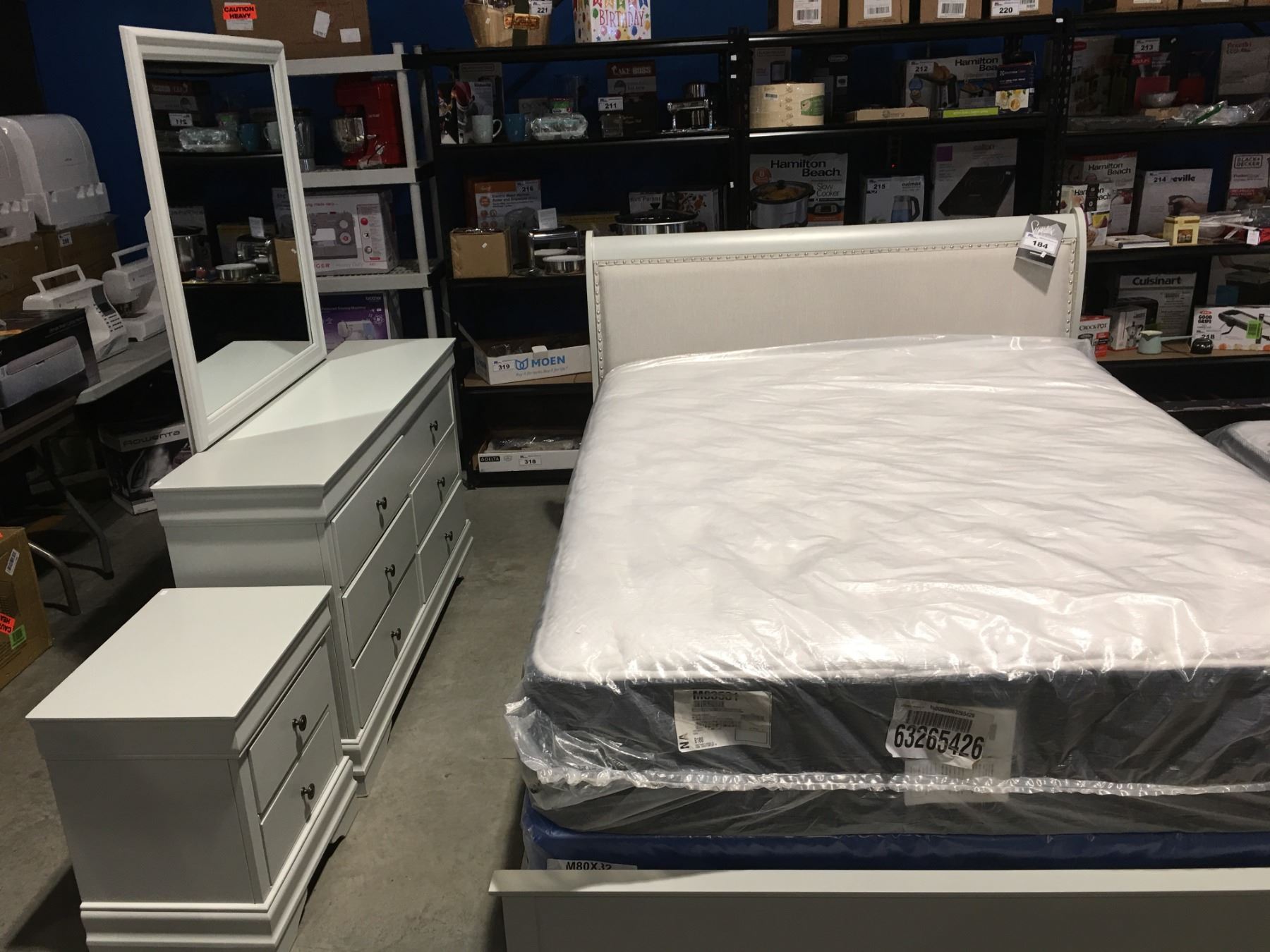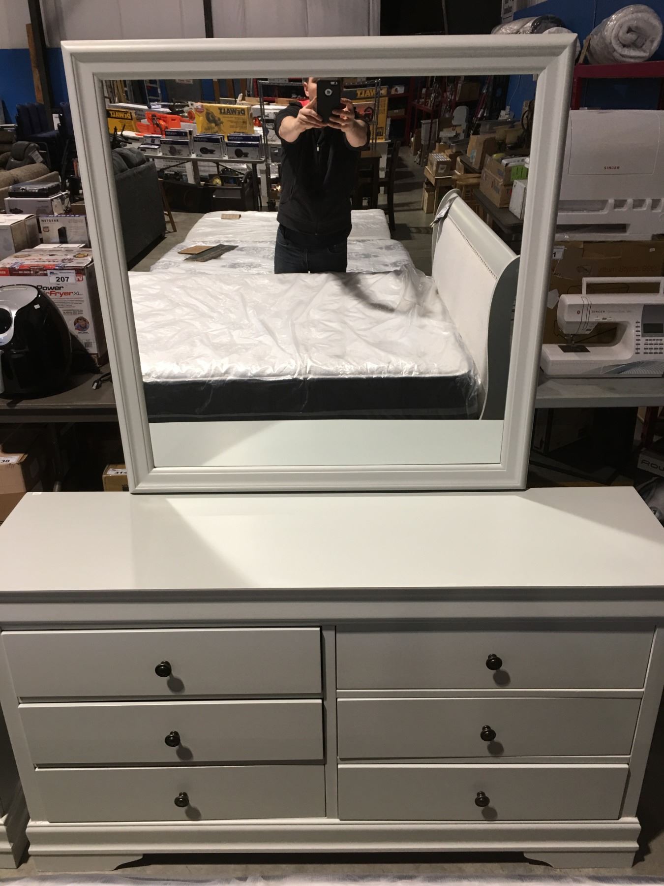 4PCS QUEEN SIZE BEDROOM SUITE - HEADBOARD, FOOTBOARD WITH RAILS, 6 DRAWER DRESSER WITH MIRROR & 2 DRAWER NIGHT STAND