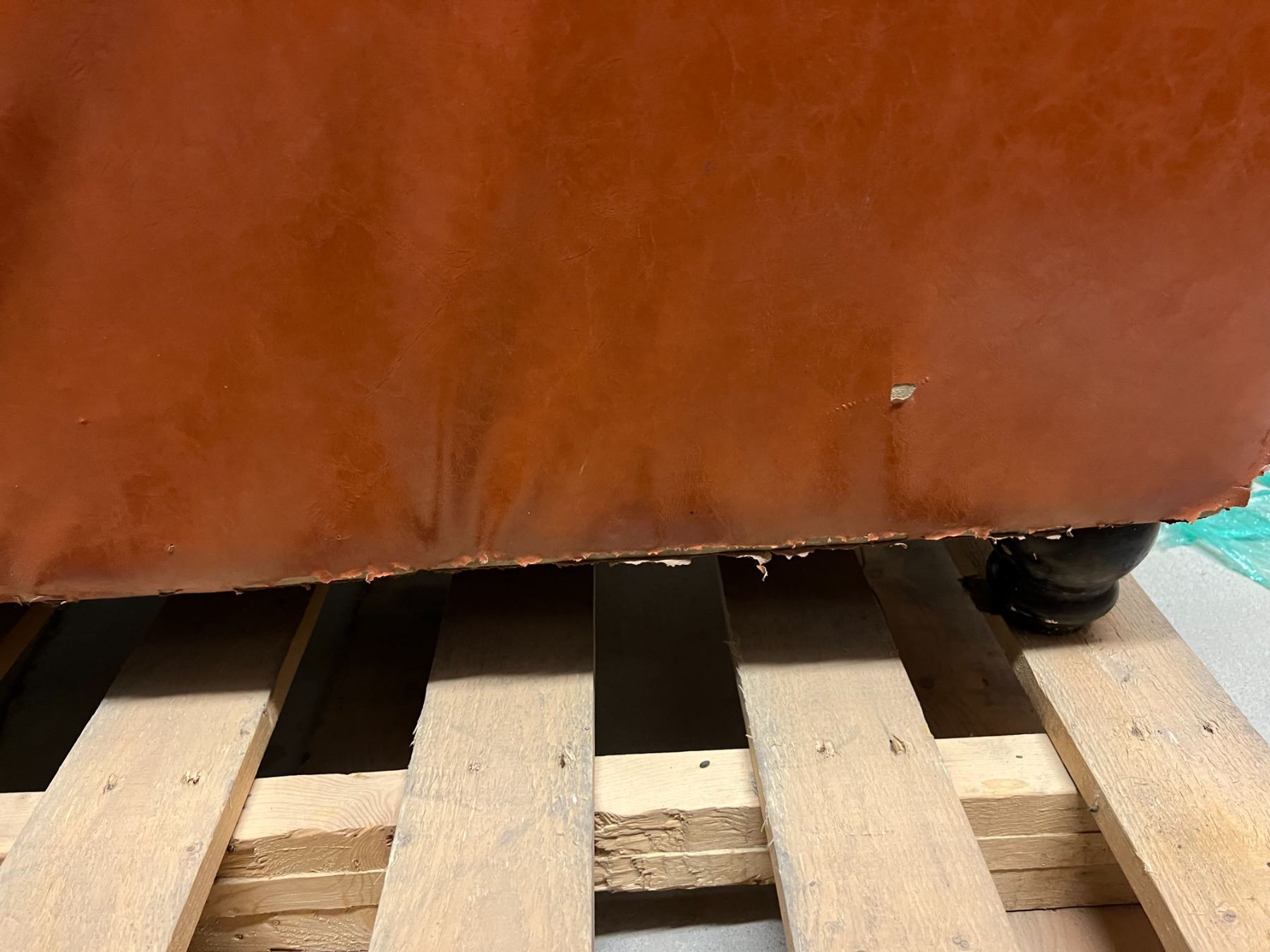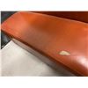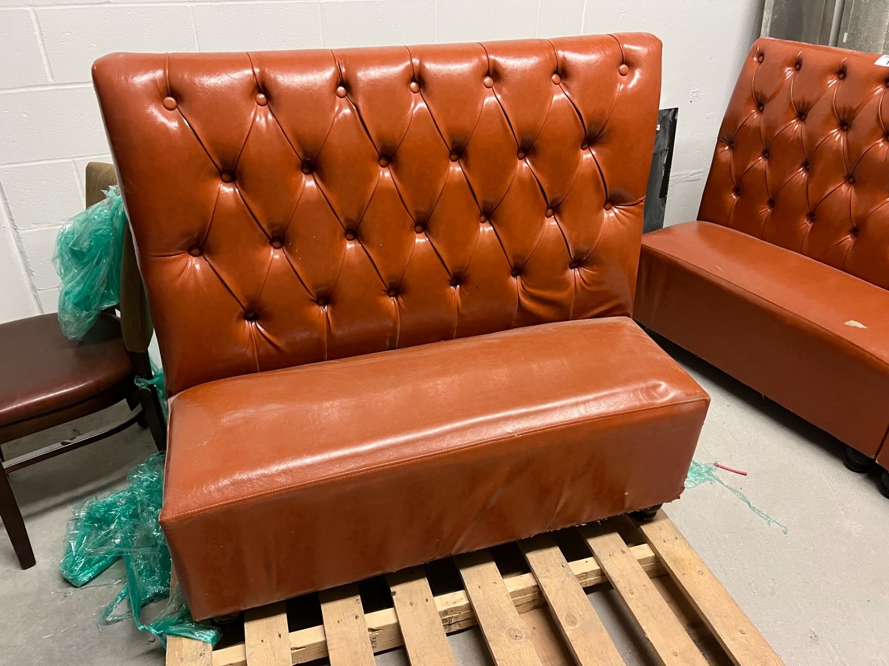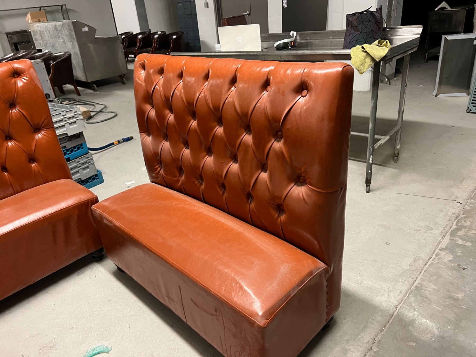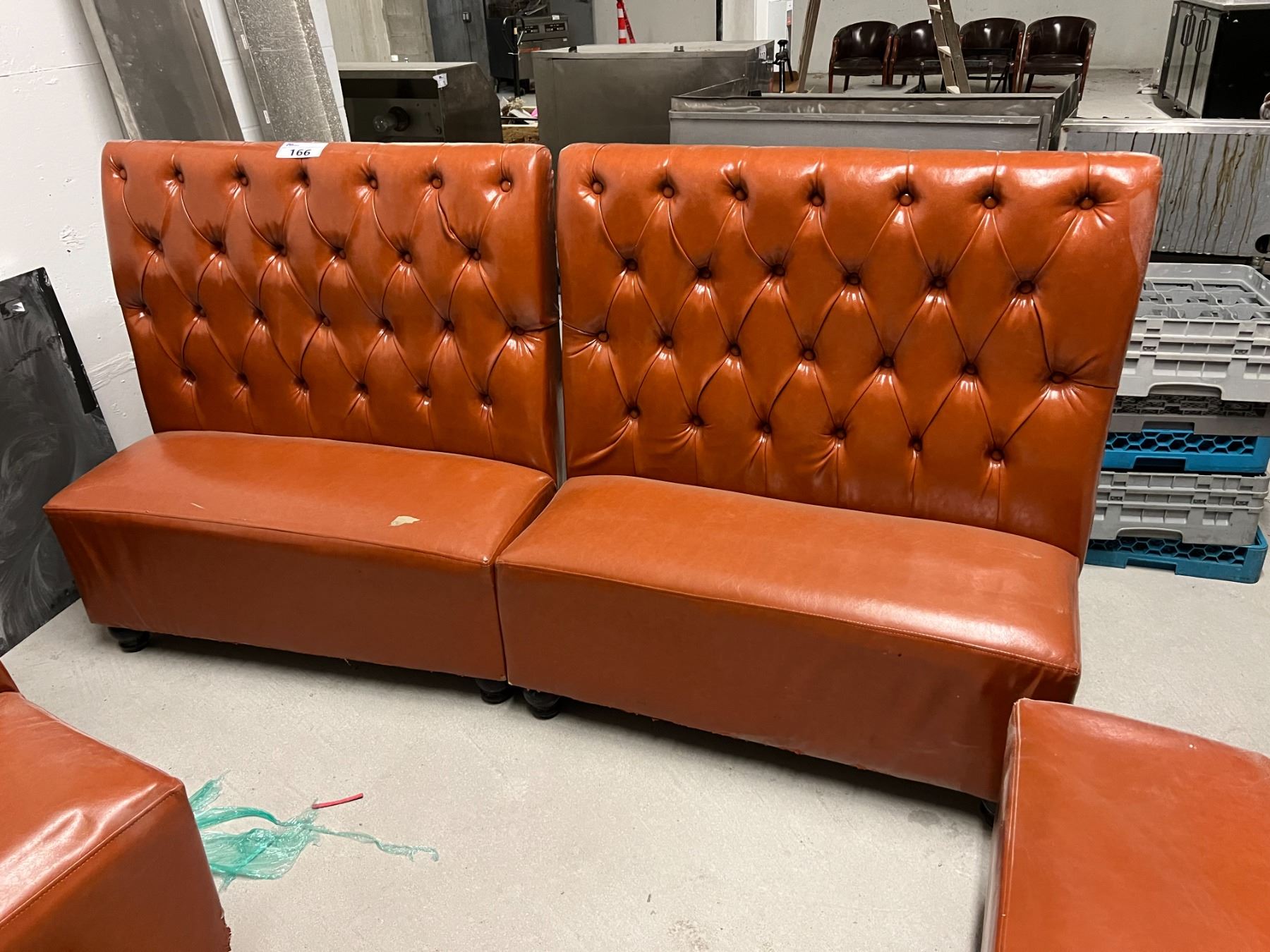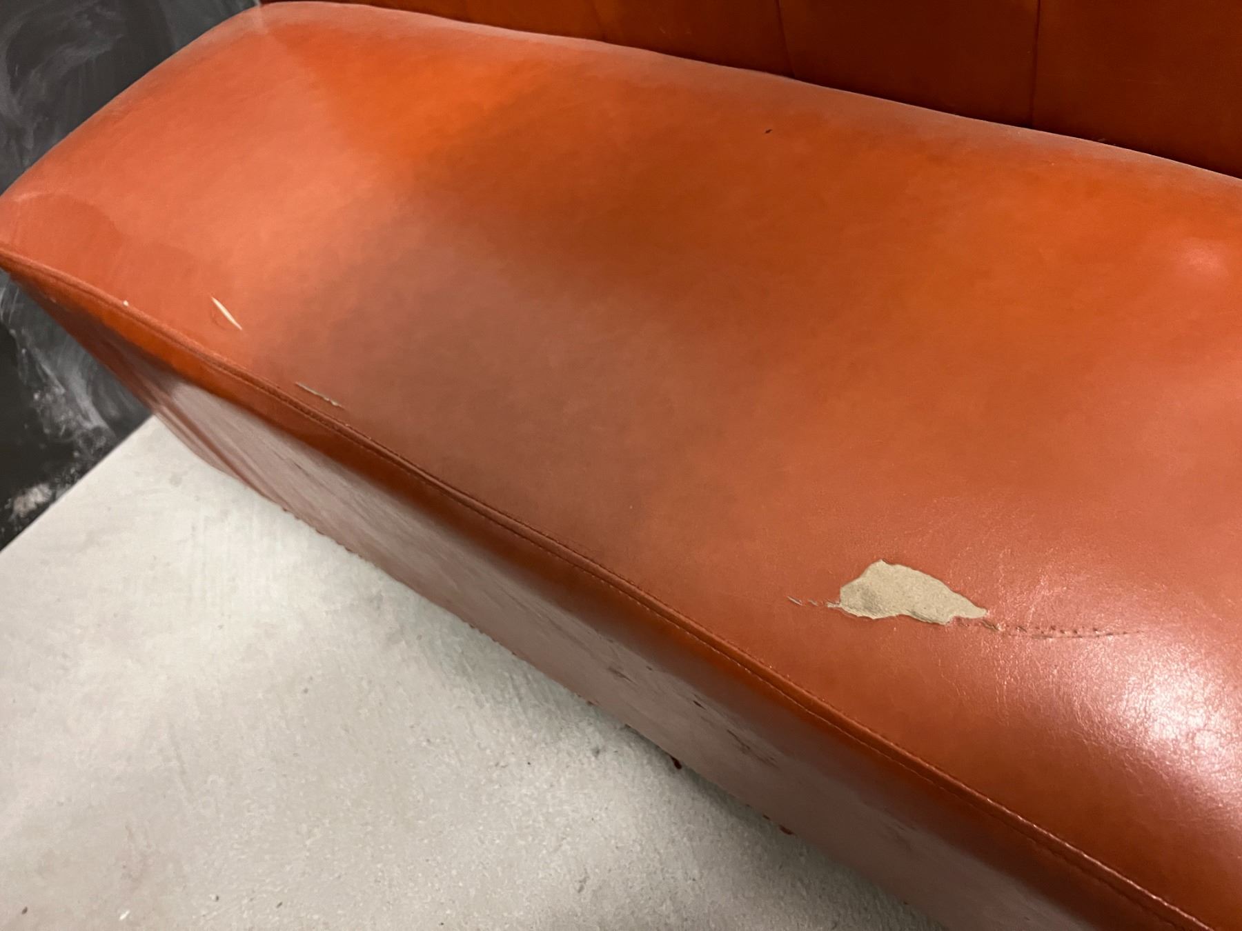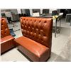 4X 45" LONG BOOTH SEATS. 44" HIGH. DARK ORANGE COLOUR UPHOLSTERY. DAMAGE AS SHOWN IN PHOTOS