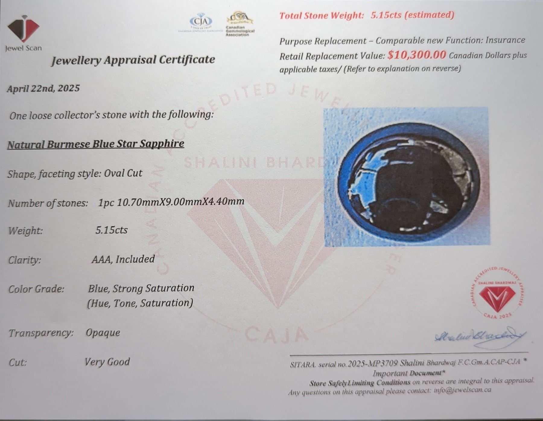 5.15 CT CERTIFIED BLUE STAR SAPPHIRE GEMSTONE ($10,300 APPRAISAL, APPRAISAL NOT GUARANTEED)