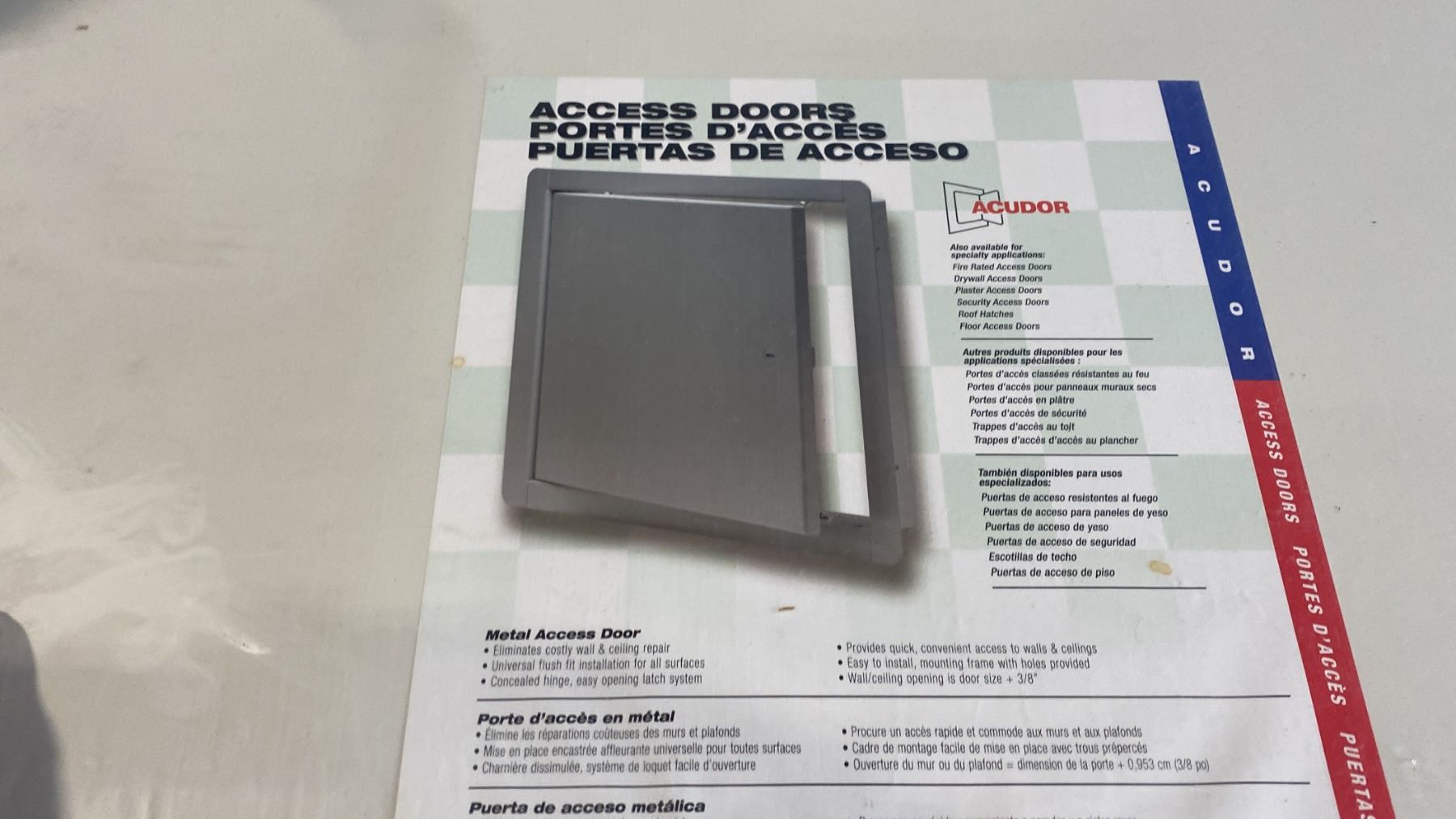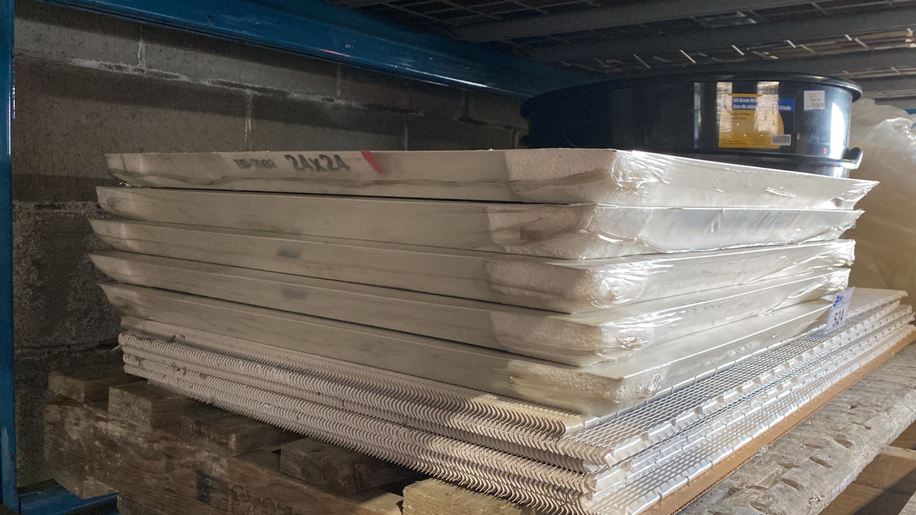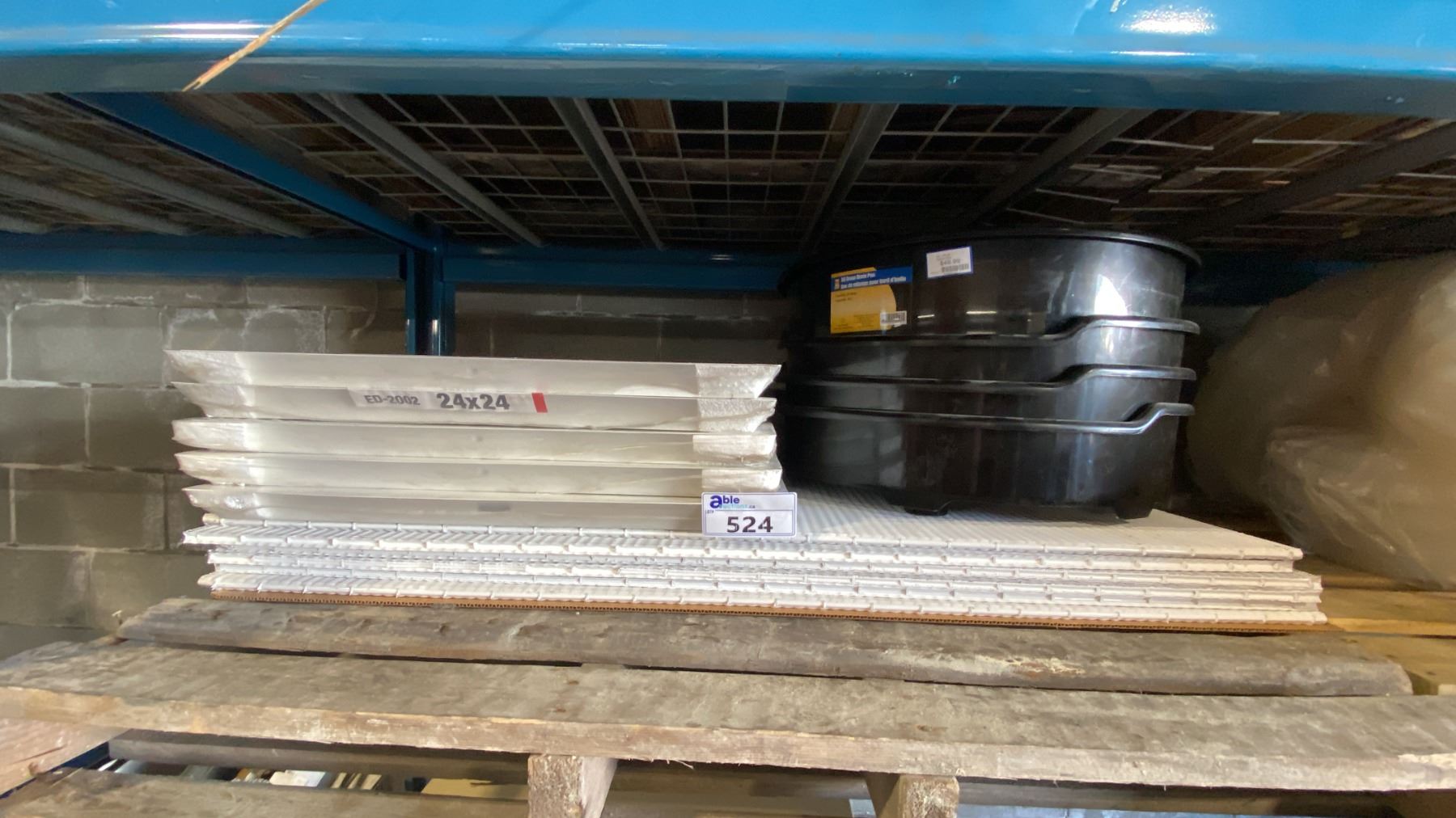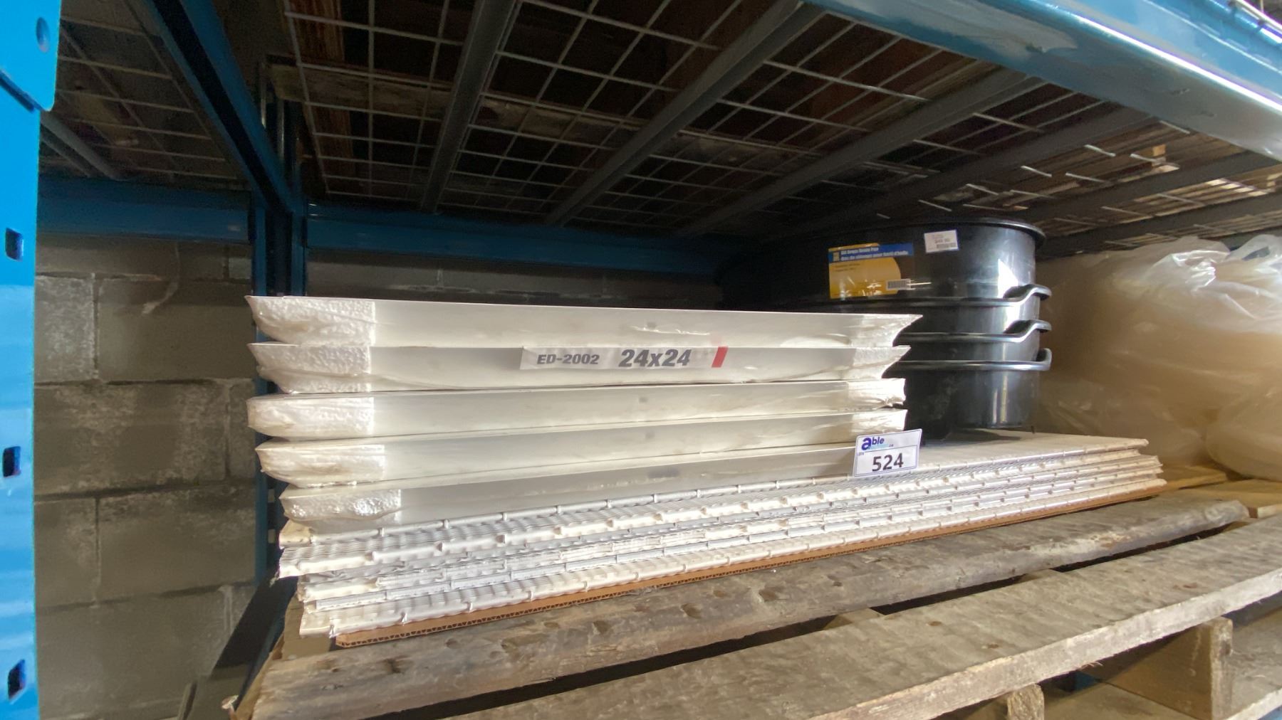 5- 24" X 24" WHITE PLASTIC ACCESS PANELS, 4- 20L POWERFIST OIL DRUM DRAIN PANS & STACK OF METAL VENTING PANELS