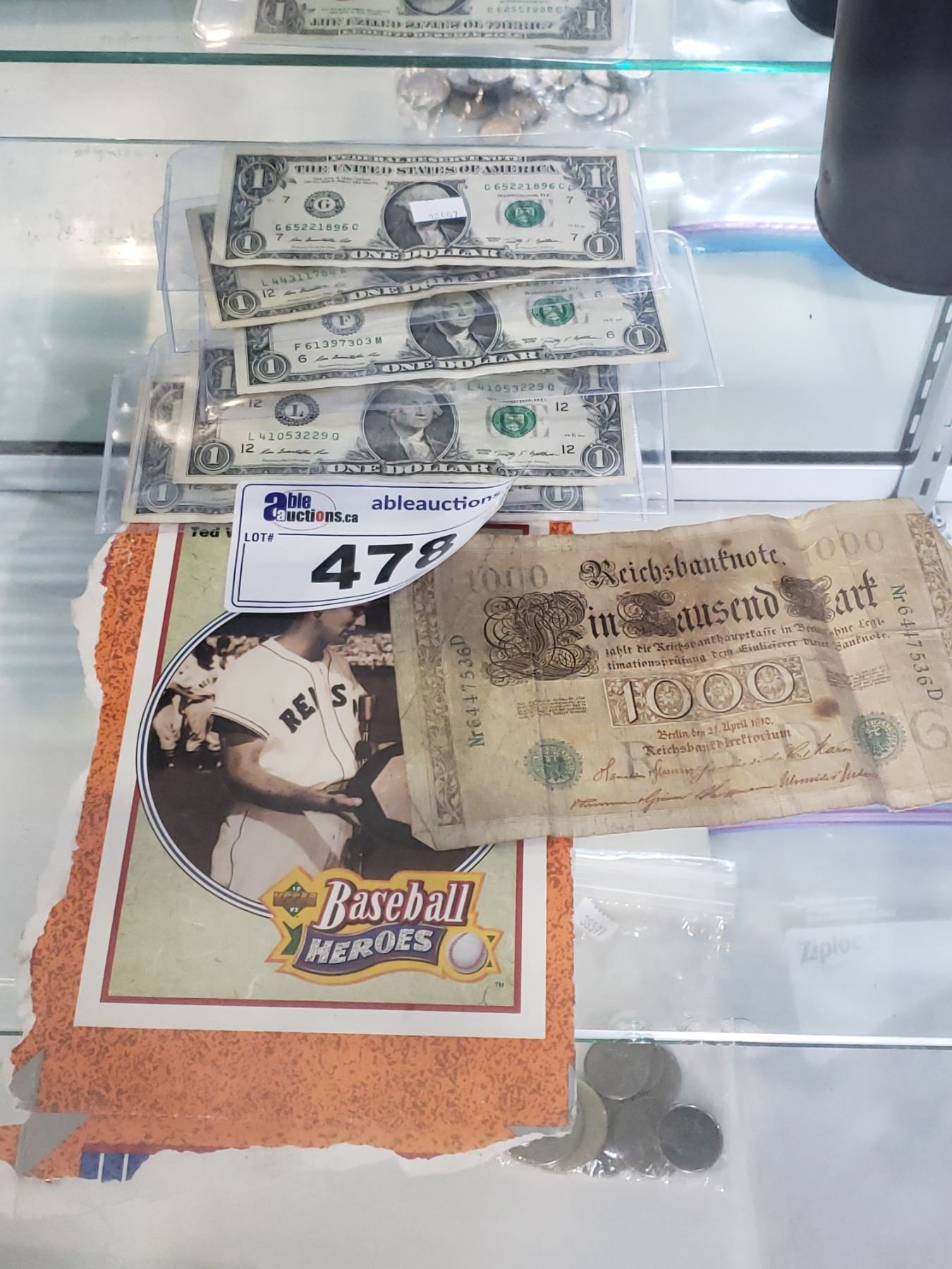 5 AMERICAN $1 BILLS, FOREIGN BANK NOTE AND MORE