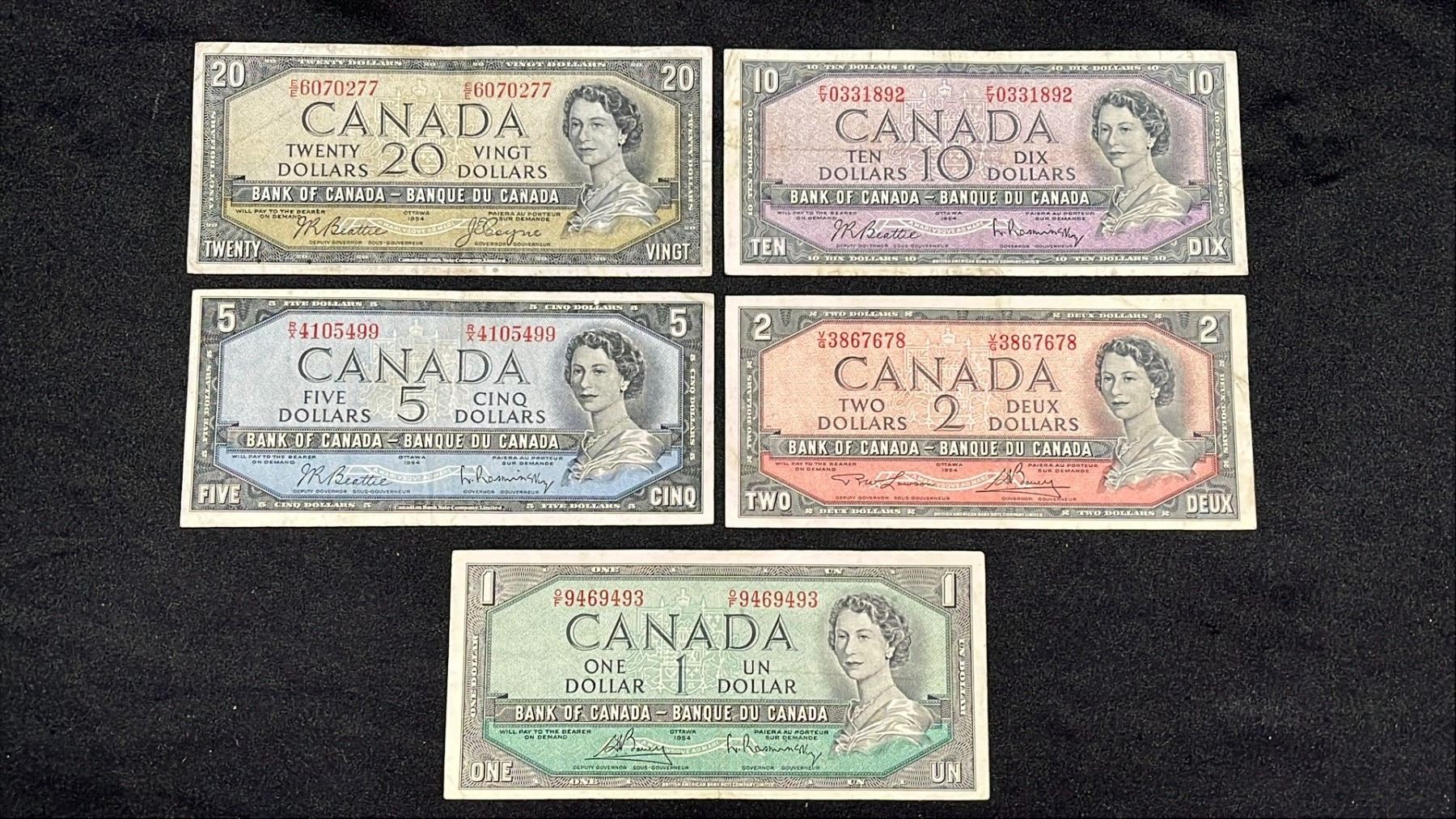 (5) ASSORTED 1954 CANADIAN BANK NOTES INCLUDING; (1 OF EACH) $20, $10, $5, $2 & $1