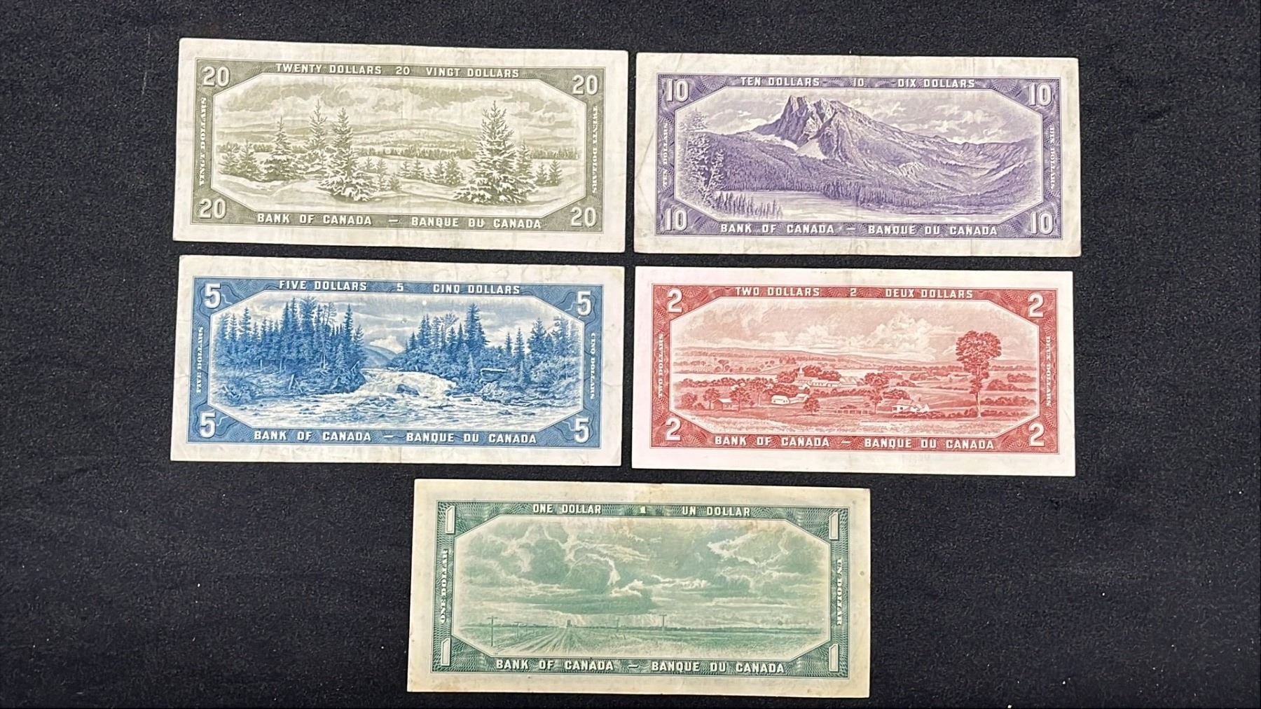 (5) ASSORTED 1954 CANADIAN BANK NOTES INCLUDING; (1 OF EACH) $20, $10, $5, $2 & $1