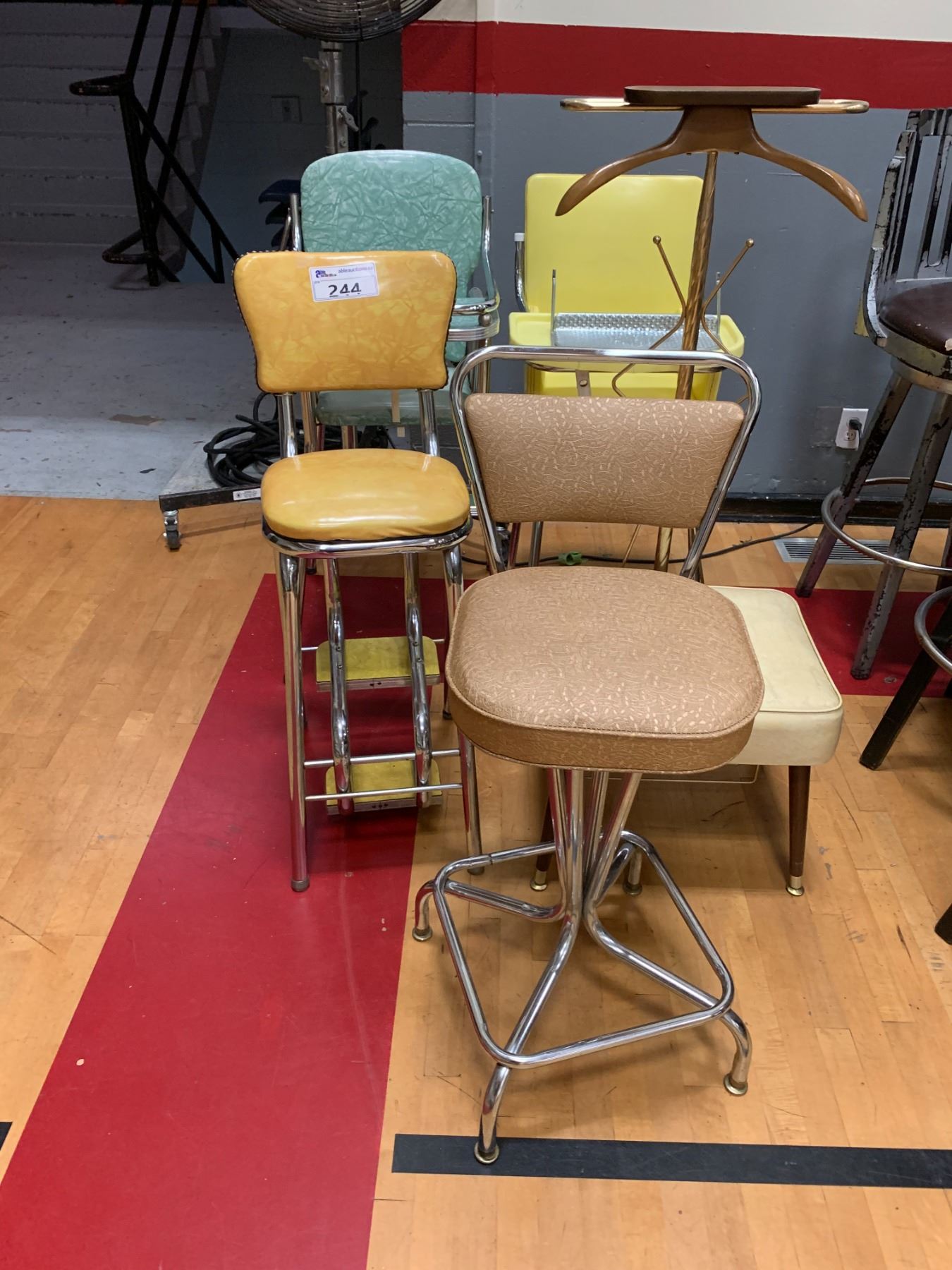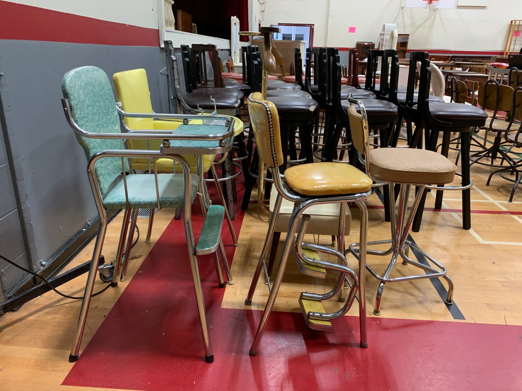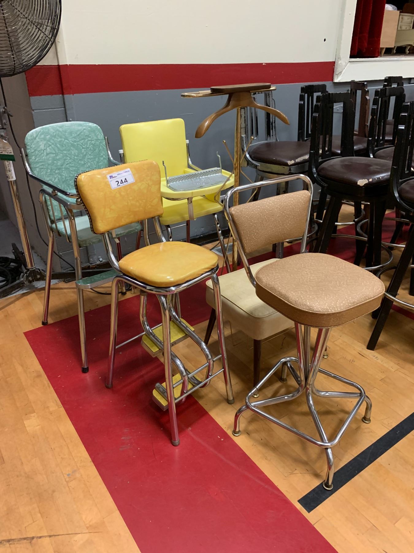 5 ASSORTED CHAIRS INCLUDING; BOOSTER CHAIRS, VINTAGE STOOLS & MORE