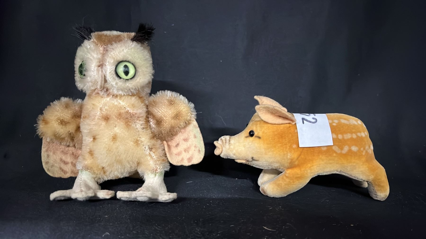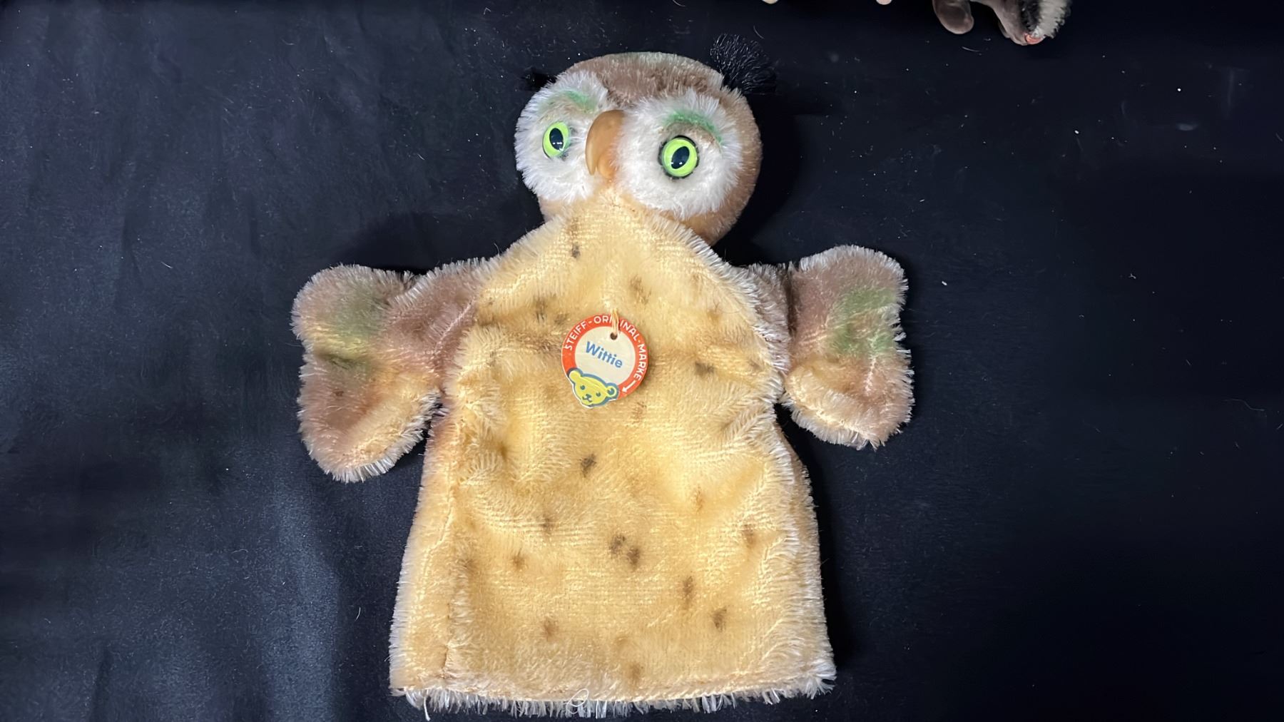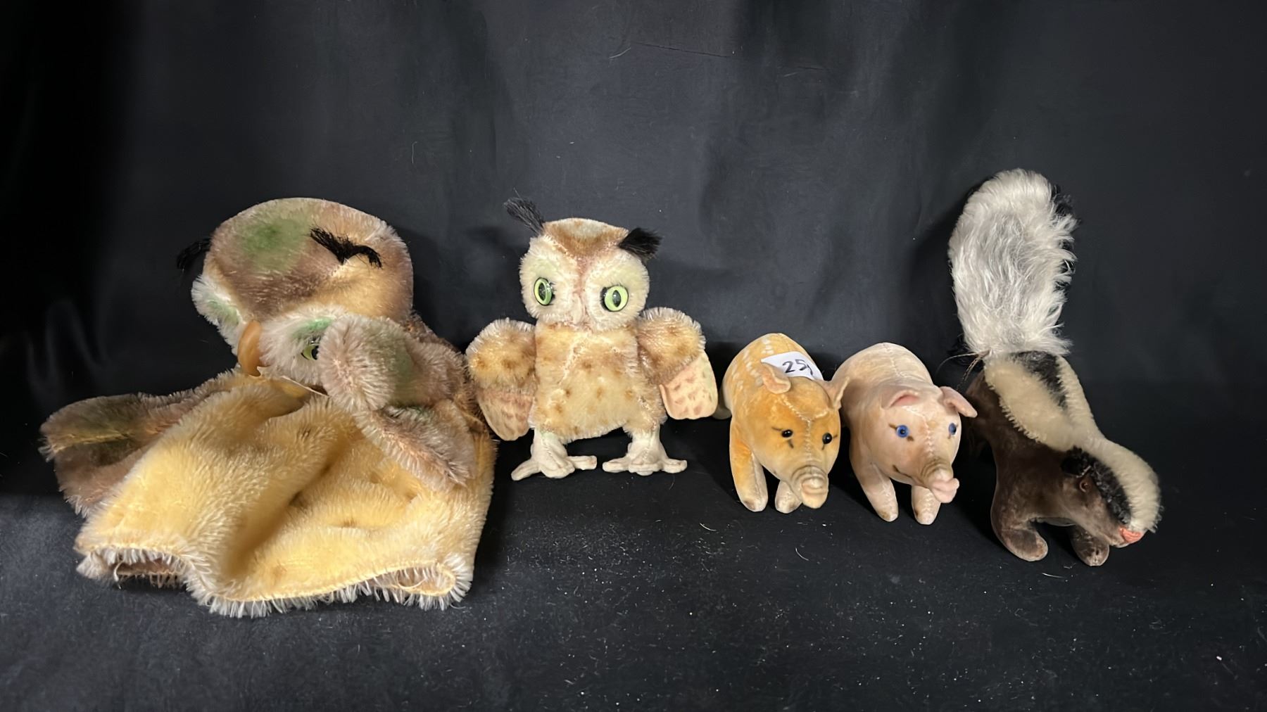 (5) ASSORTED STEIFF STUFFED ANIMALS & OWL PUPPET