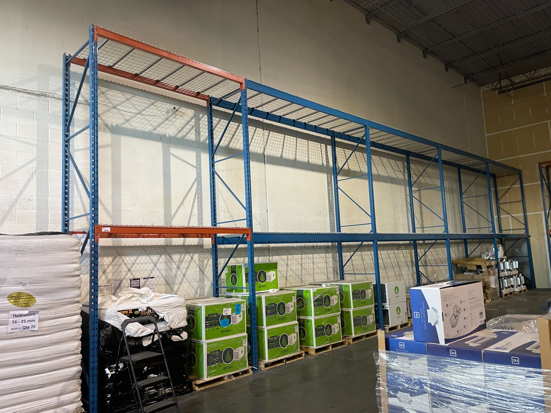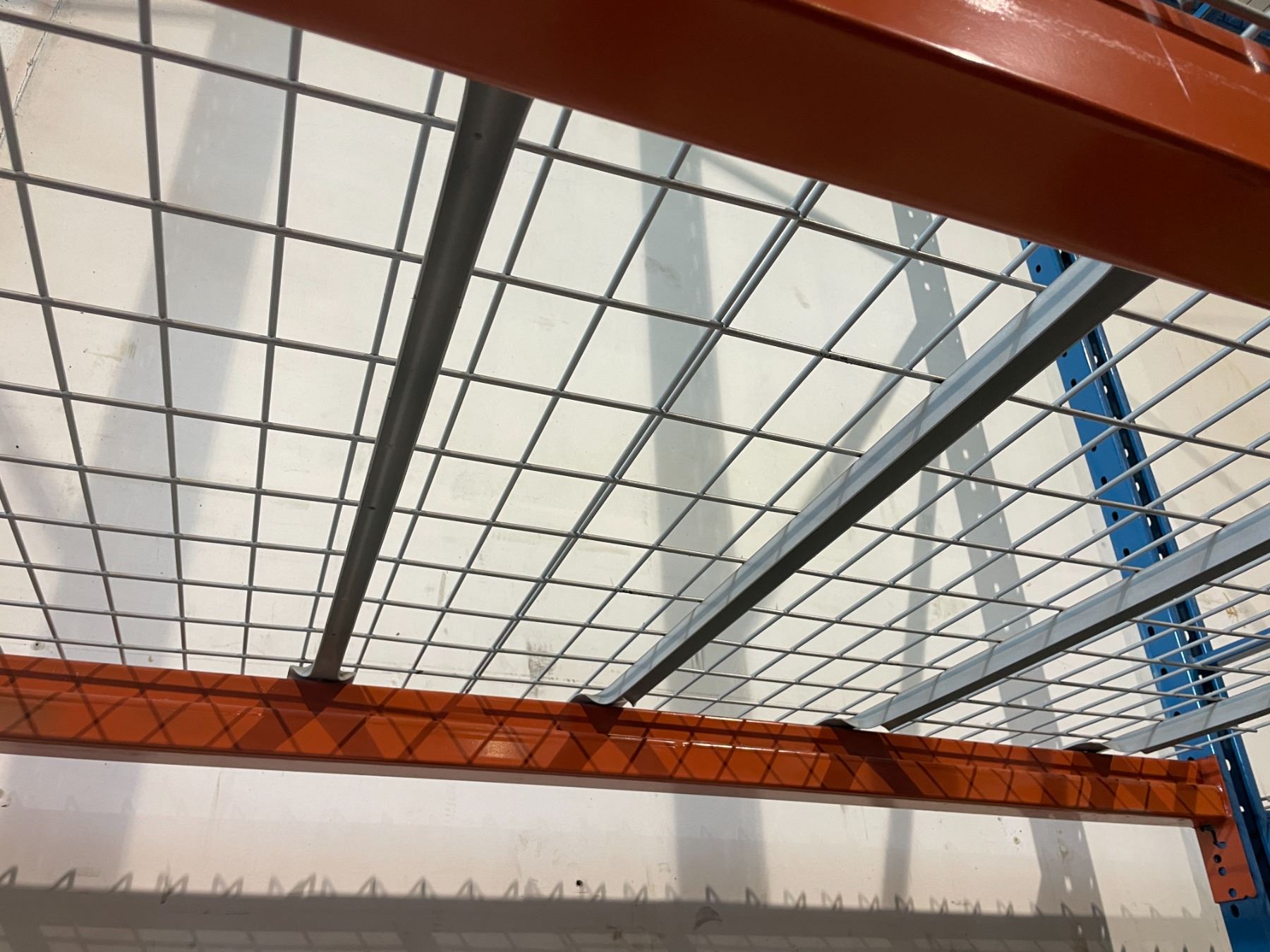 **5 BAYS OF BLUE 19' TALL 12' CROSSBAR 42" DEPTH ADJUSTABLE INDUSTRIAL PALLET RACKING WITH MESH DECKING ( ONE BAY IS 8' CROSSBARS ) *REQUIRES TOOLS AND LADDERS FROM REMOVAL AND HELP - MUST BE DISASSEMBLED*