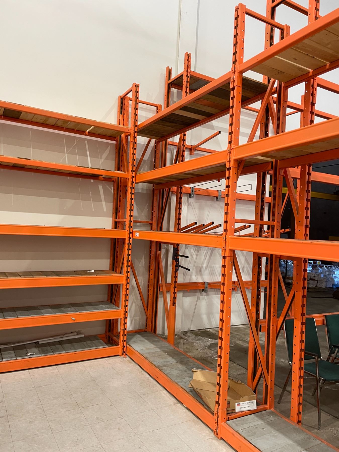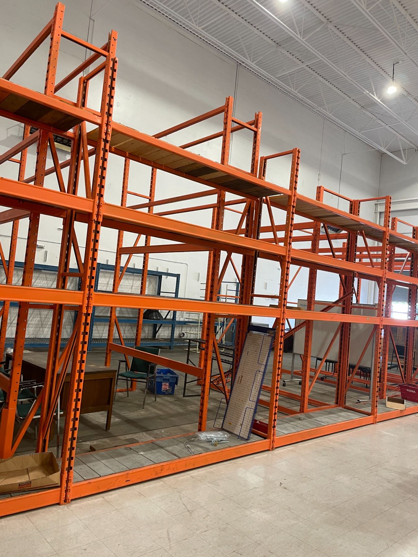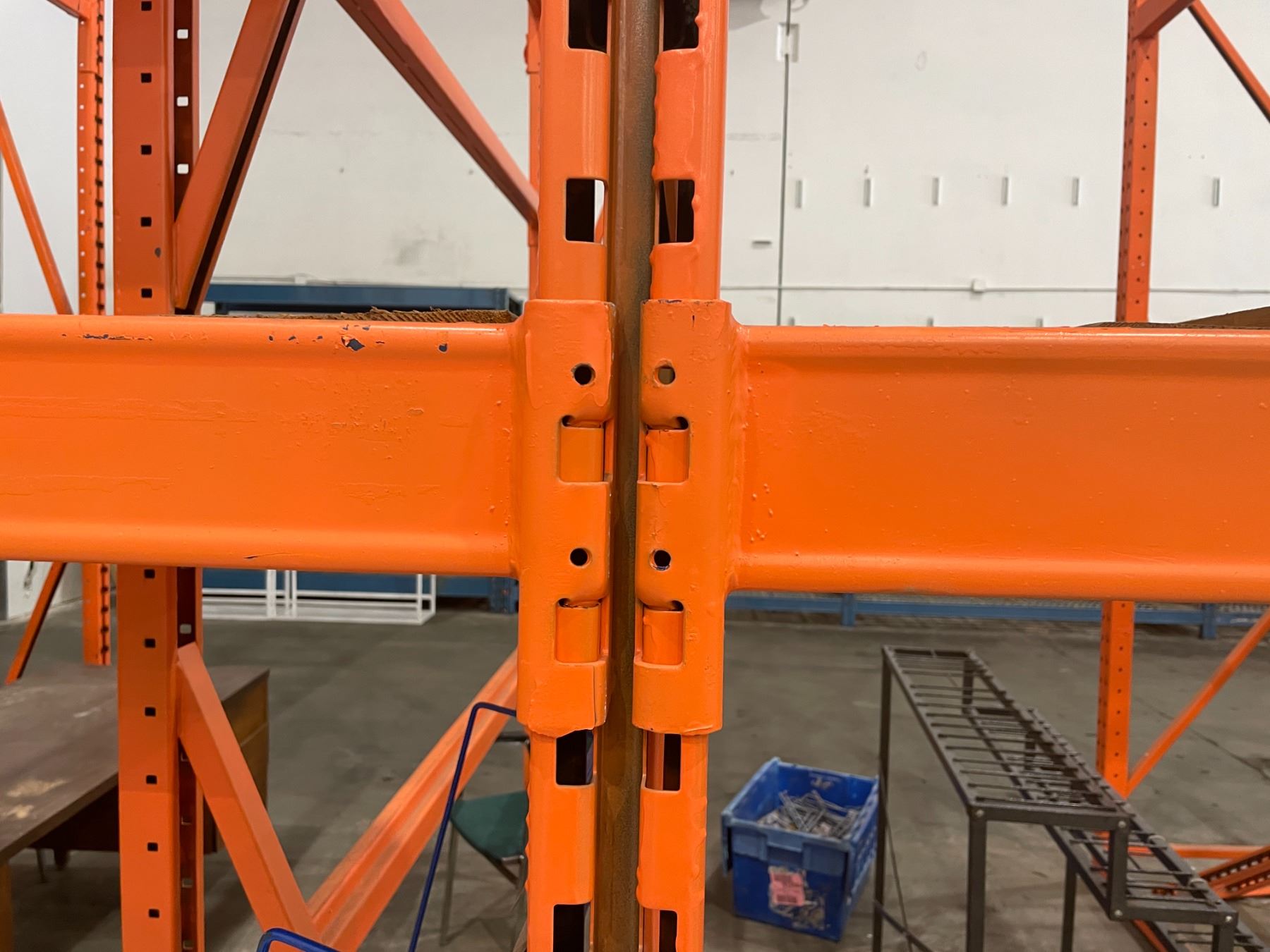 5 BAYS OF ORANGE 12' TALL 24" DEPTH 8' WIDE CROSSBAR ADJUSTABLE INDUSTRIAL PARTS RACKING