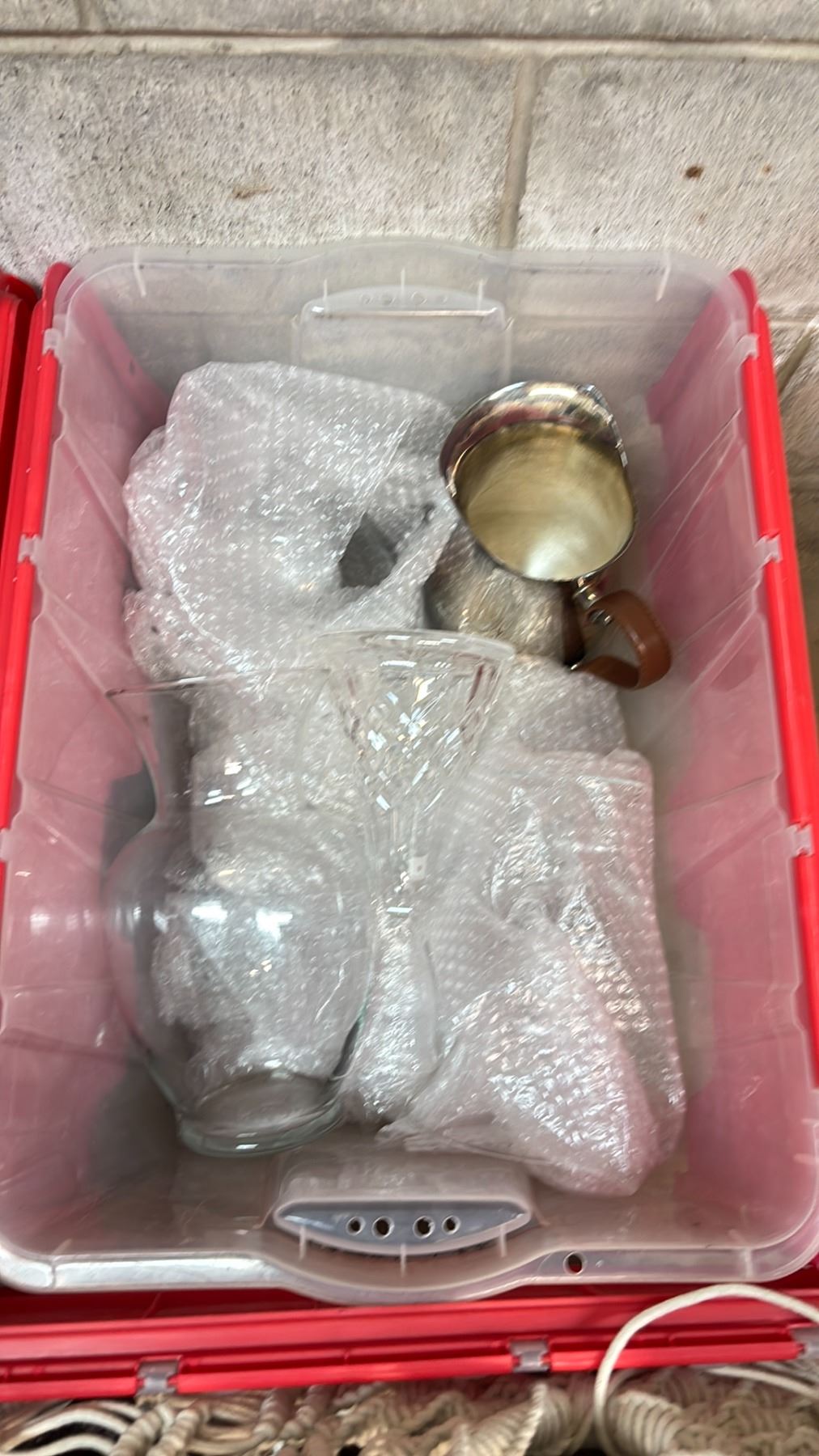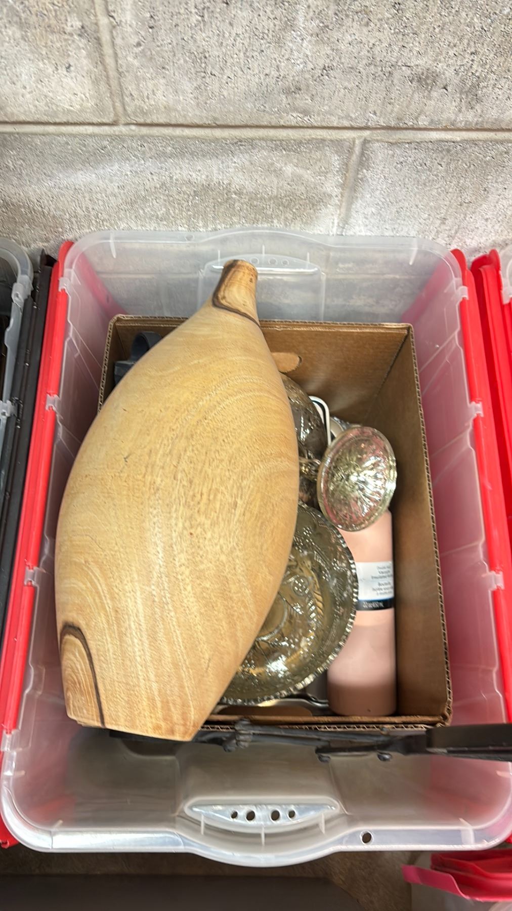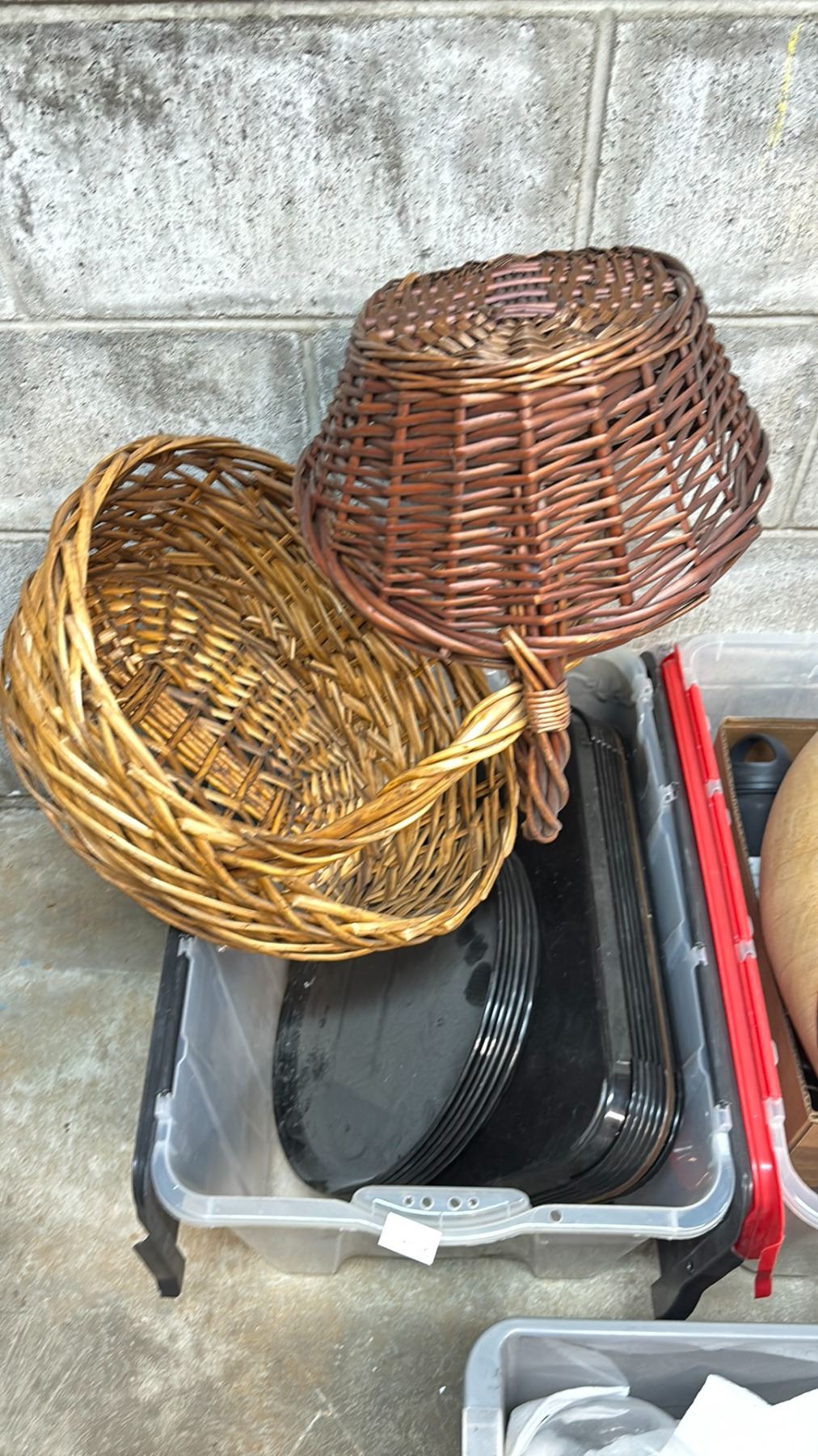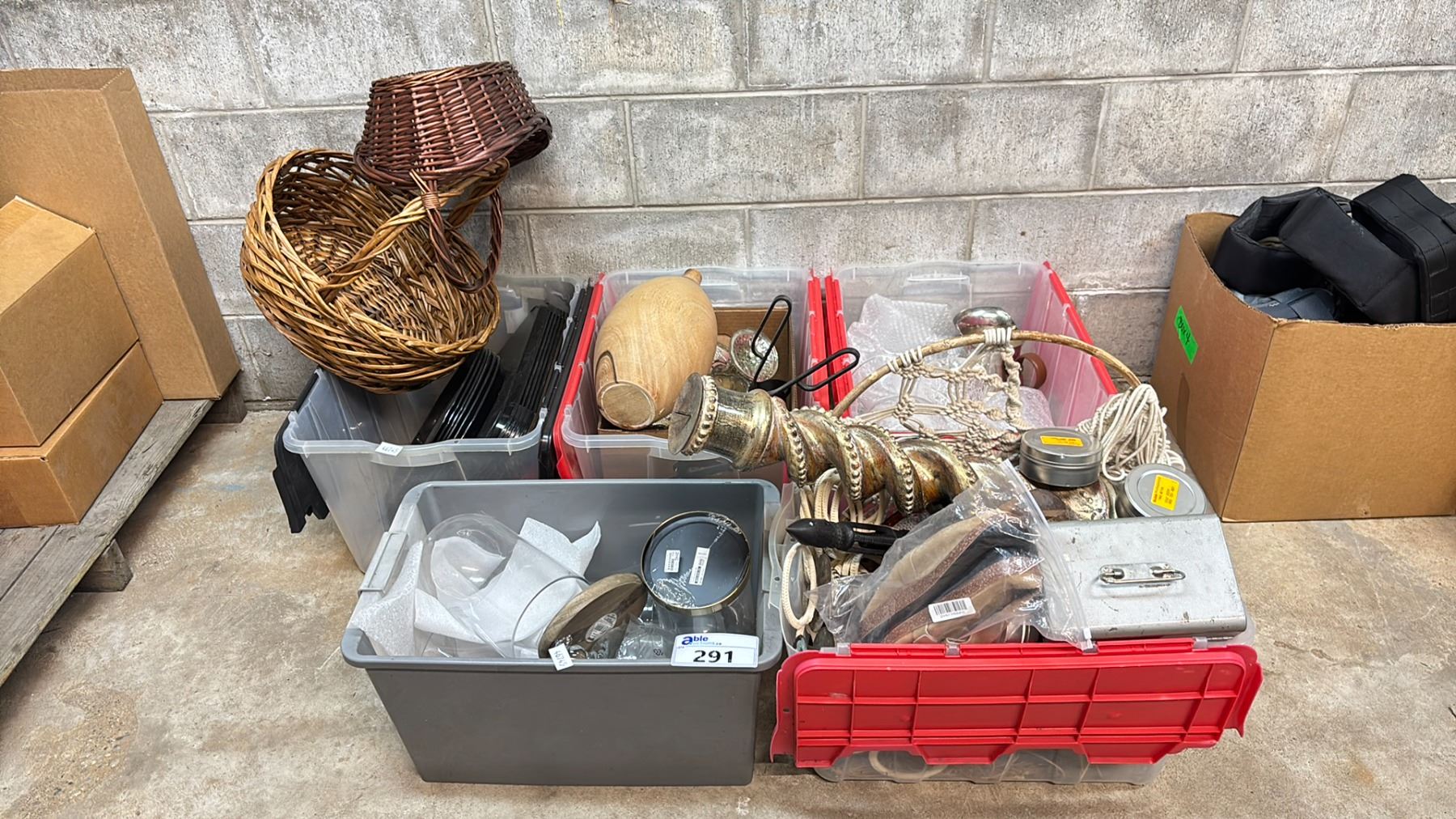 5 BINS OF ASSORTED HOUSEWARE INCLUDING VASES, SERVING TRAYS, BASKETS, DECOR & MORE