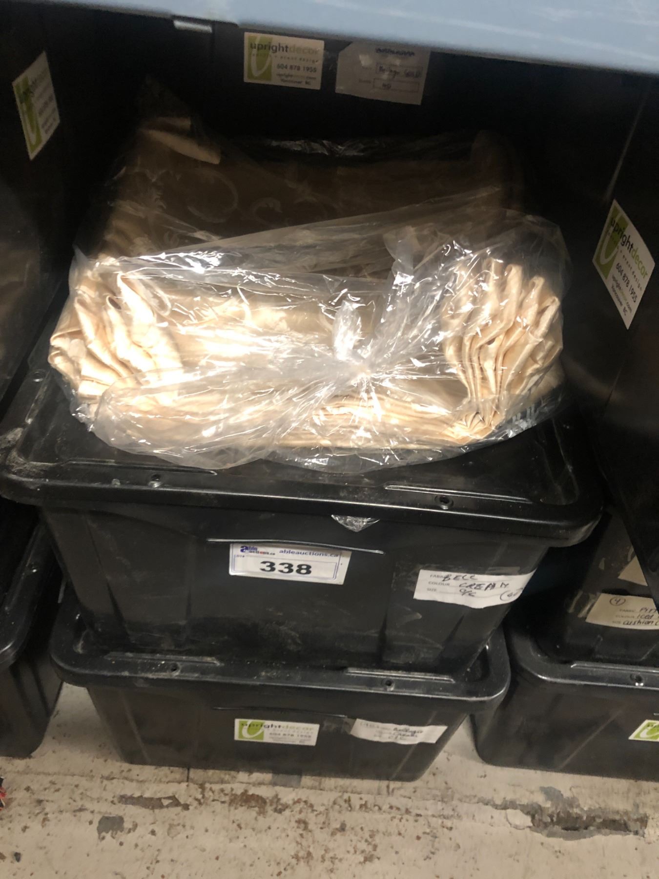 5 BINS OF ASSORTED LINENS, SHAPE/SIZE VARY BETWEEN BINS, COLOURS/PATTERNS INC. CREAM AND MORE