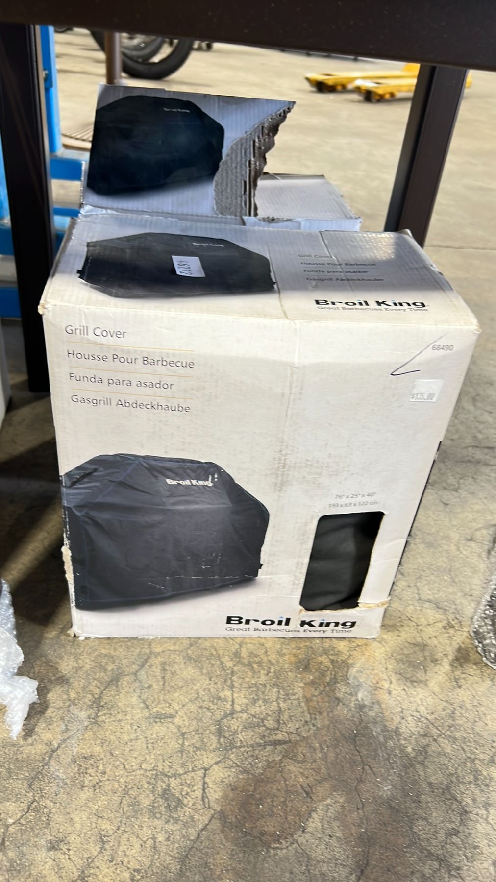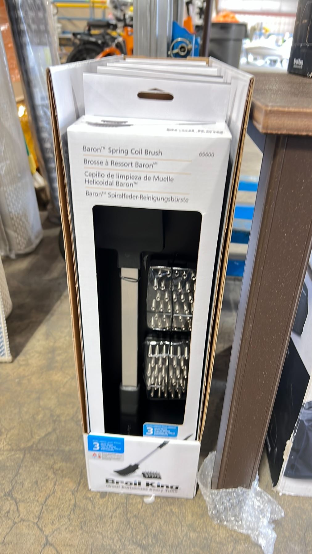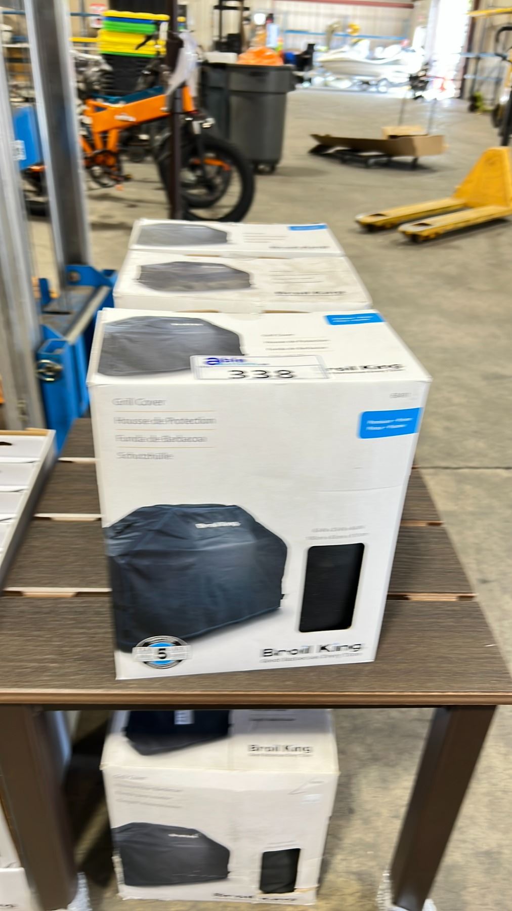 5 BROIL KING PREMIUM GRILL COVERS, 6 BROIL KING SPRING COIL BRUSHES, & BROWN CAST ALUMINUM COMPOSITE TOP OUTDOOR PATIO END TABLE