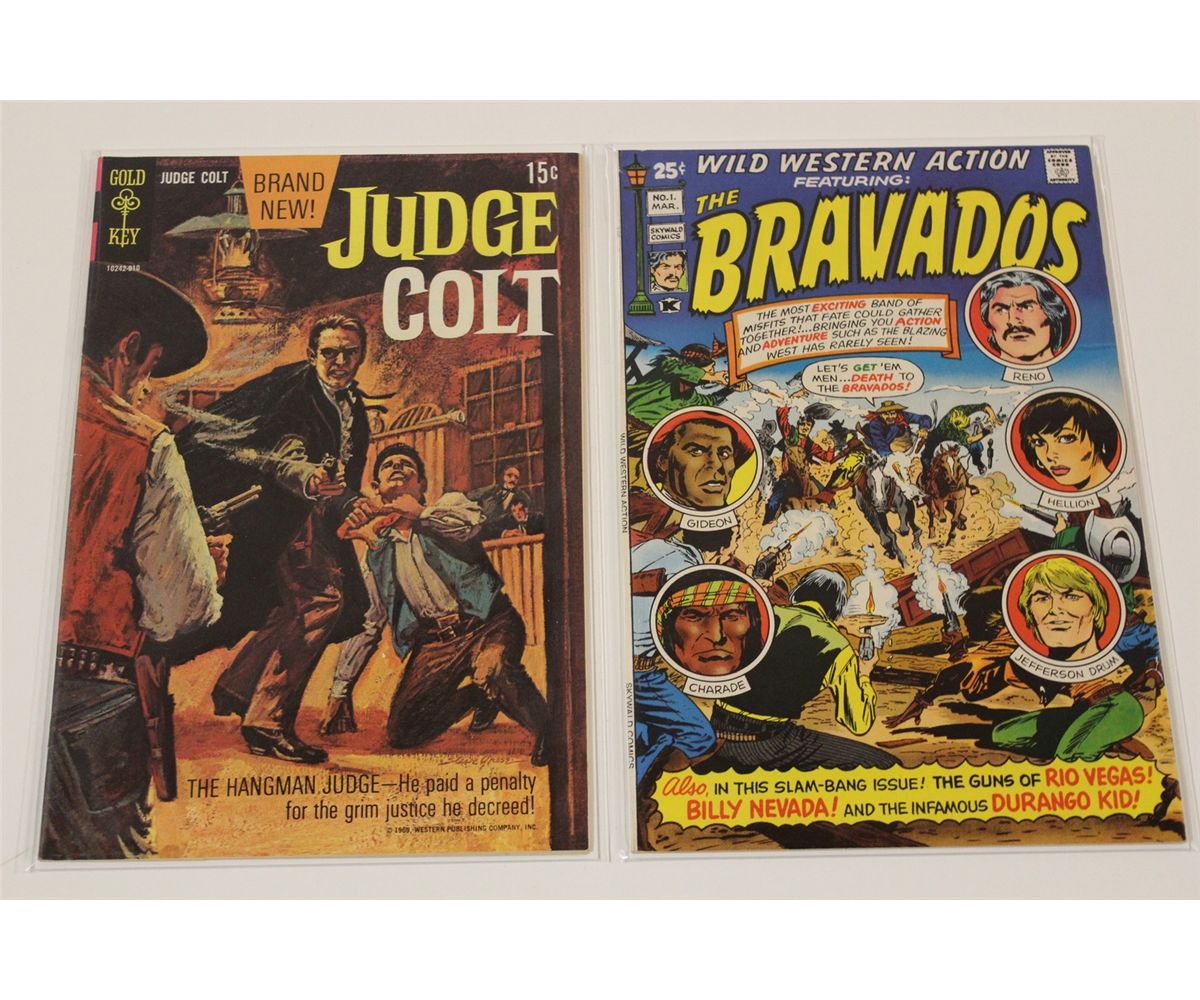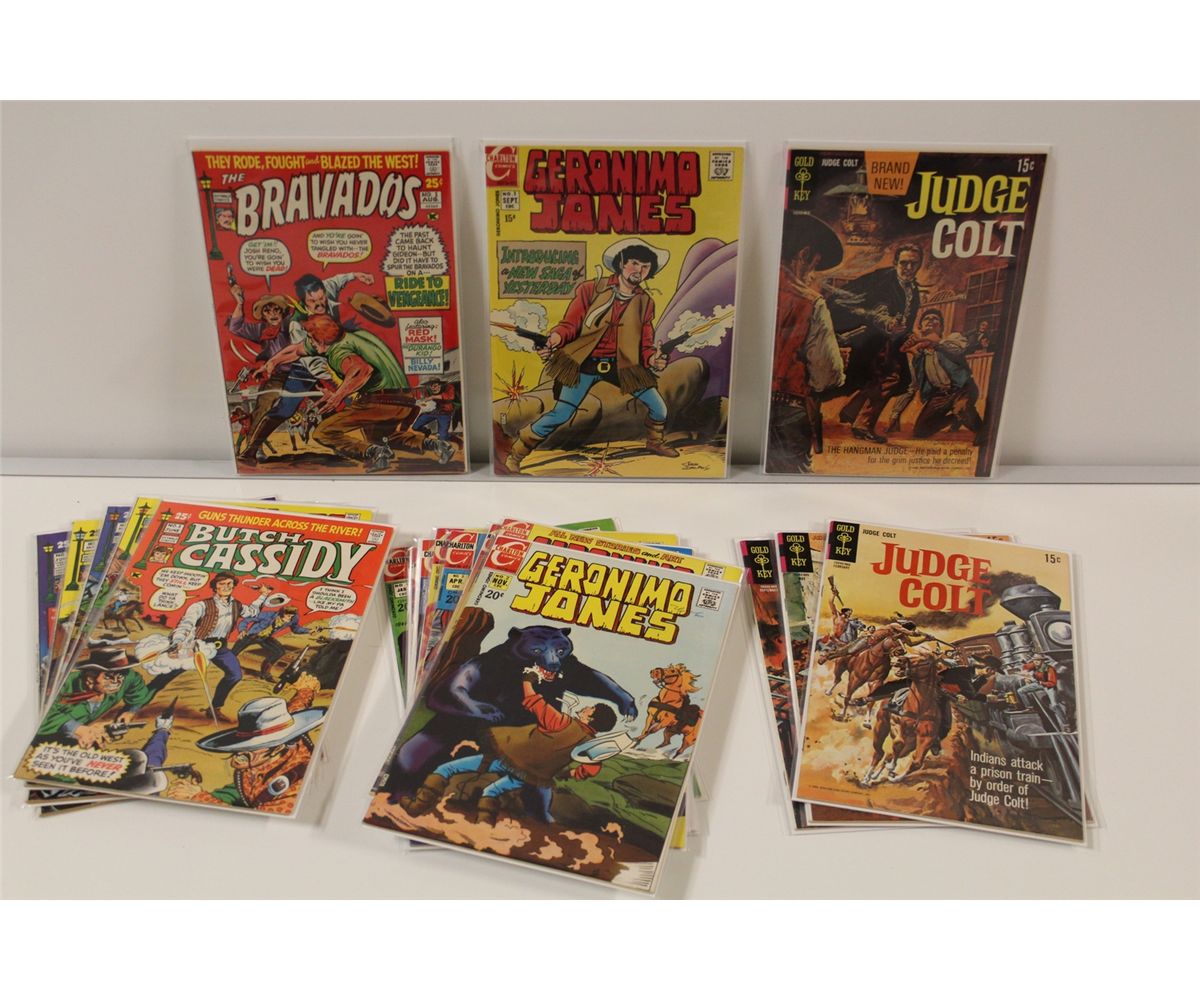 5 BRONZE WESTERN SETS HIGH GRADE (1969-73) INCLUDES BRAVADOS #1, BUTCH CASSIDY #1-2, GERONIMO JONES #1-9, JUDGE COLT #1-4 & WILD WESTERN ACTION #1-3. TOTAL OF 19 BOOKS, THESE ARE HIGH GRADE AVERAGE, SHARP, WHITE, GLOSSY, TIGHT & SUPPLE, HARD TO FIND GENRE BOOKS IN TOP GRADE, BEAUTIFUL COPIES!