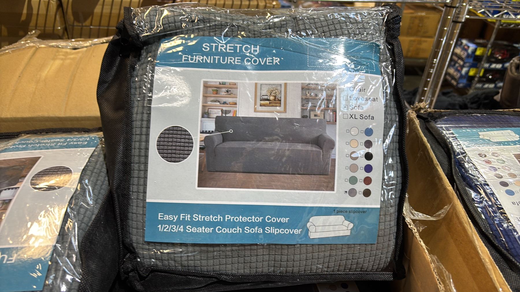 (5) CASES OF DARK GREY STRETCH SOFA COVERS
