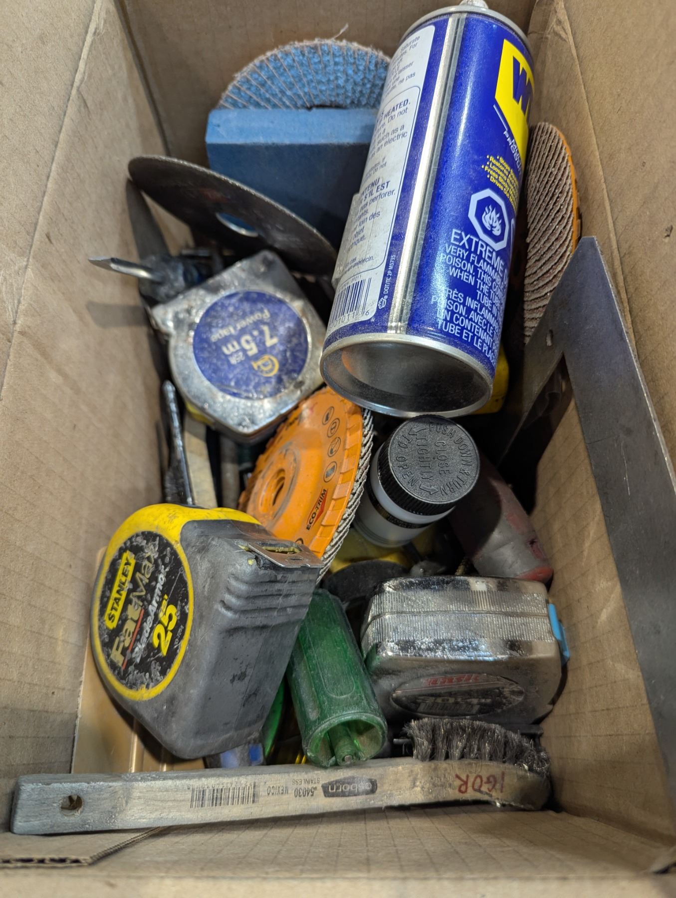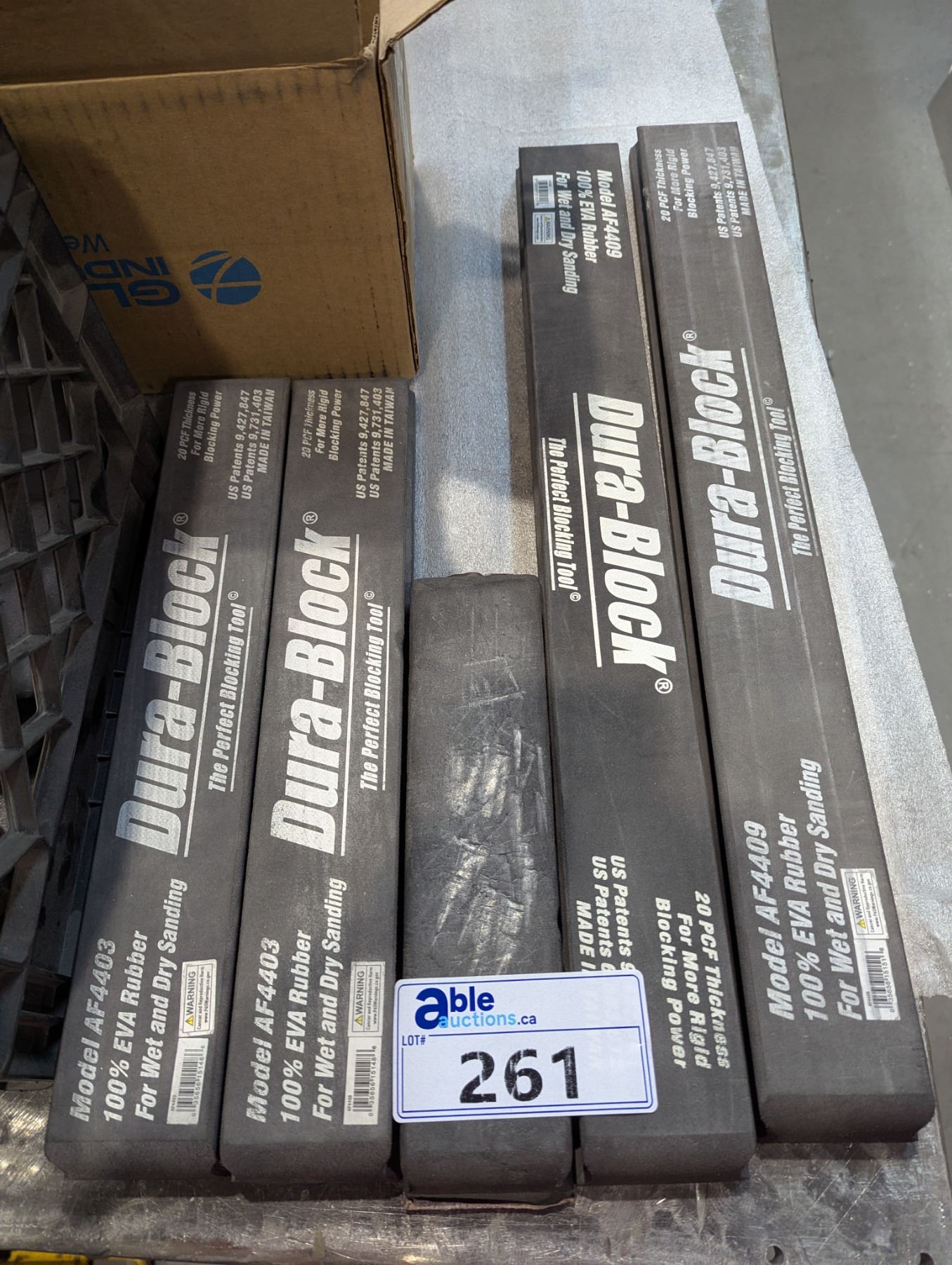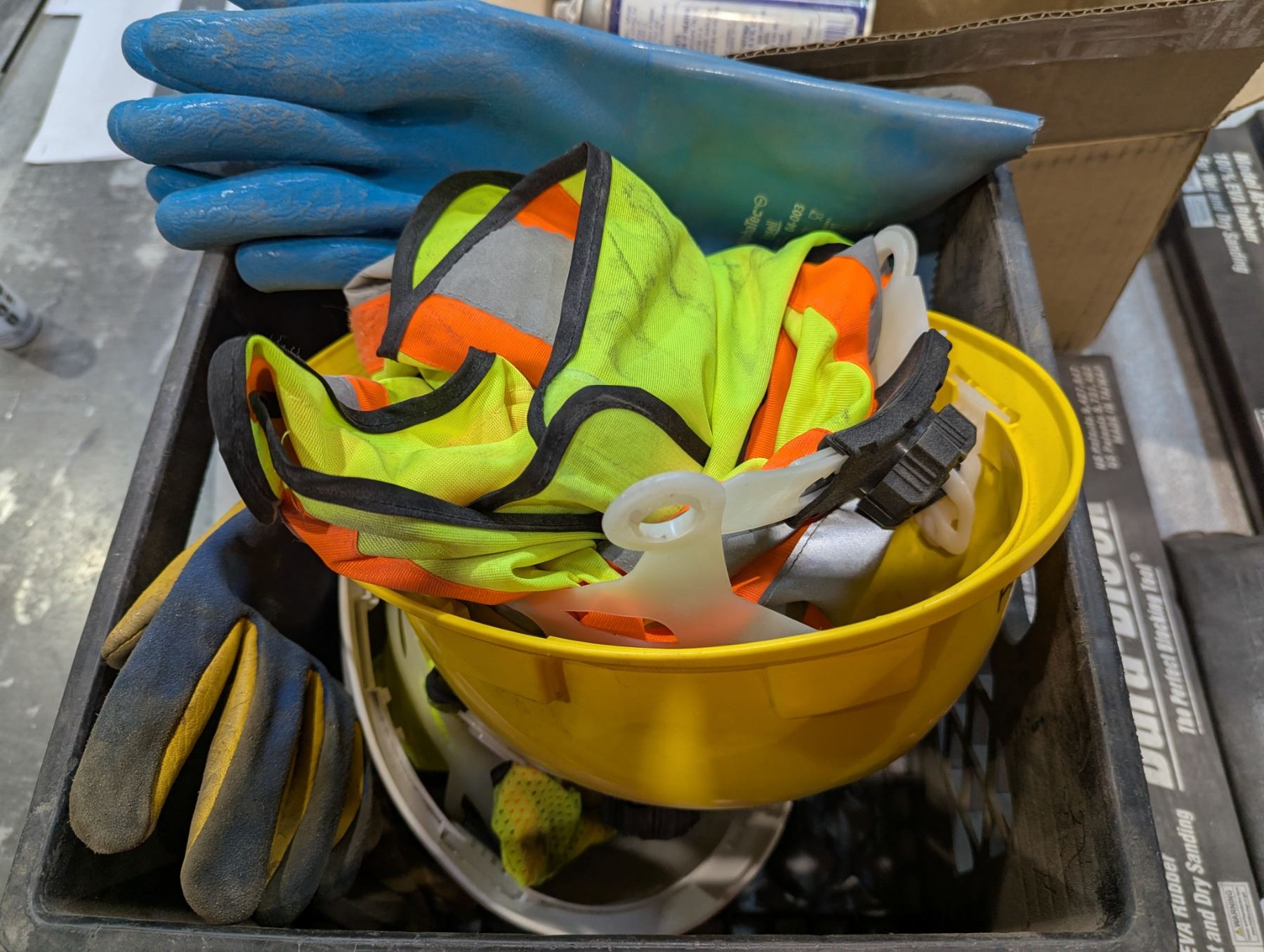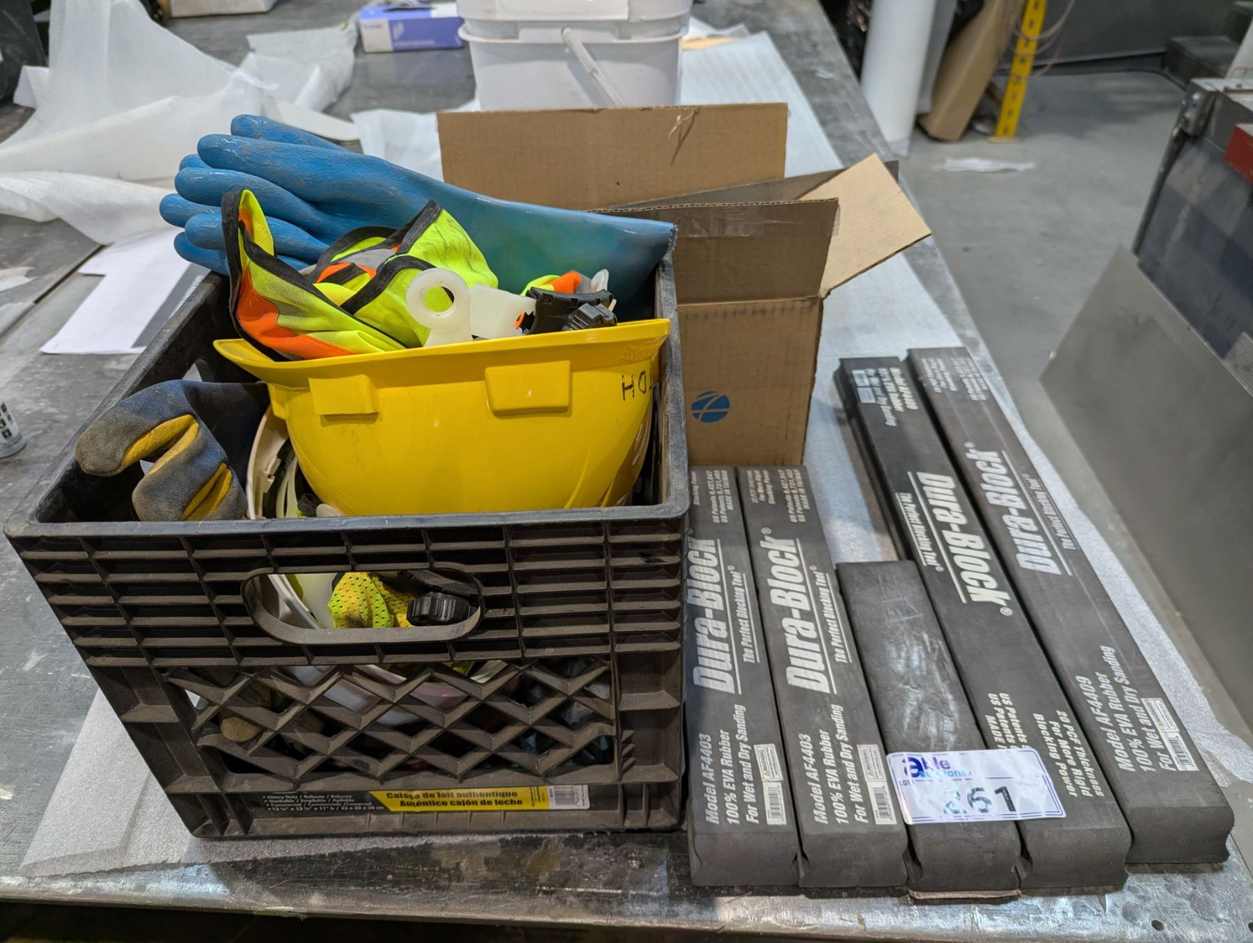 5 DURA-BLOCKS, CRATE WITH HARDHATS, SAFETY VESTS, GLOVES & BOX OF ASSORTED TOOLS & ACCESSORIES