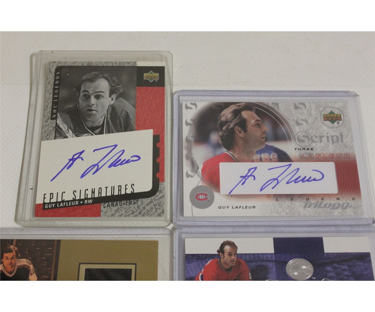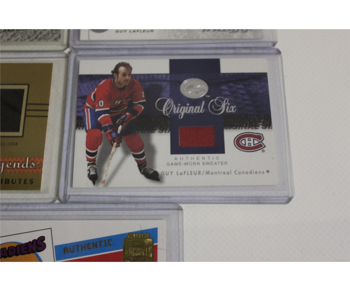 5 GUY LAFLEUR CARDS - 2 AUTOGRAPHED;2 GAME-WORN SWEATERS; 1 MONTREAL FORUM SEAT