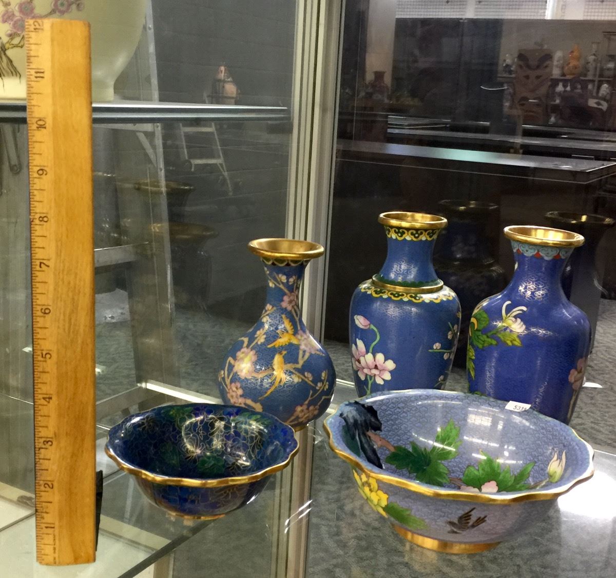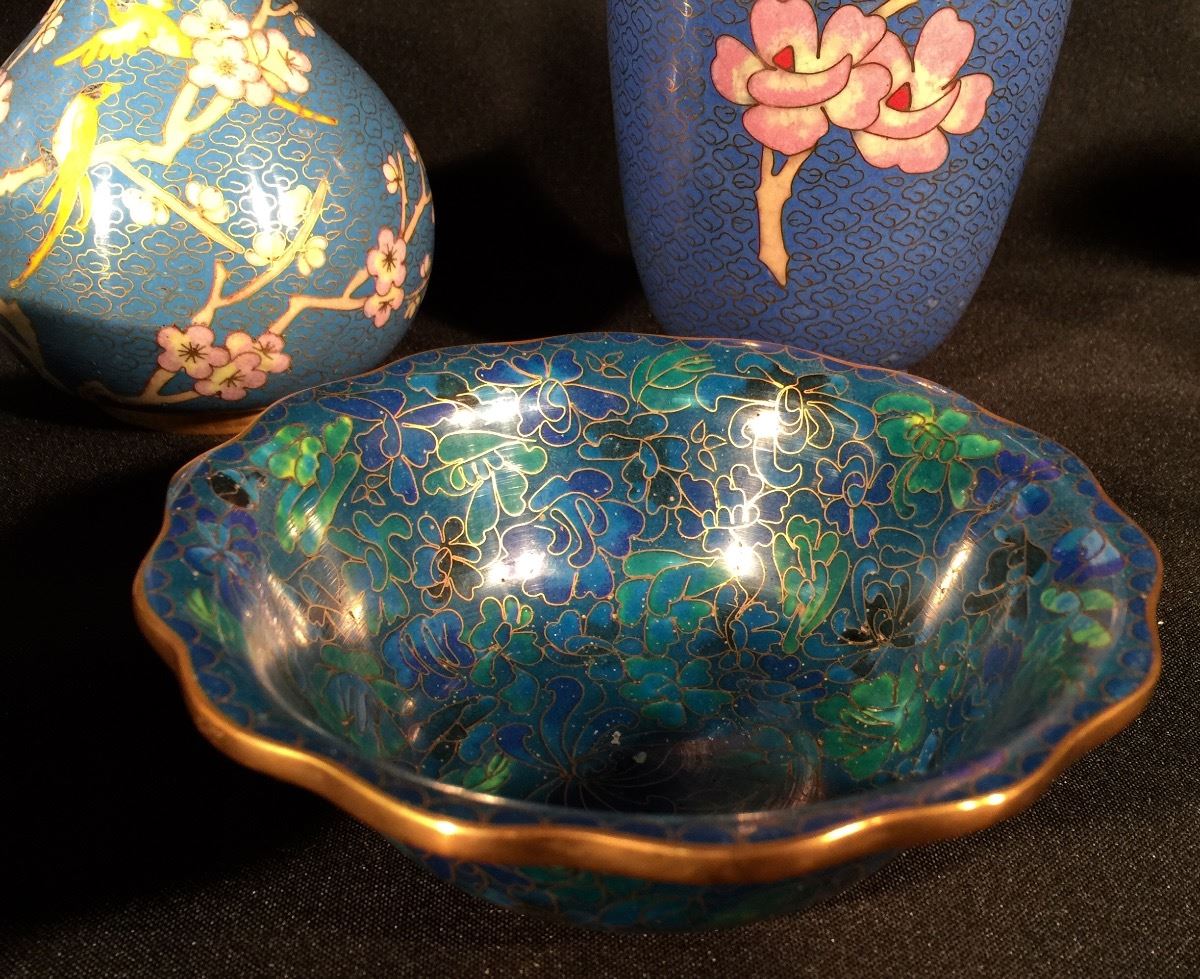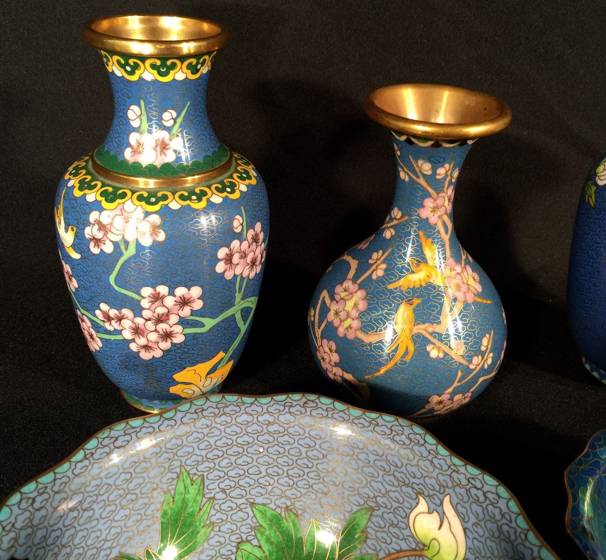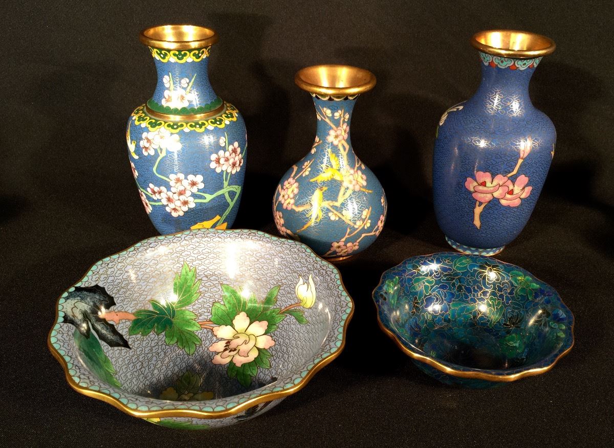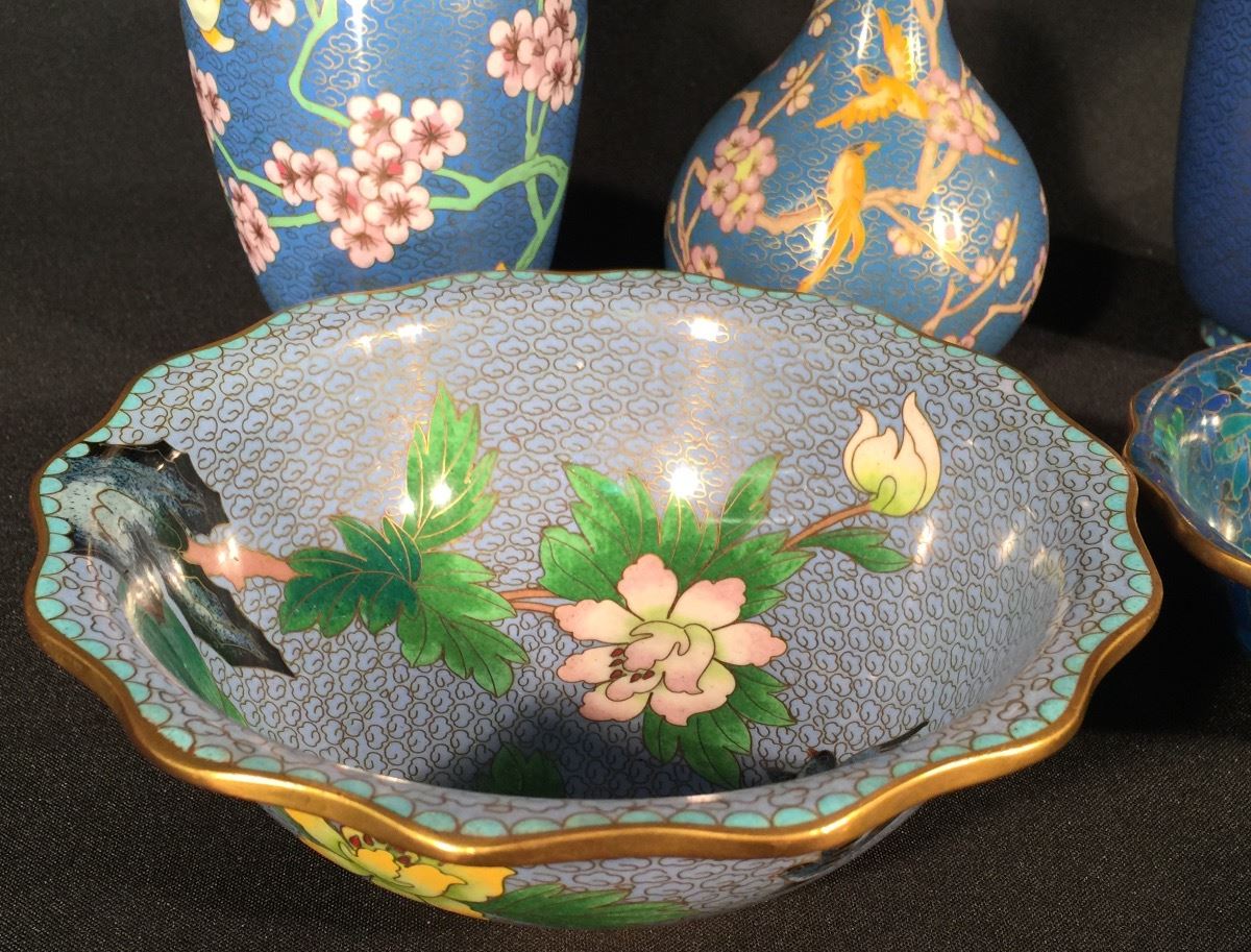 5 HAND DECORATED CHINESE CLOISONNE VASES AND BOWLS, LIGHT BLUE THEME
