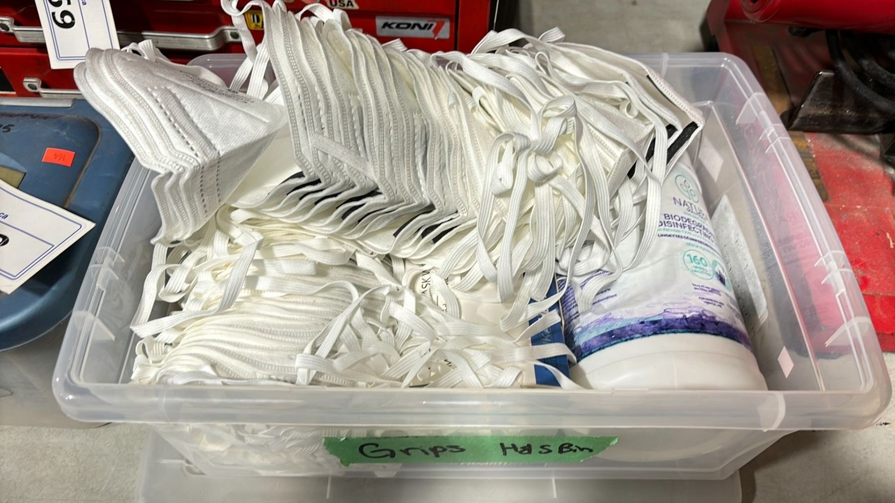 5 HELICOIL PROFESSIONAL THREAD REPAIR KITS IN HARD TRANSPORT CASES ; 1/2-13, 3/8-16, 5/16-18, 5/16-18, M10/1.5, PLASTIC TOTE WITH A GRIP NET, A BIN OF N95 MASKS & DISINFECTING WIPES