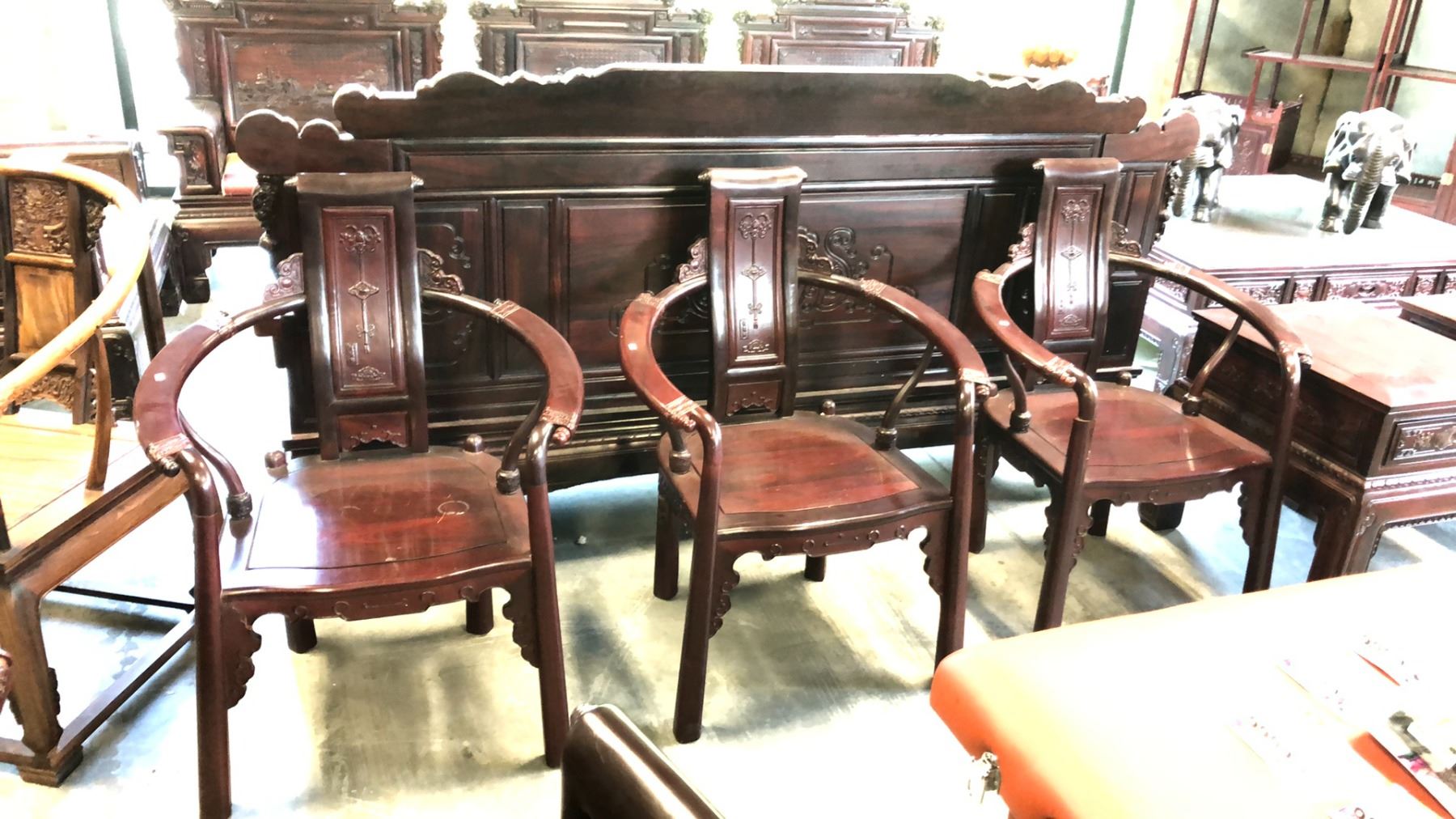 5 MAHOGANY FINISH ARMCHAIRS (DAMAGE TO 2)