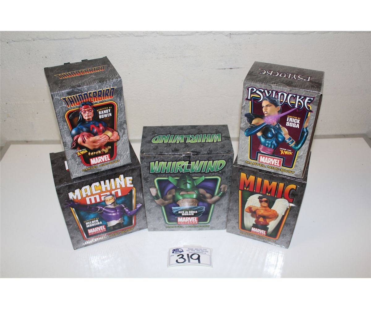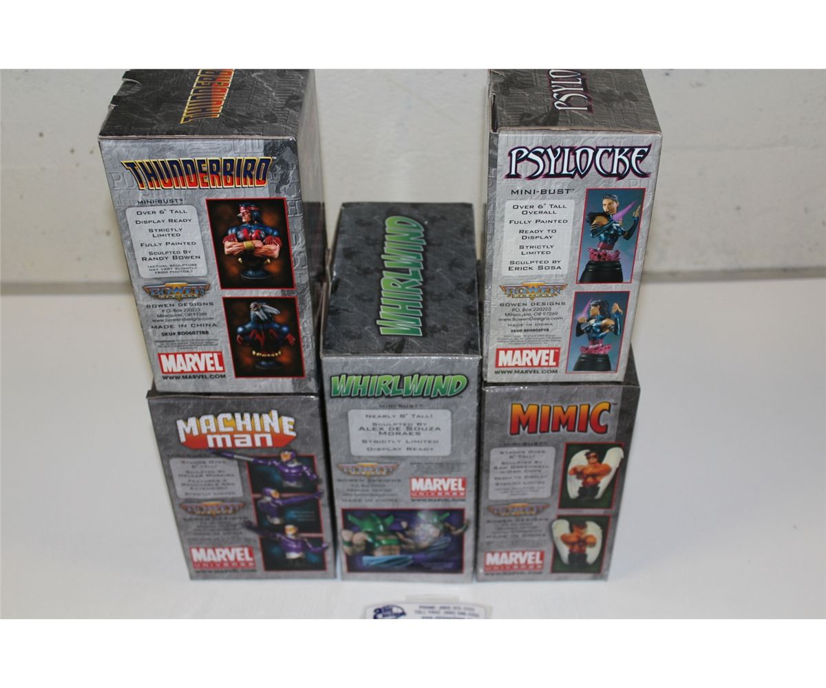 5 MARVEL MINI BUSTS, NEW IN BOX INCLUDING: THUNDERBIRD 1397/1950, MIMIC 1073/1500, PSYLOCKE 1611/1500, MACHINE MAN 906/1500 AND WHIRLWIND 745/1000