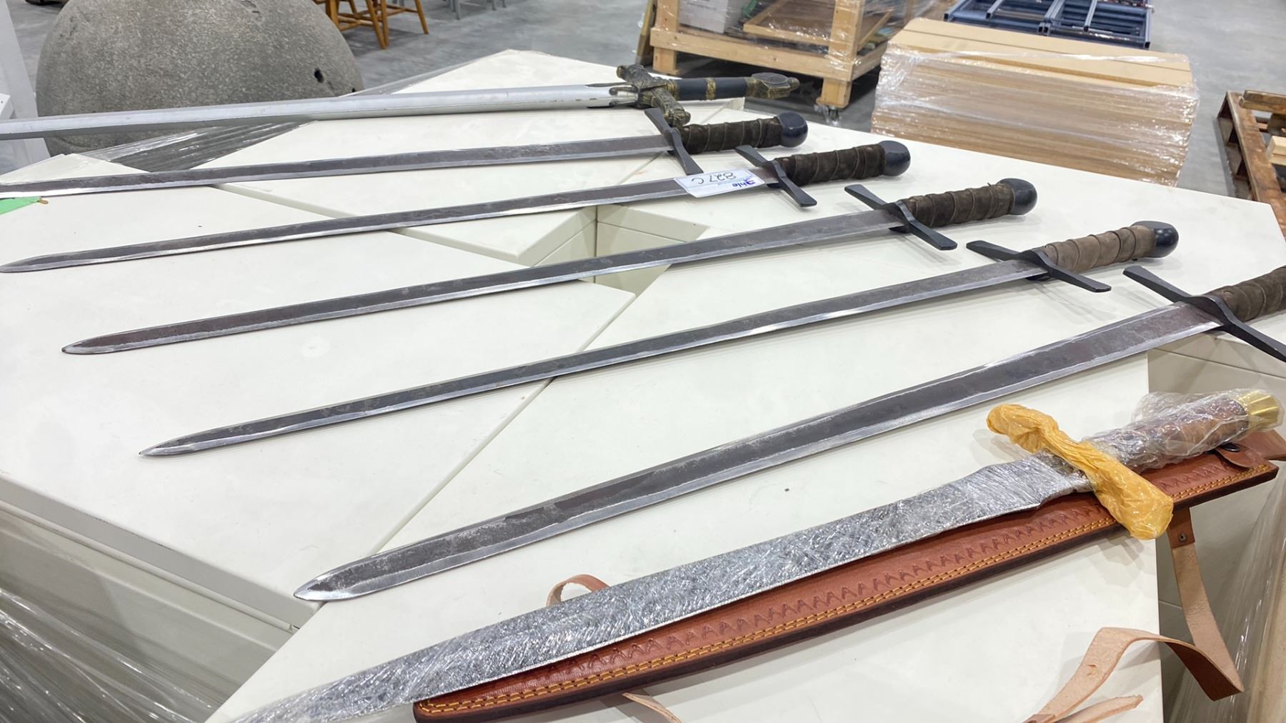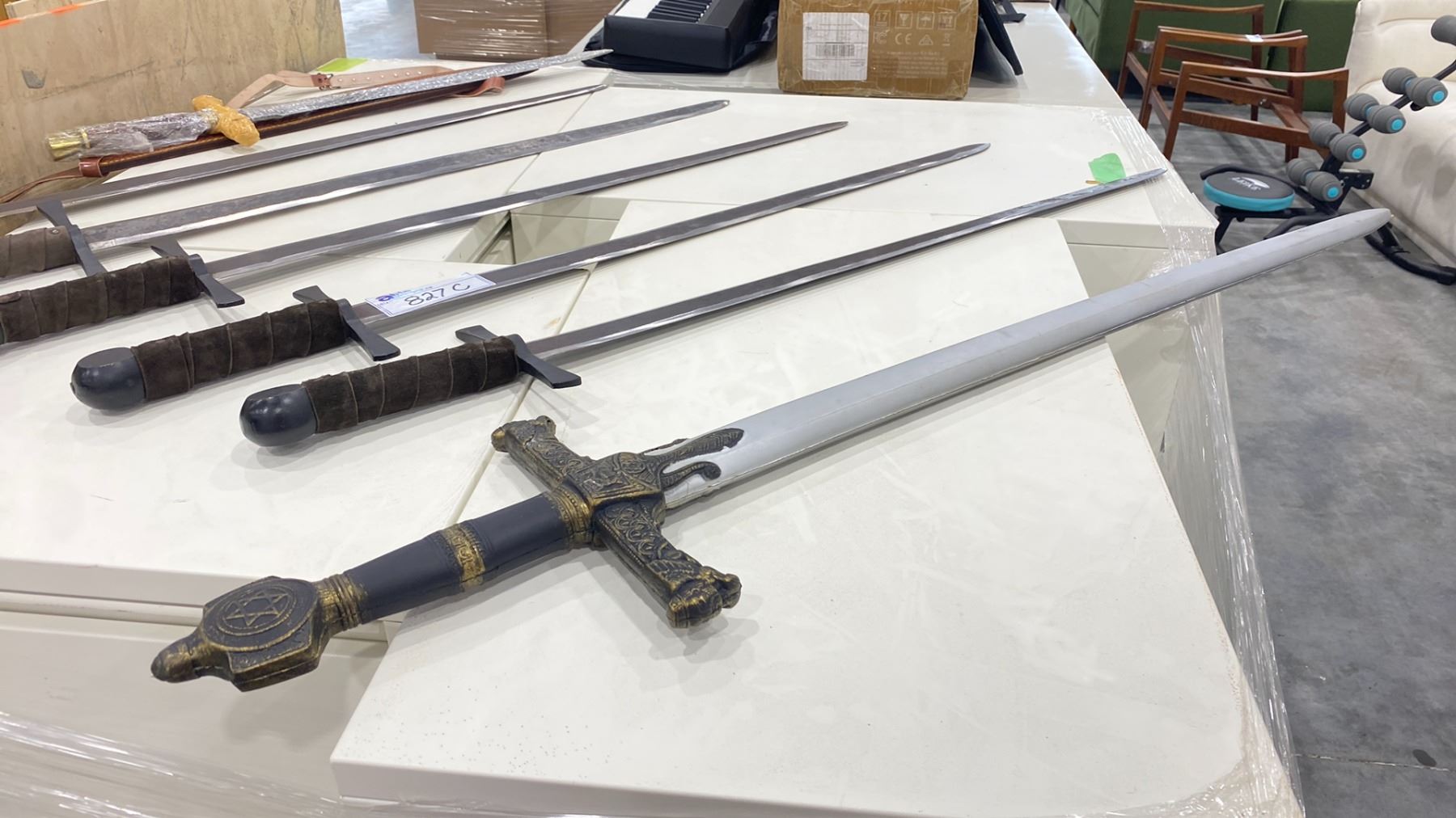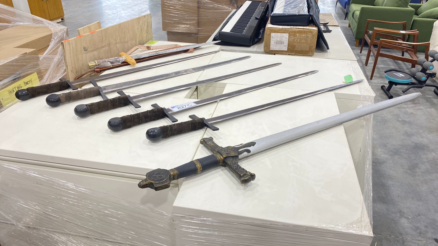 (5 )METAL PROP SWORDS, (1) RUBBER PROP SWORD AND ONE REAL SHORT SWORD WITH SHEATH