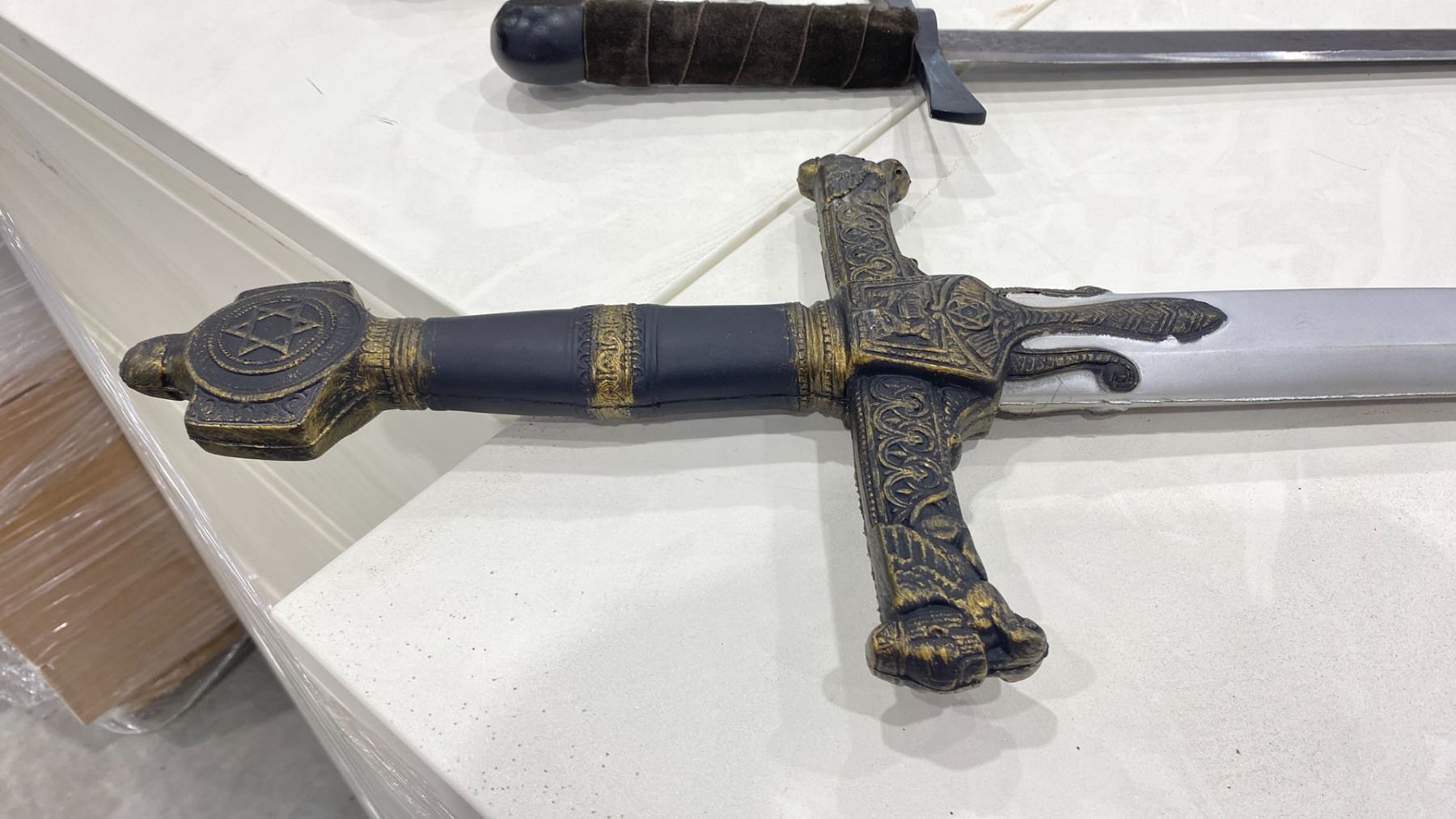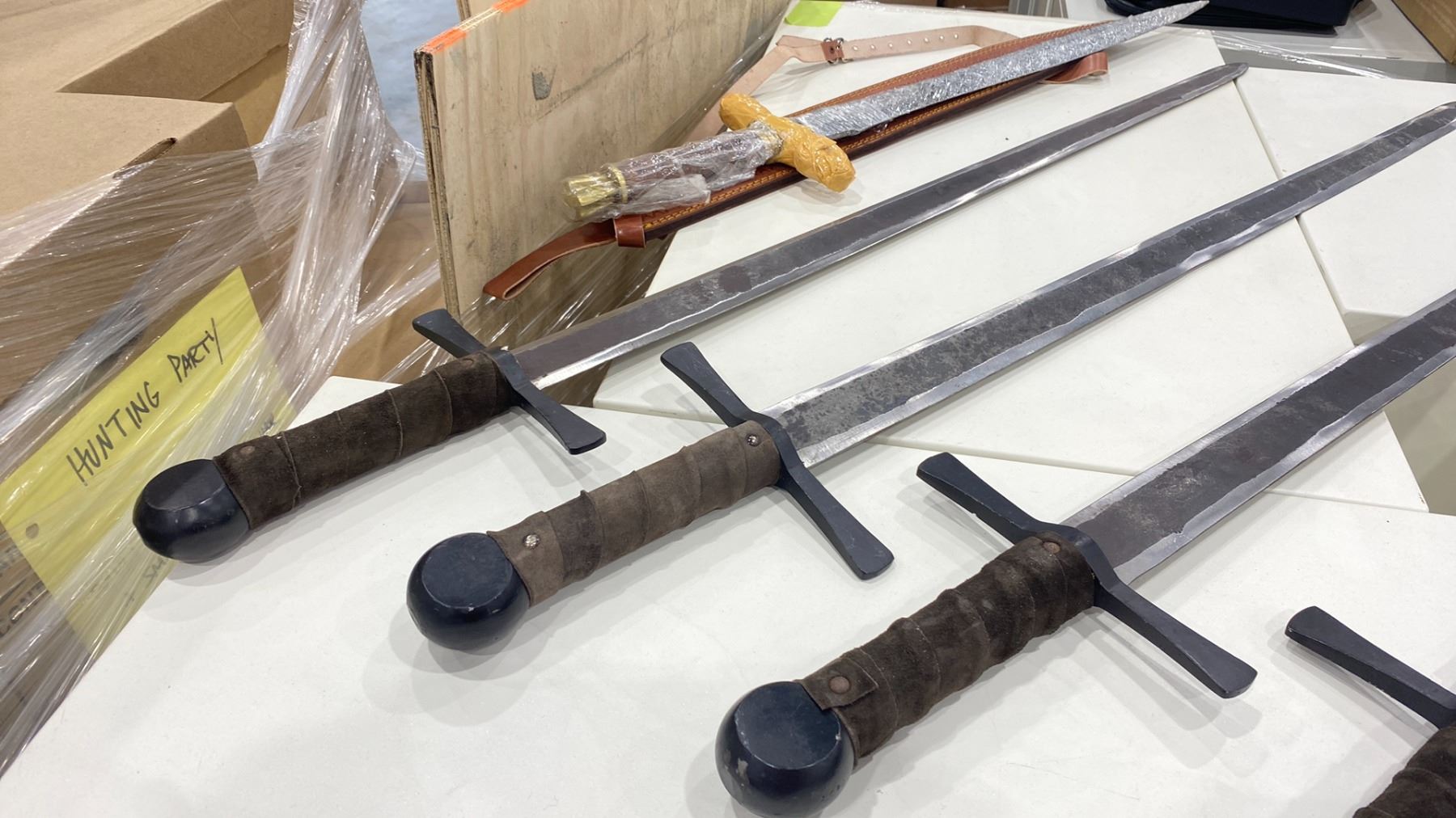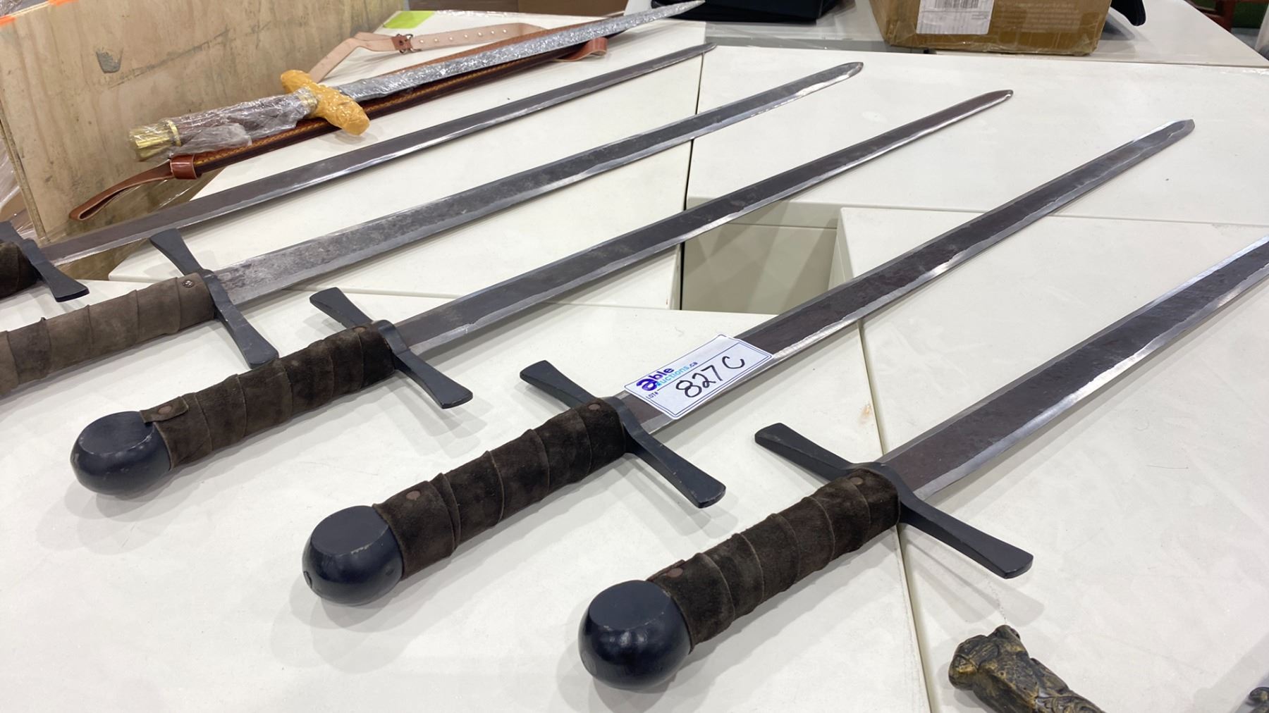 (5 )METAL PROP SWORDS, (1) RUBBER PROP SWORD AND ONE REAL SHORT SWORD WITH SHEATH