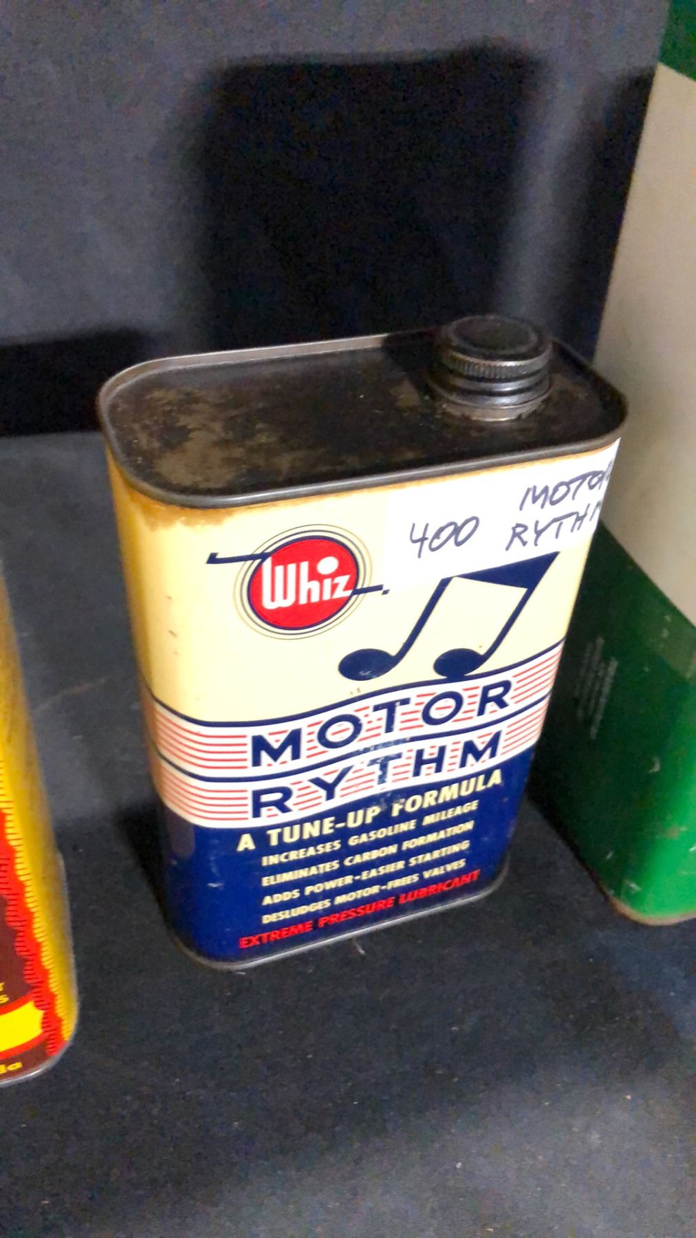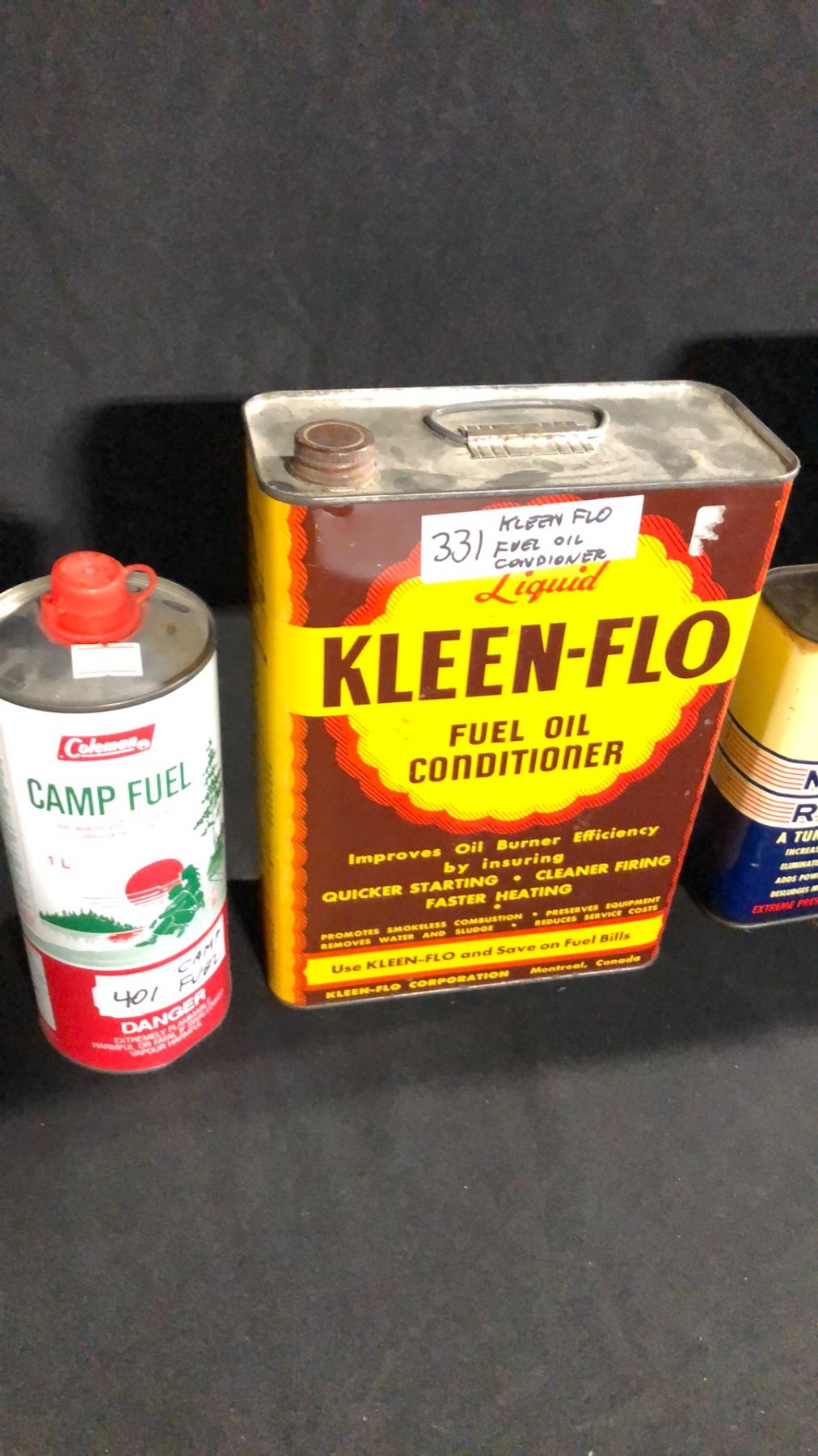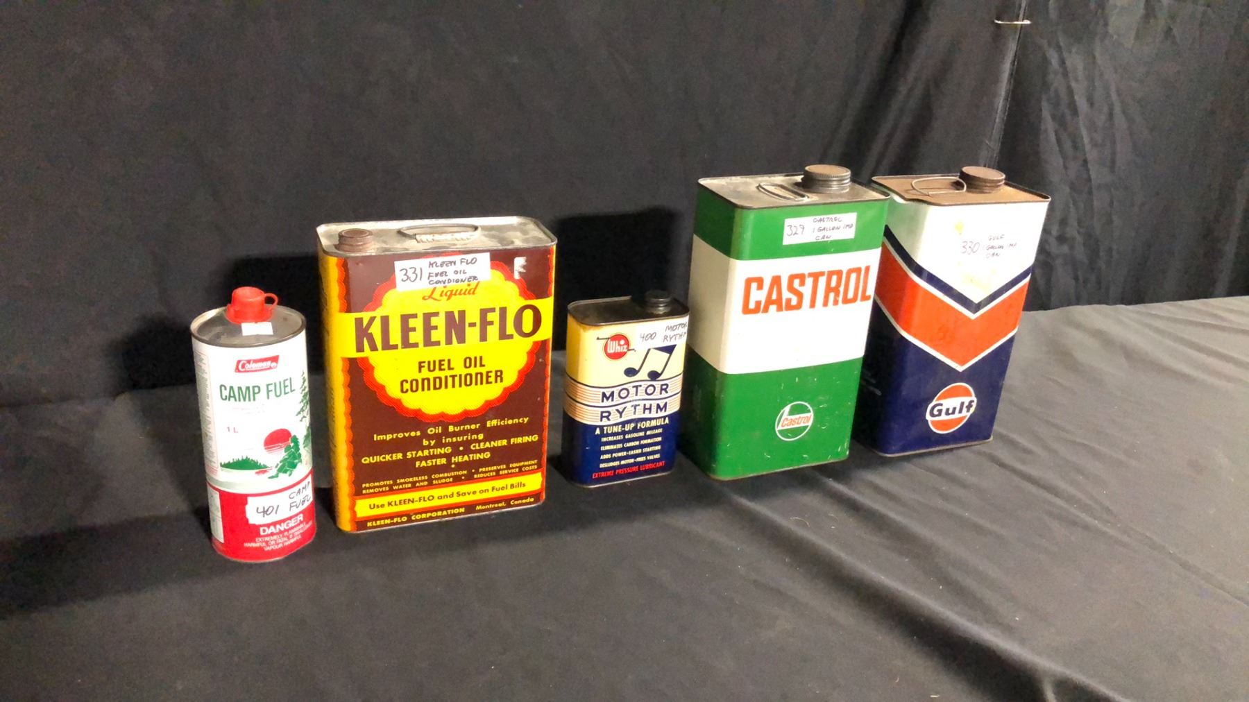 5 MISC EMPTY CANS INCL 1 GAL CASTROL, GULF, 32 OZ WHIZ MOTOR RYTHM, COLEMAN 1L CAMP FUEL, AND 128 LIQUID OUNCES KLEEN-FLO FUEL OIL CONDITIONER