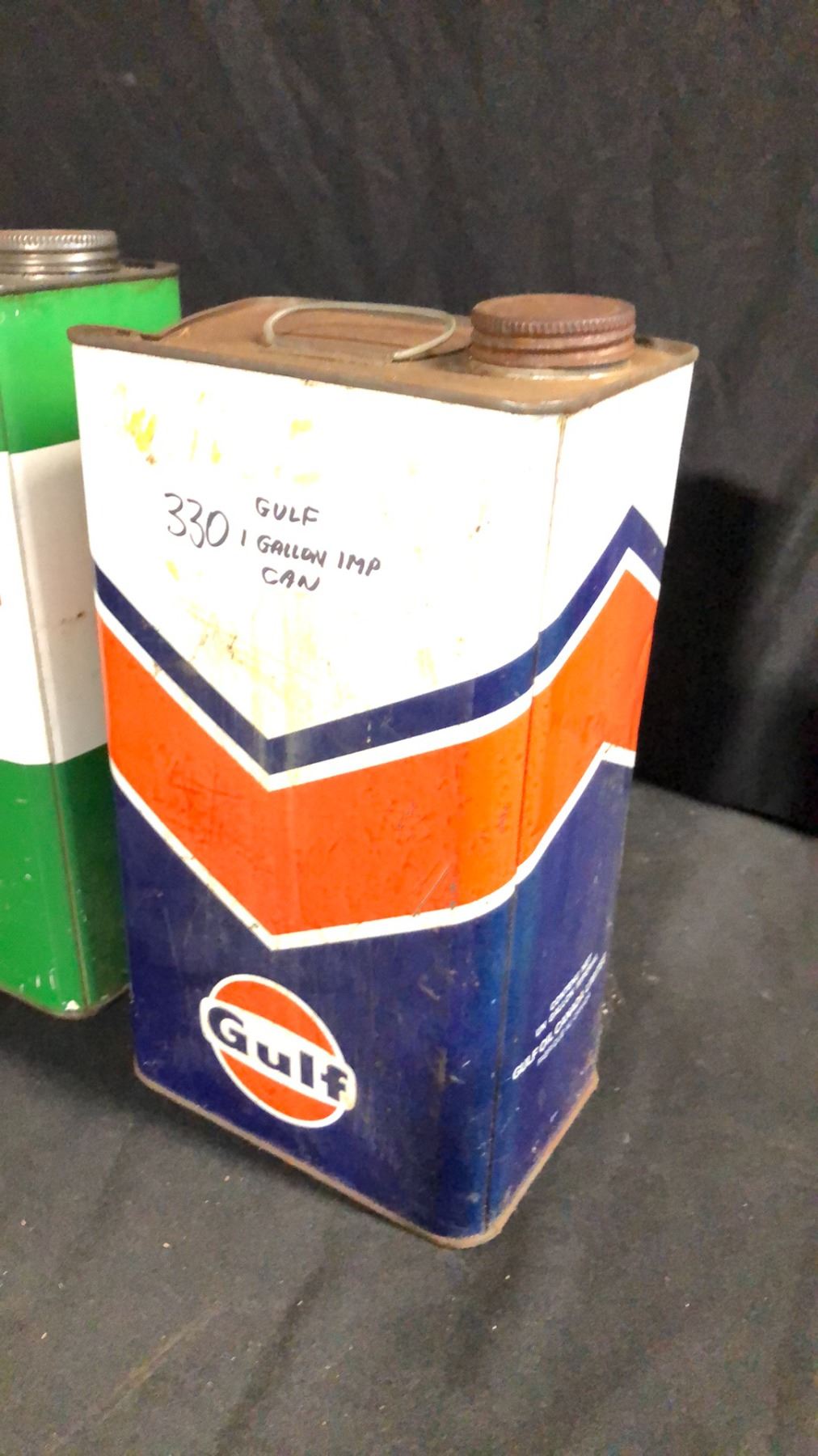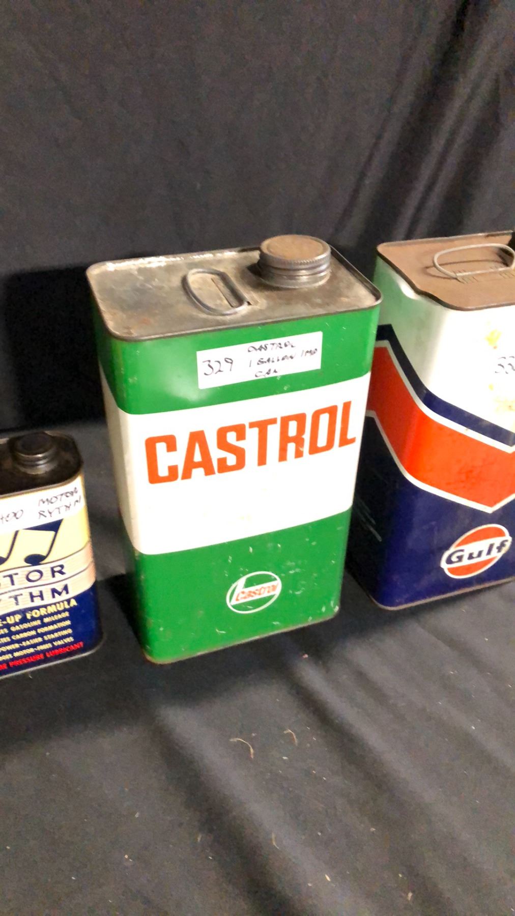 5 MISC EMPTY CANS INCL 1 GAL CASTROL, GULF, 32 OZ WHIZ MOTOR RYTHM, COLEMAN 1L CAMP FUEL,
