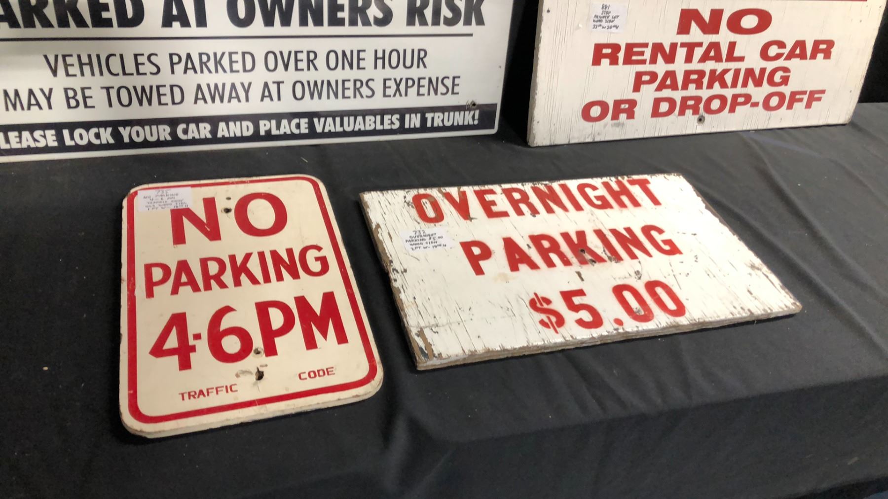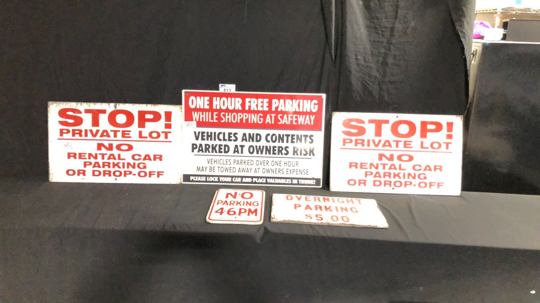 5 MISCELLANEOUS PARKING SIGNS INCL "OVERNIGHT PARKING $5.00"