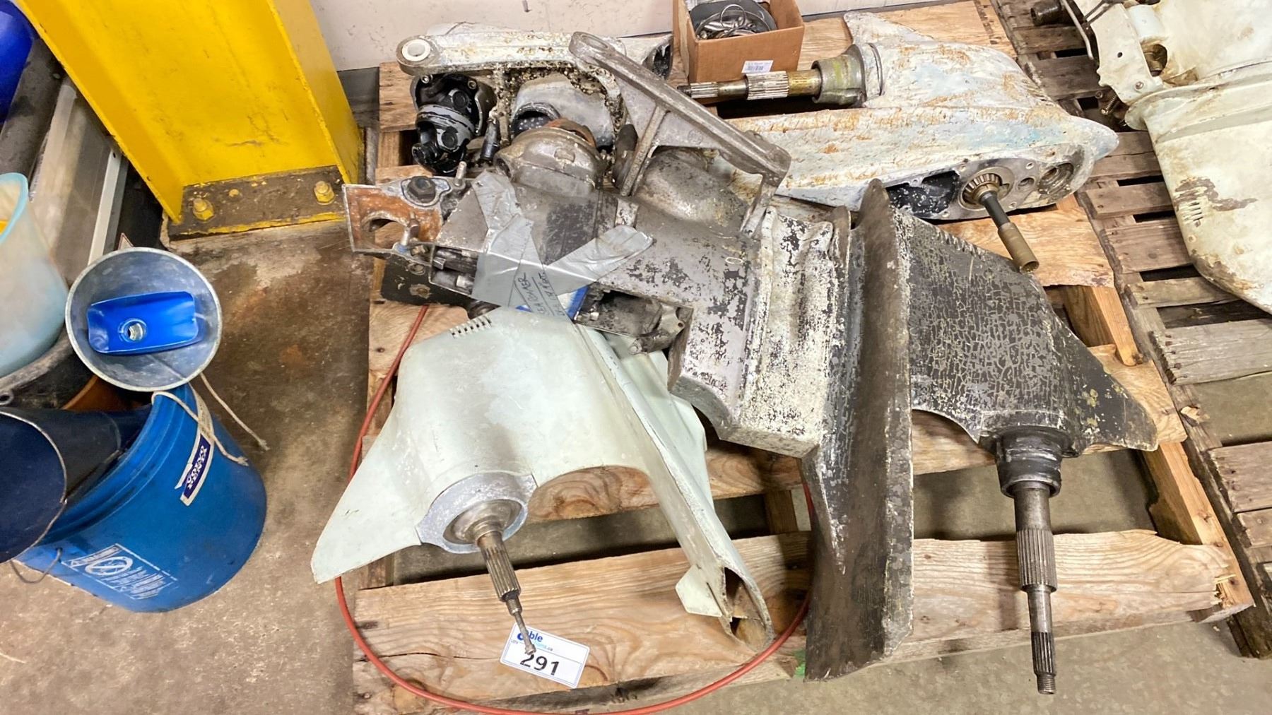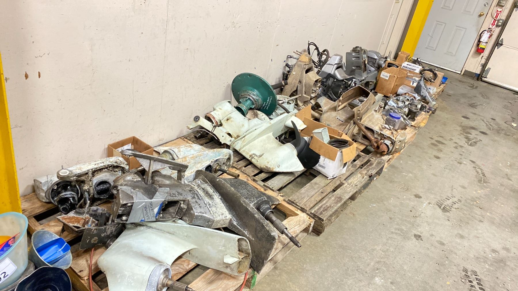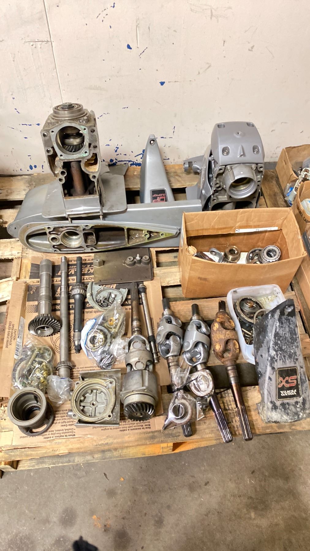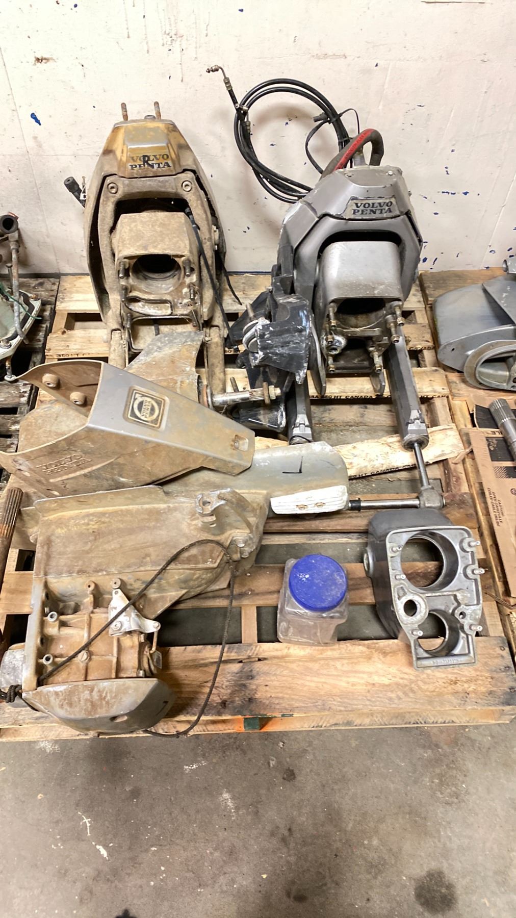 5 PALLETS ASST VOLVO DRIVE COMPONENTS AND COMPLETE DRIVES. SINGLE AND DUAL PROP, TRANSOM ASSEMBLIES