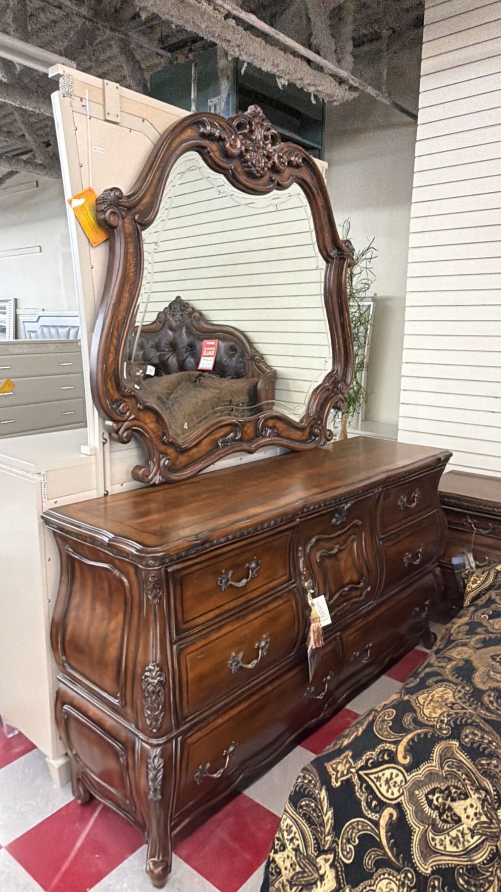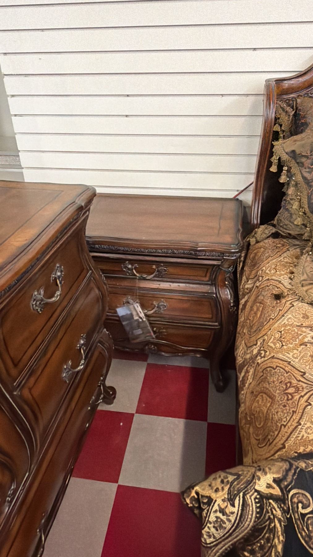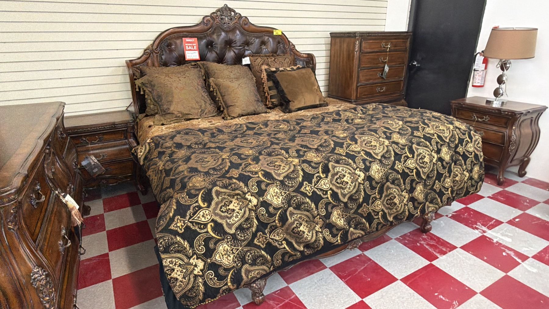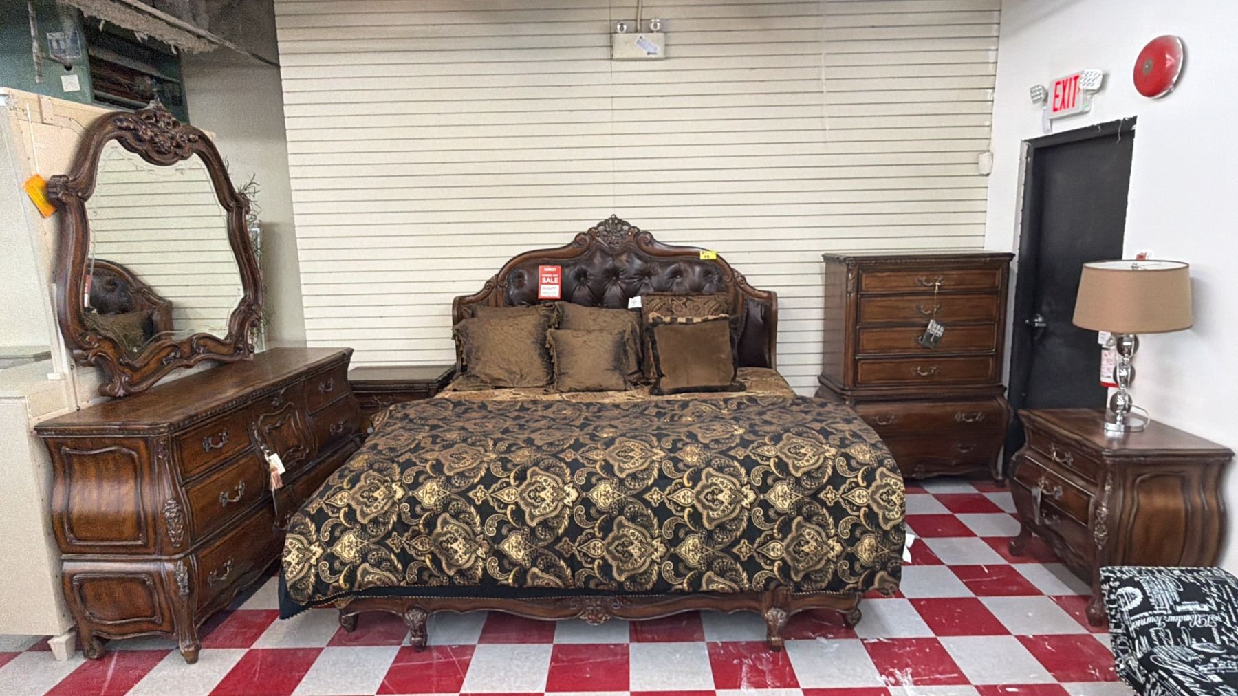 5-PC BEDROOM SUITE INCLUDING; KING SIZE BED WITH MATTRESS, VANITY, HIGHBOY DRESSER, (2) SIDE TABLES & TABLE LAMP