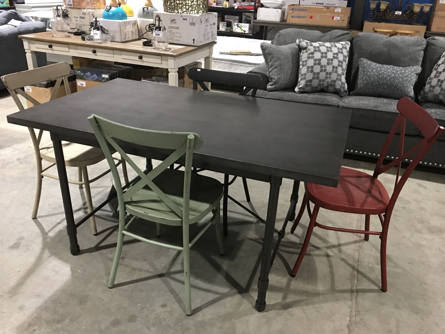5 PCE INDUSTRIAL STYLE DINING SET TABLE WITH 4 ASSTD COLOR METAL CHAIRS