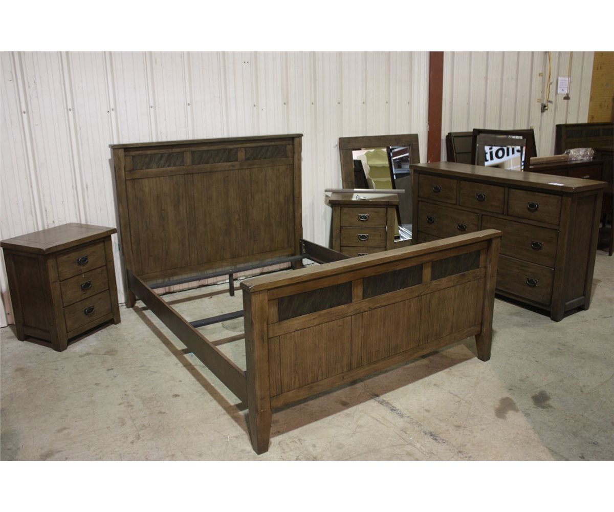 5 PIECE WOOD BEDROOM SUITE WITH QUEEN HEADBOARD AND FOOTBOARD, 2 NITE STANDS, 7 DRAWER DRESSOR AND MIRROR