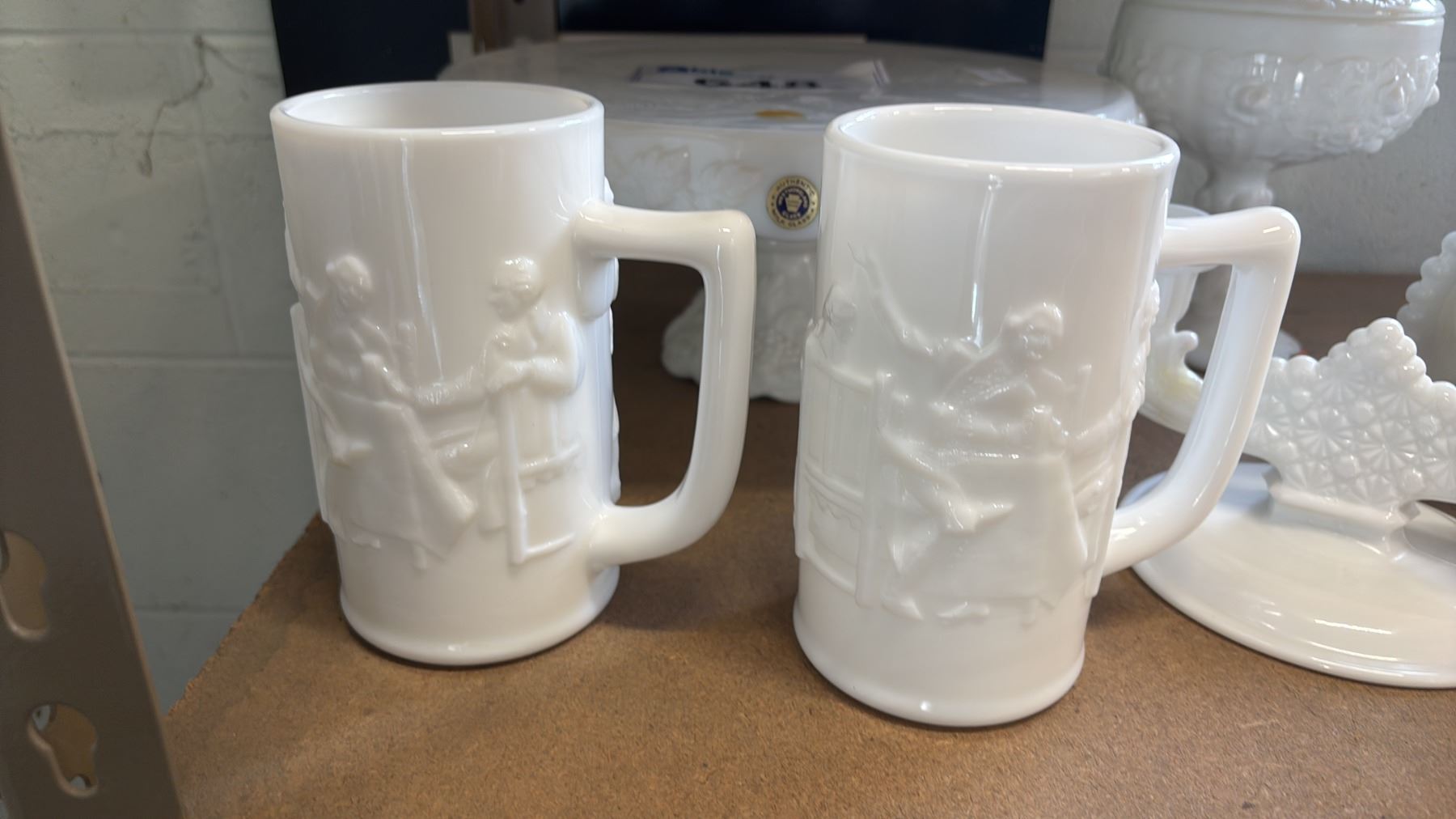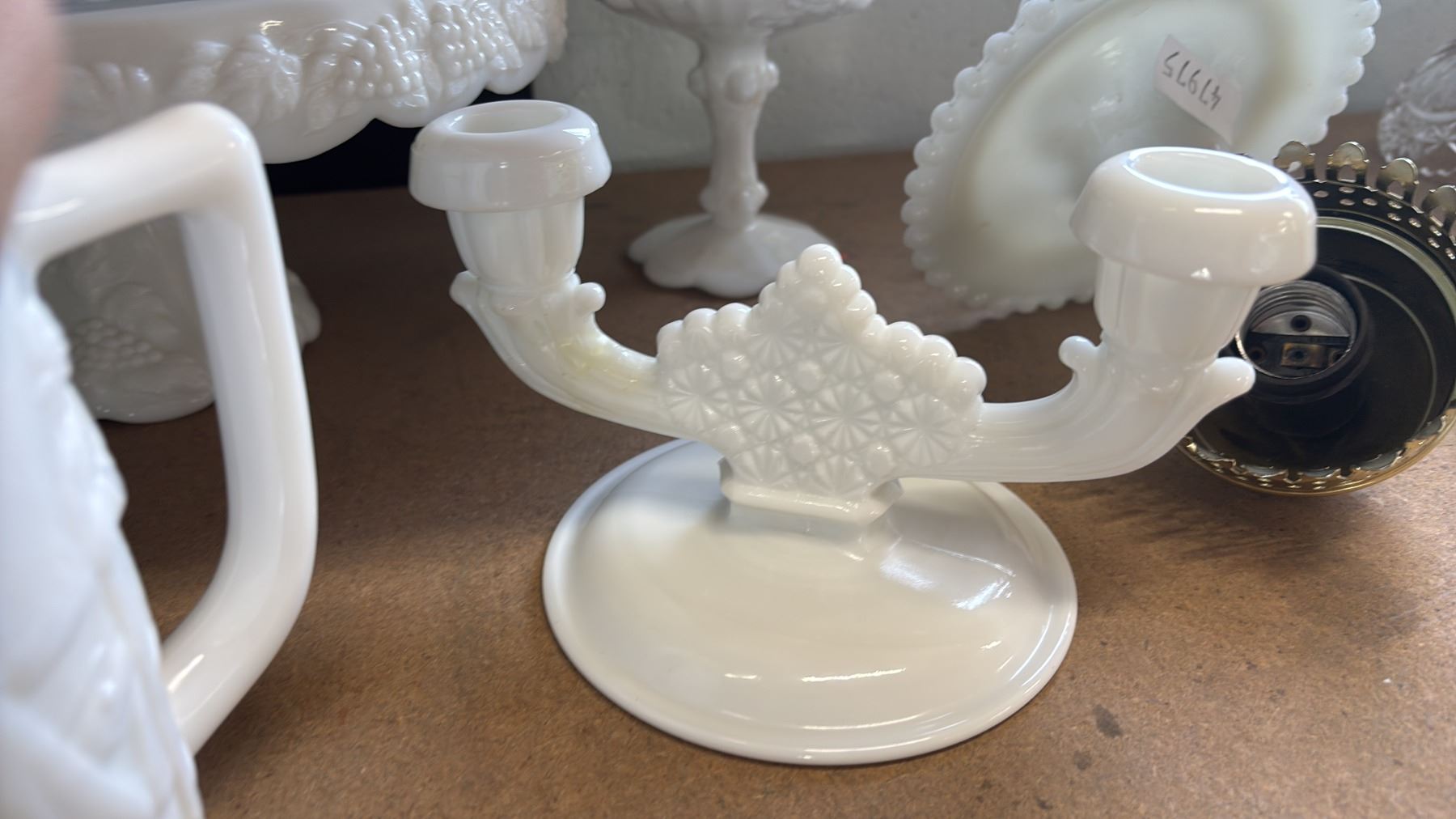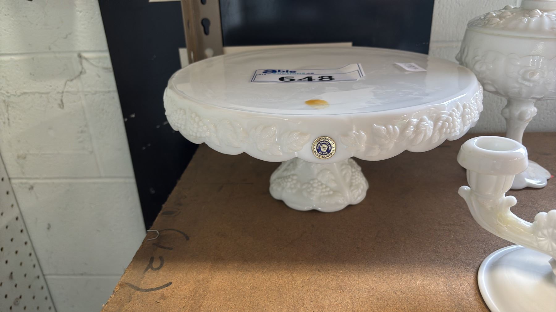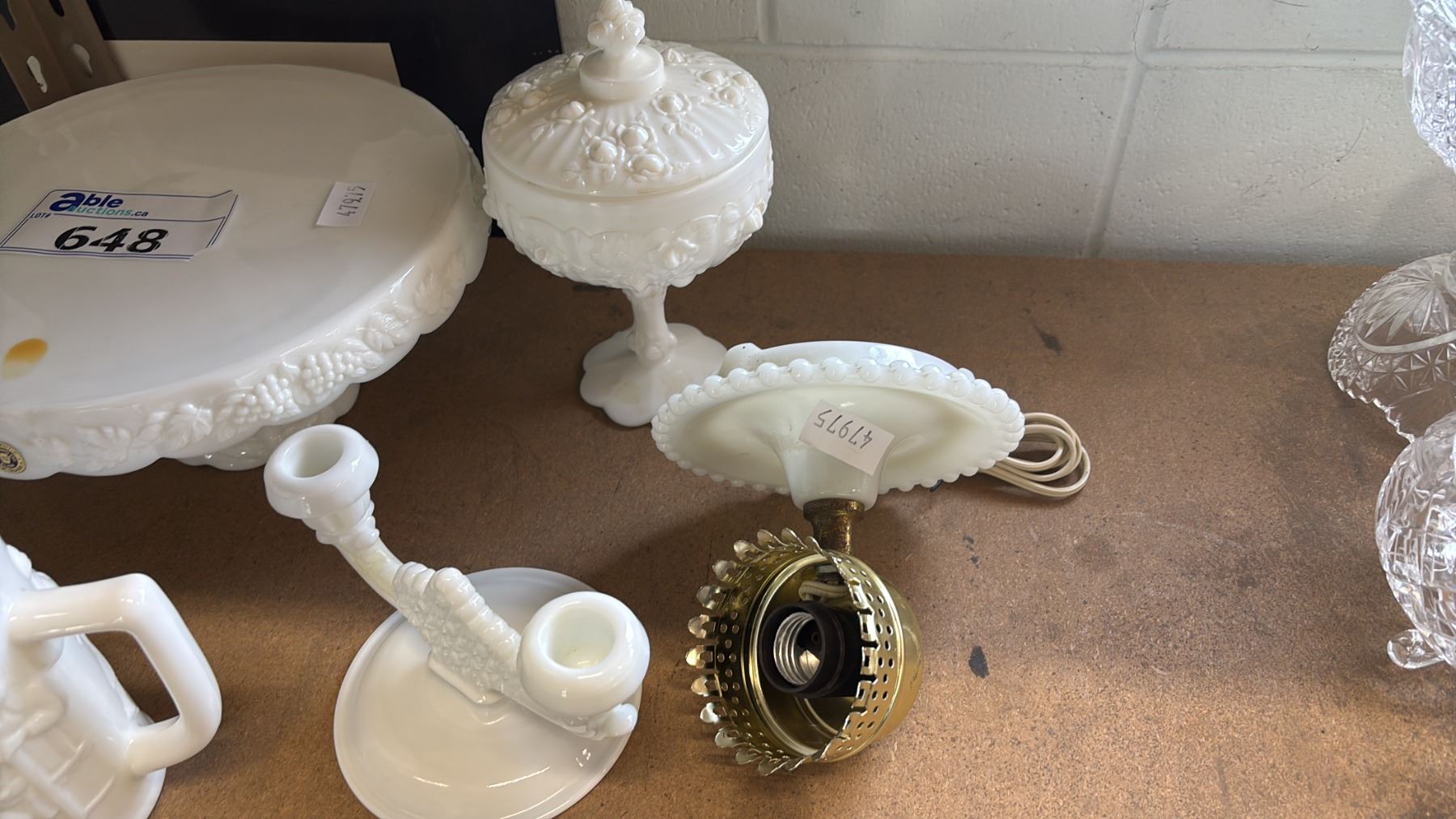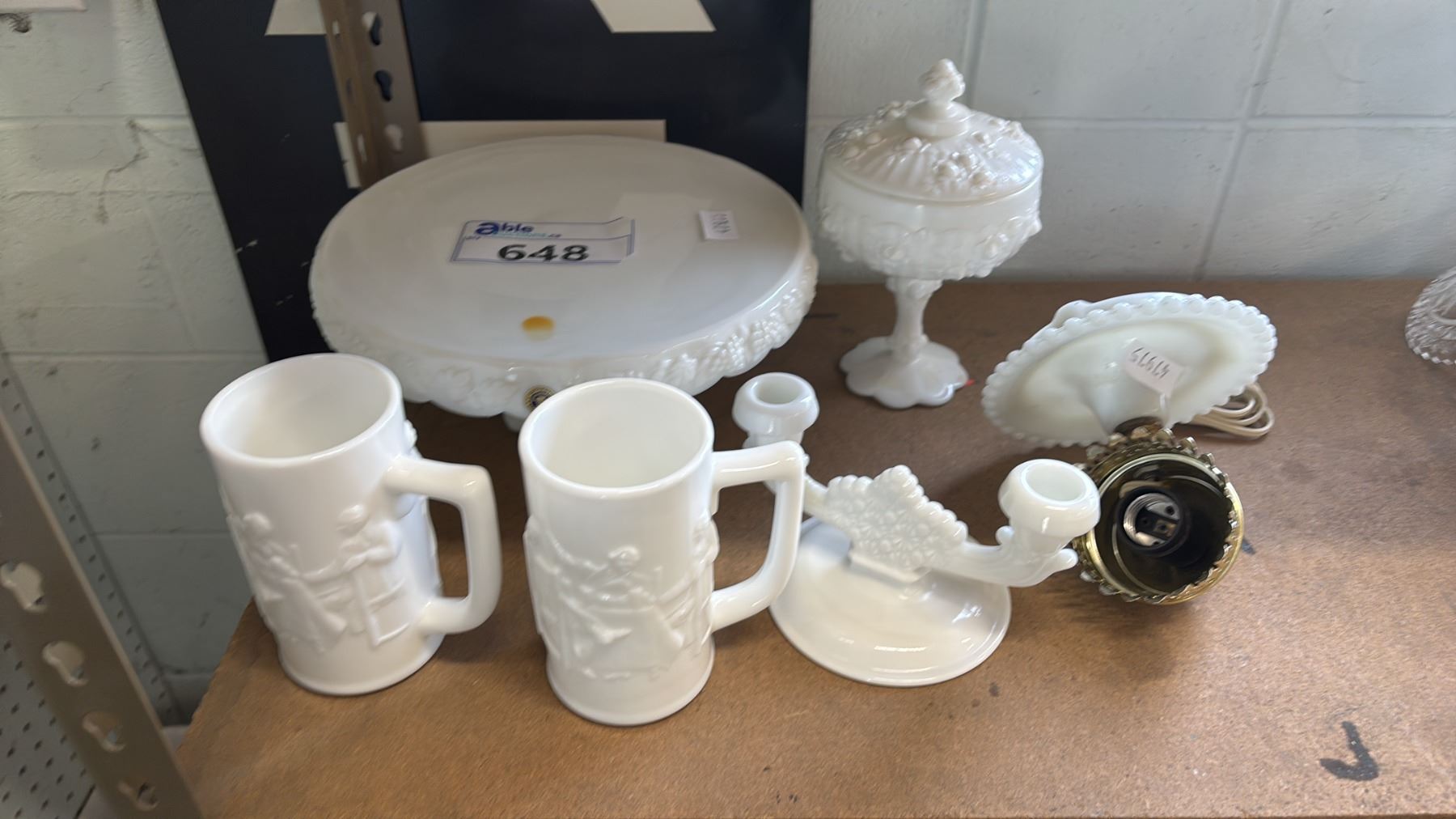 (5) PIECES OF VINTAGE MILK GLASS & A MILK GLASS WALL LIGHT: FENTON CAKE STAND, FENTON LIDDED COMPOTE FENTON CANDLE HOLDER, (2) FOSTORIA STEINS & AN ELECTRIC WALL LIGHT WITH MILK GLASS BASE