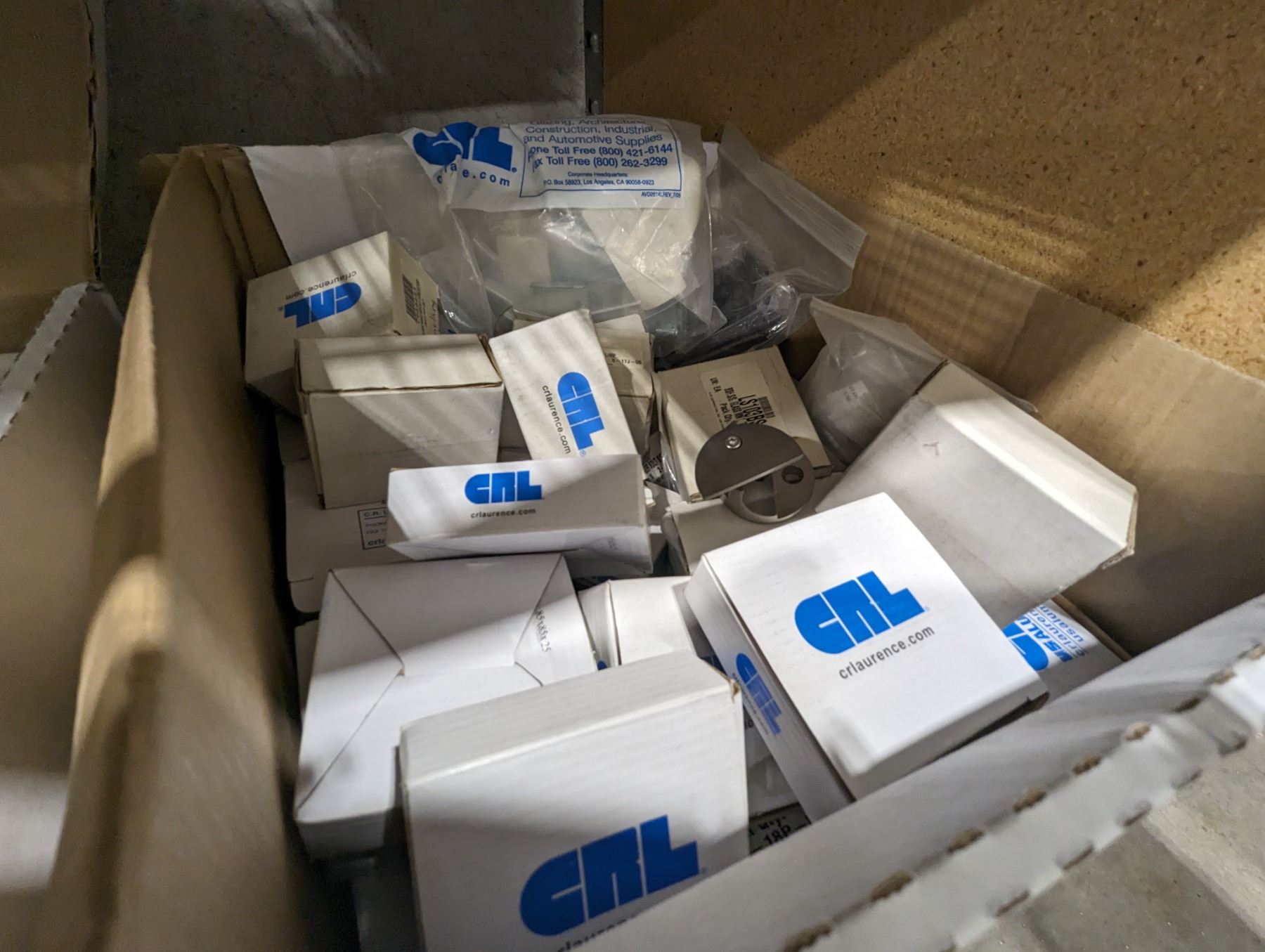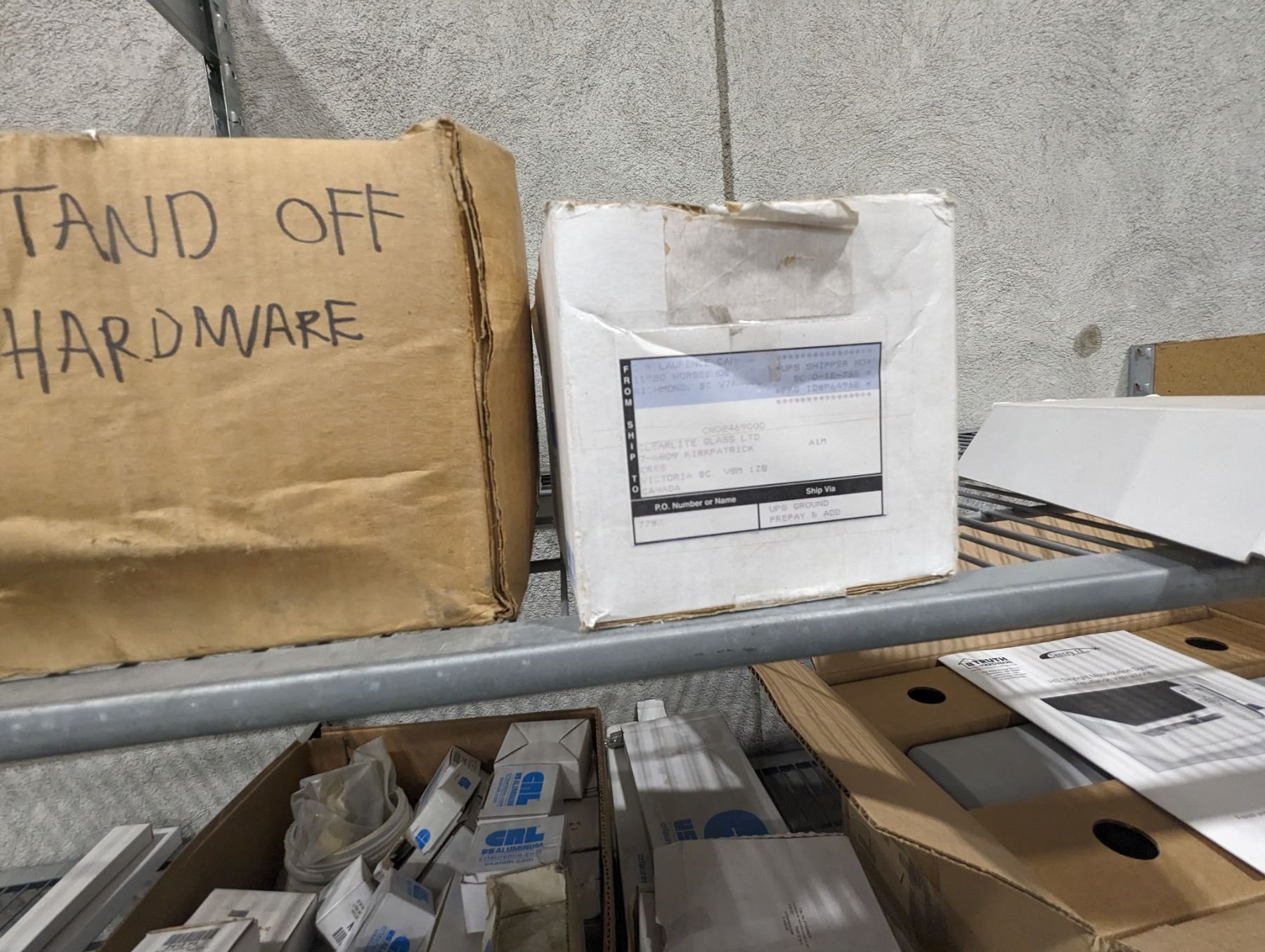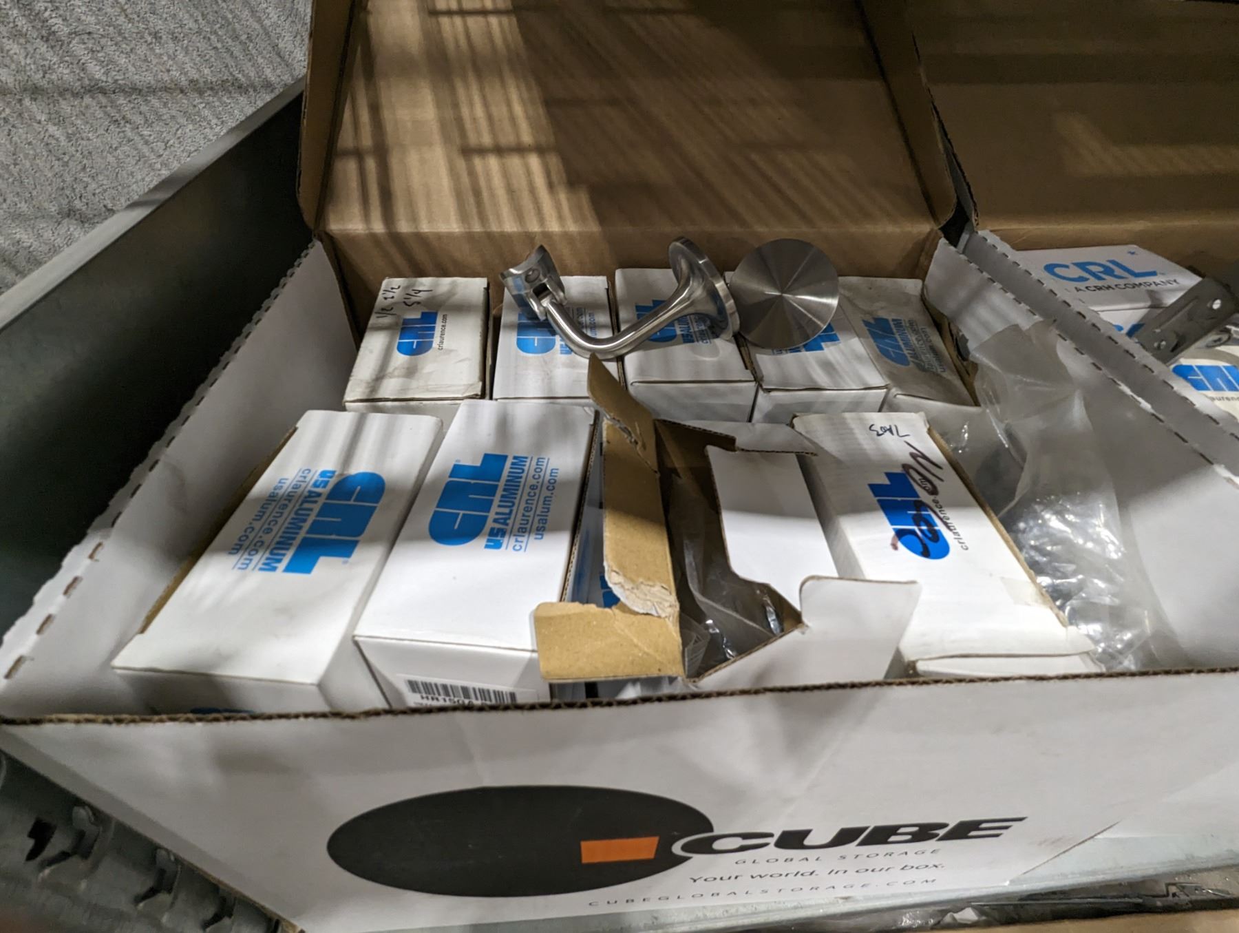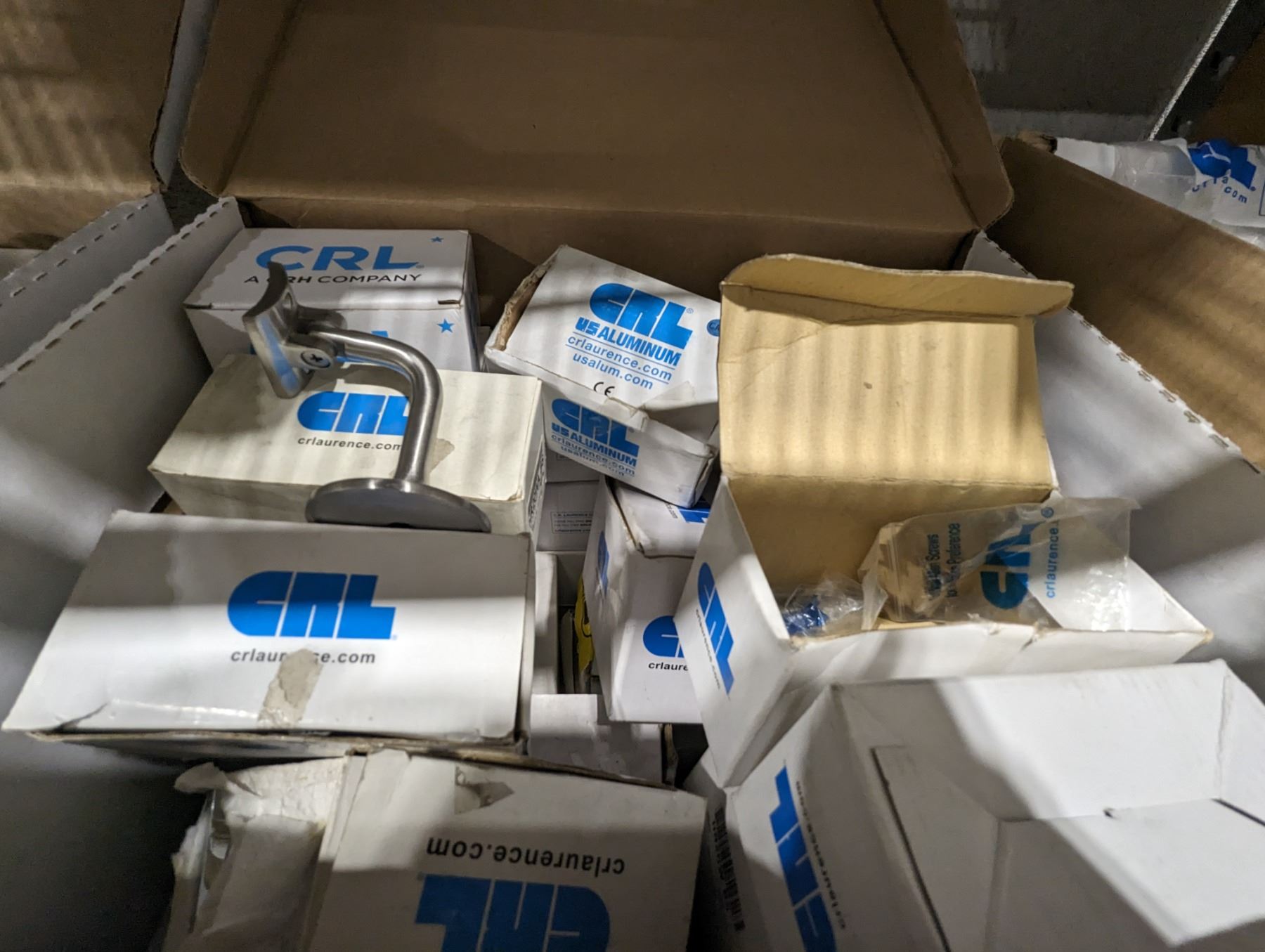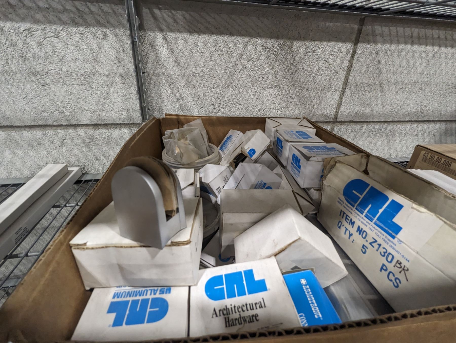 5 SHELVES ASST HARDWARE. DOOR CLOSERS, 3 BOXES TRUTH REMOTE CONTROL SKYLIGHT MOTORIZATION SYSTEMS, CRL SS RAILING BRACKETS (LOTS OF THEM), GLASS MOUNTING BRACKETS, APPROX 8 BOXES GLYNN-JOHNSON OVERHEAD STOPS