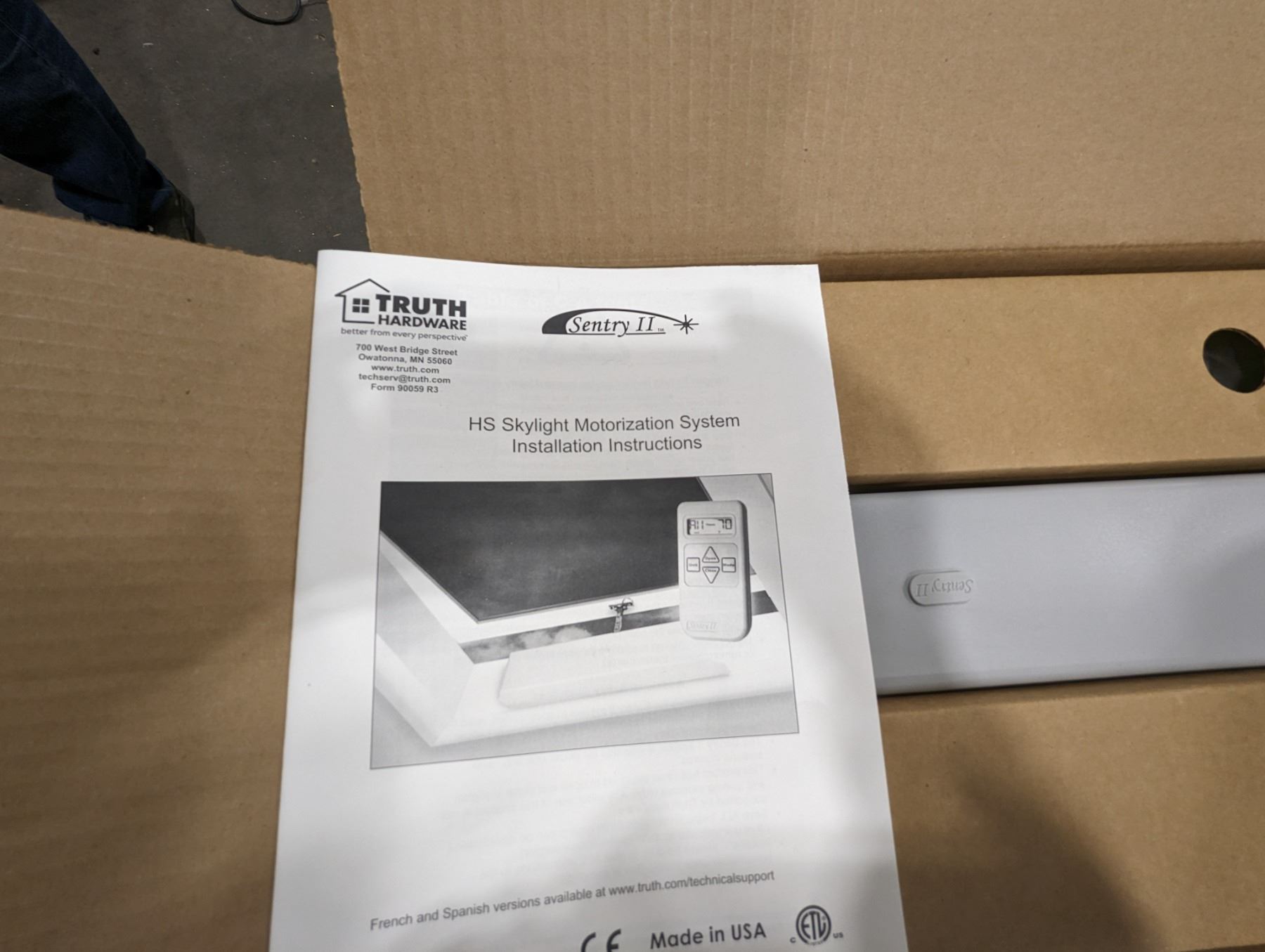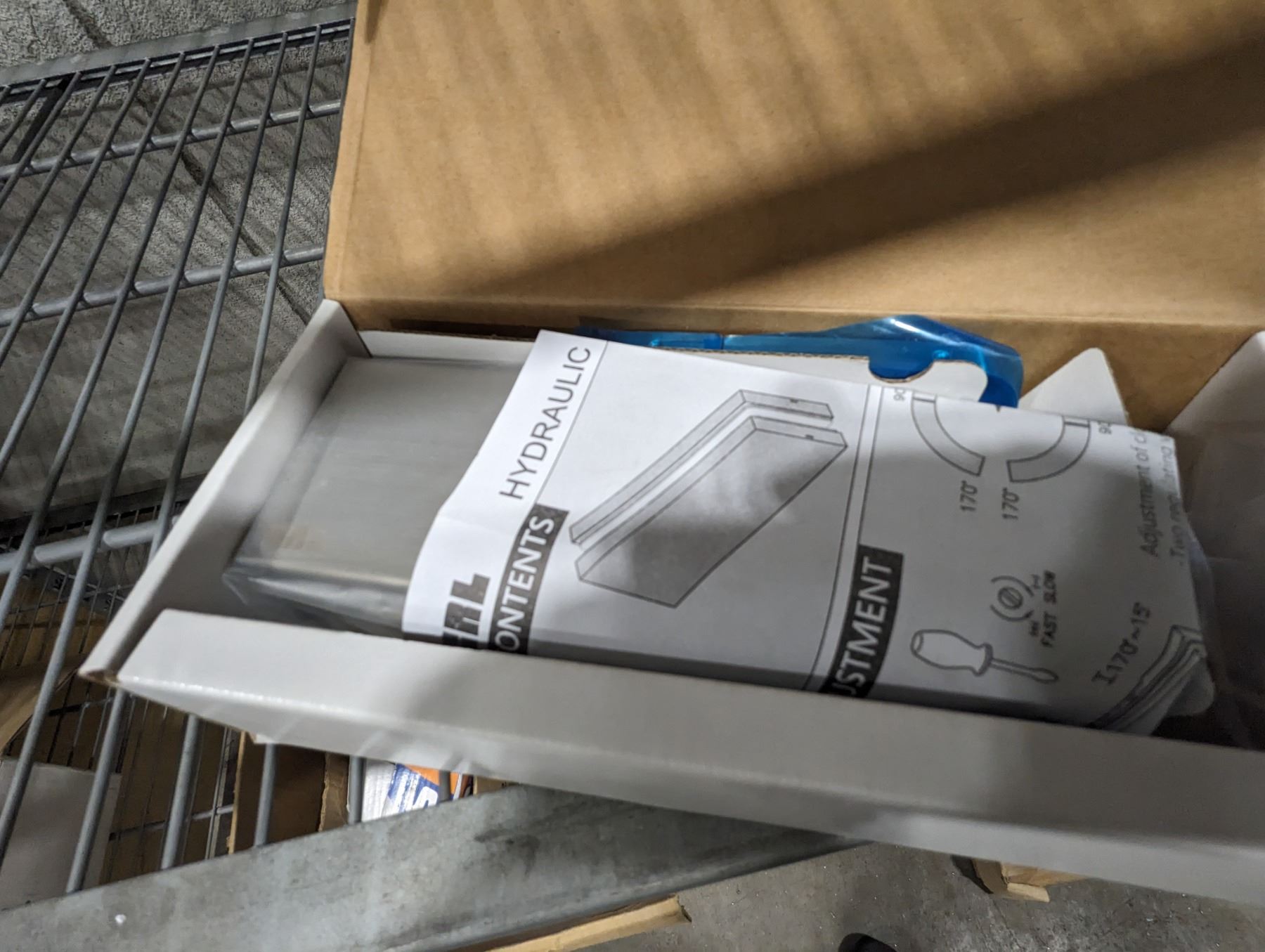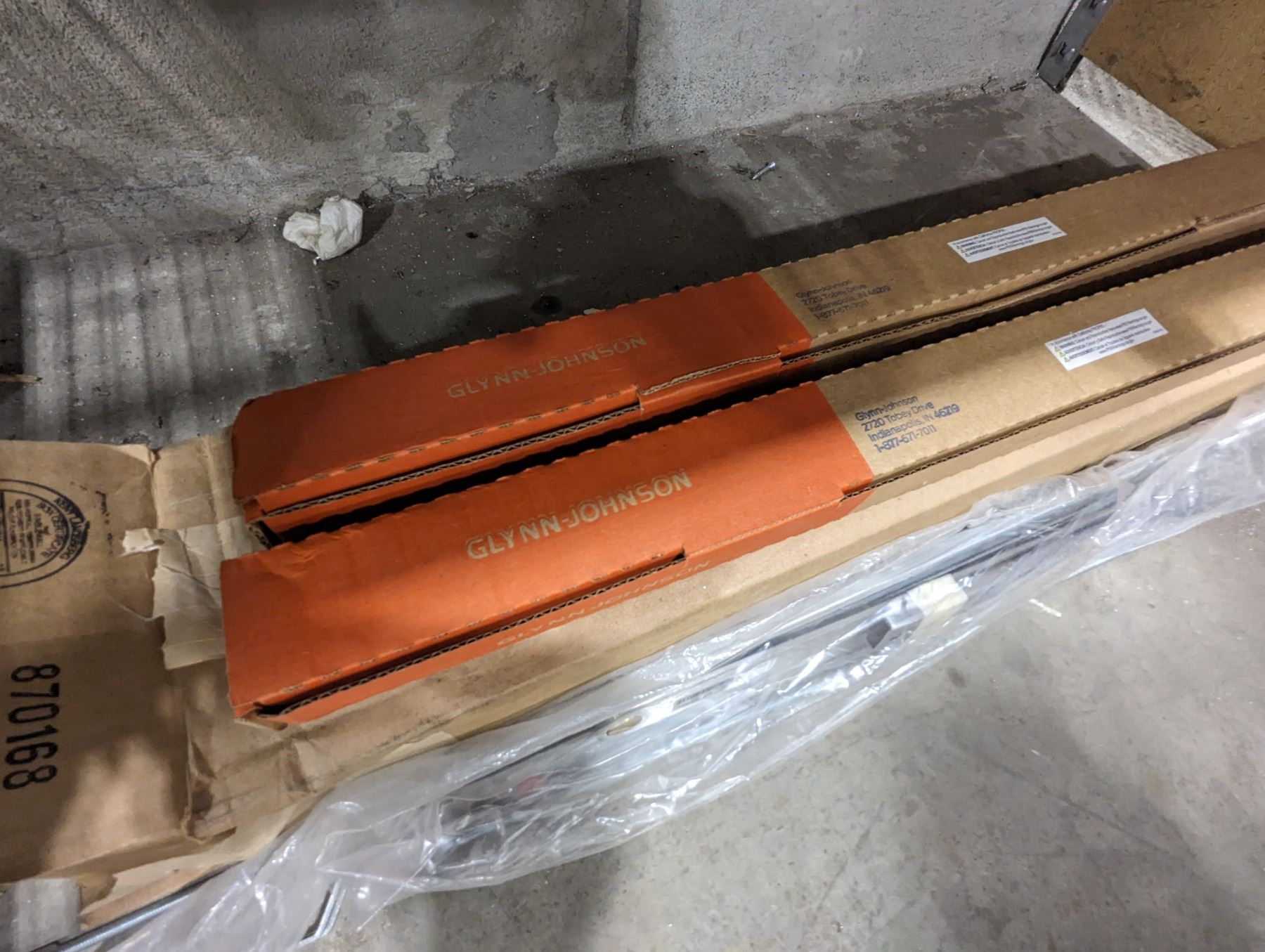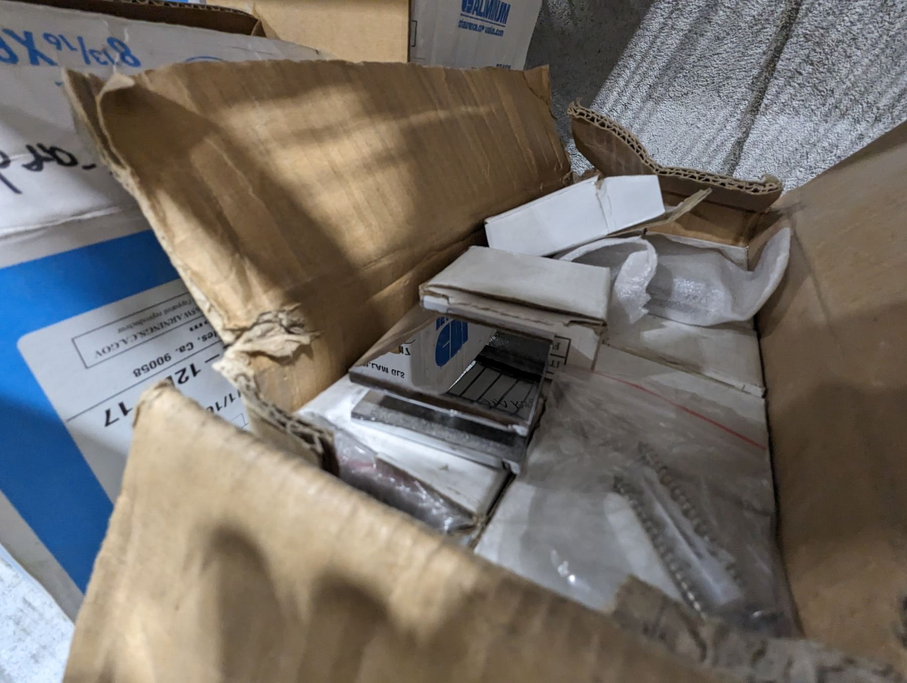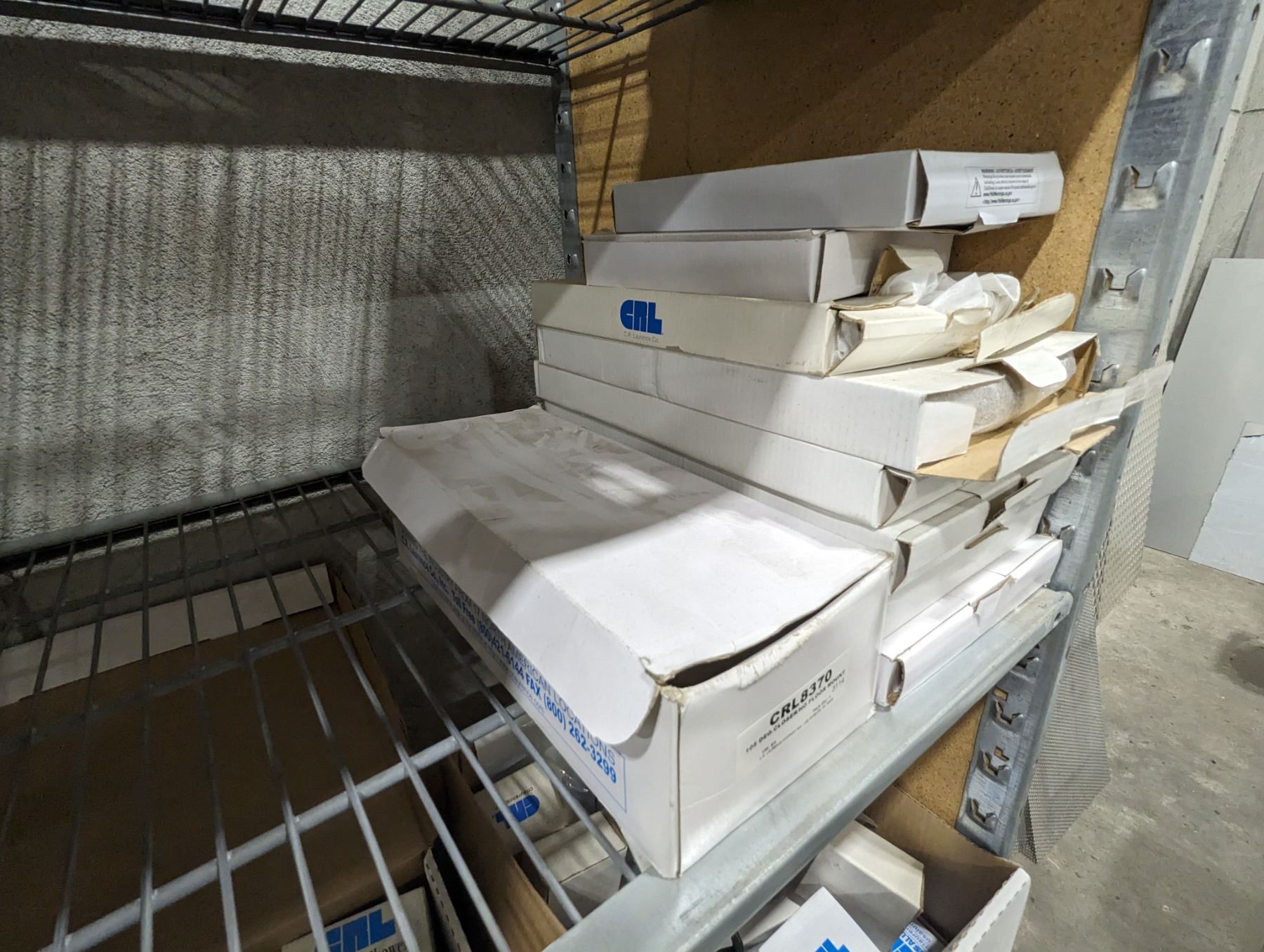 5 SHELVES ASST HARDWARE. DOOR CLOSERS, 3 BOXES TRUTH REMOTE CONTROL SKYLIGHT MOTORIZATION SYSTEMS, CRL SS RAILING BRACKETS (LOTS OF THEM), GLASS MOUNTING BRACKETS, APPROX 8 BOXES GLYNN-JOHNSON OVERHEAD STOPS
