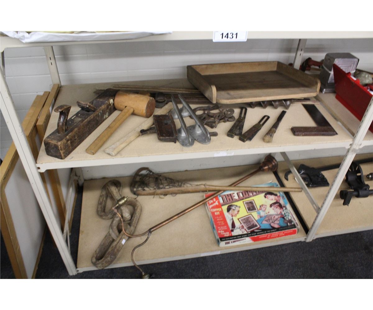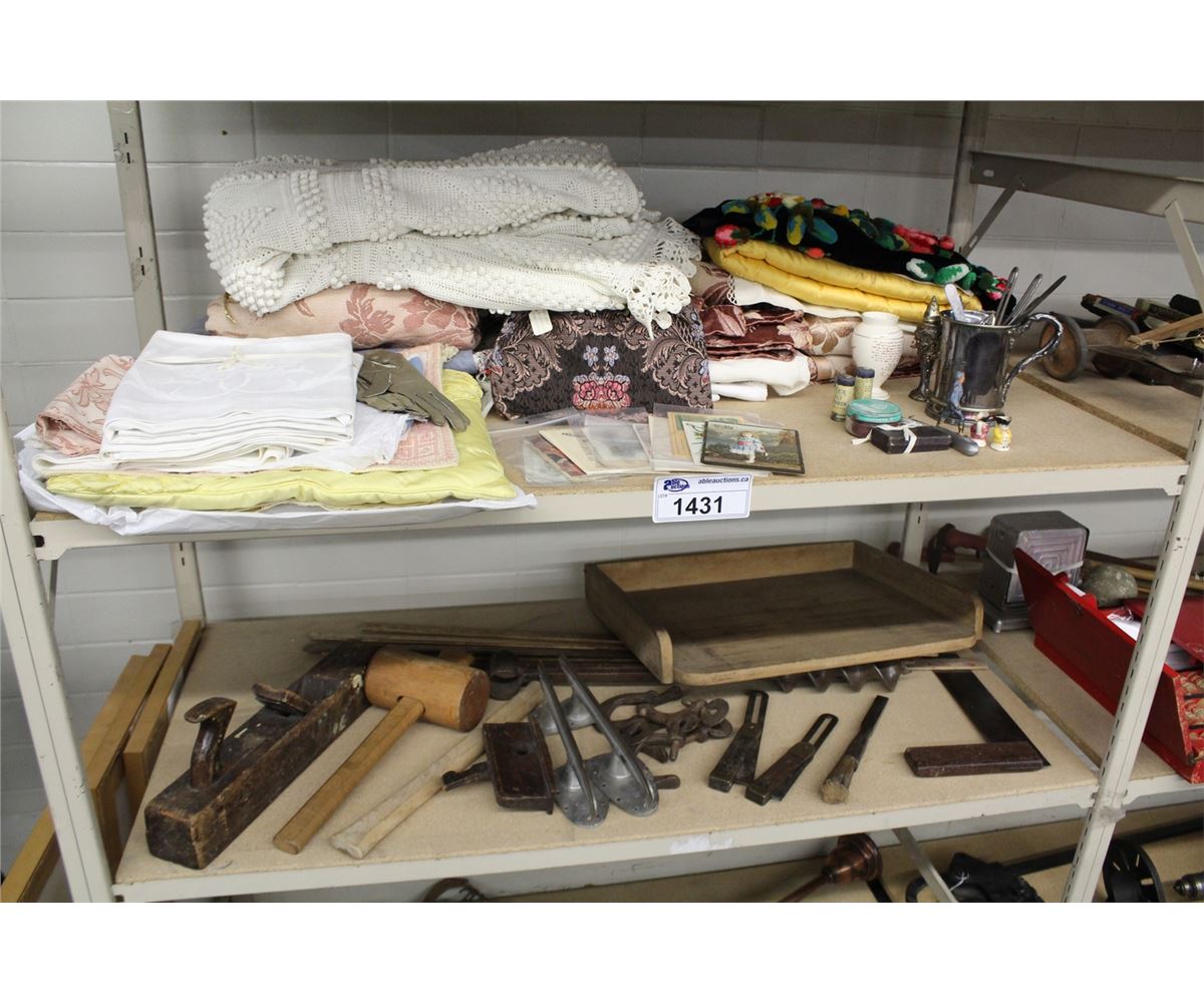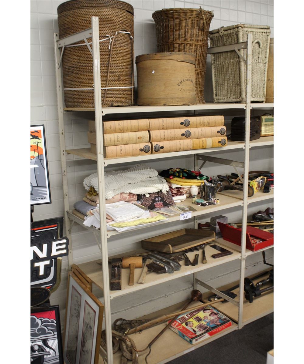 5 SHELVES OF ASSORTED ANTIQUES, LINENS BOOKS, TOOLS, TOYS, BASKETS, ETC.