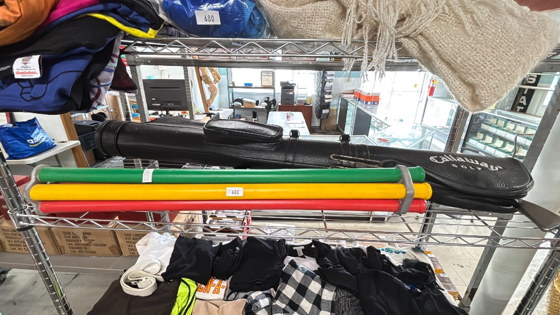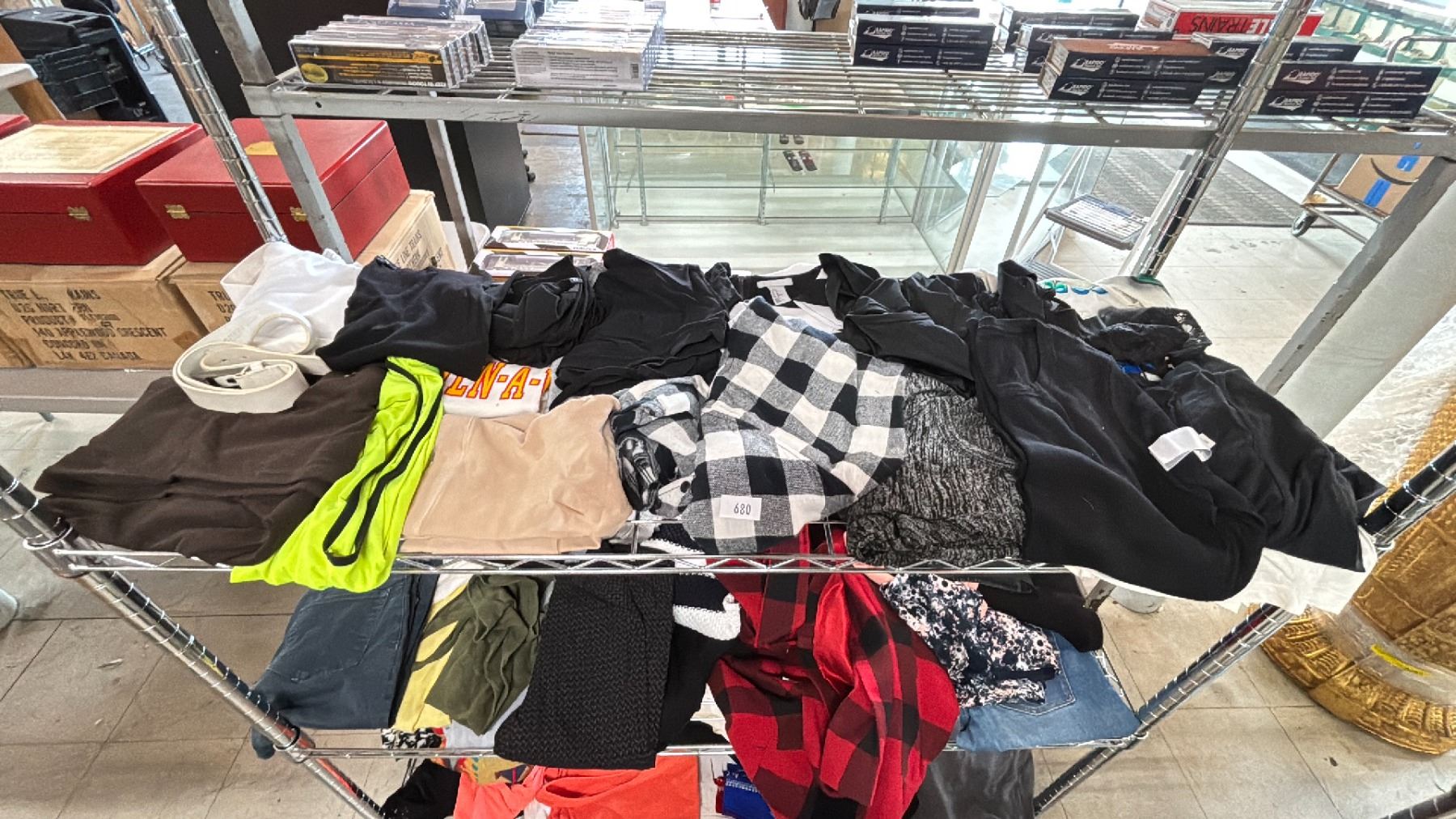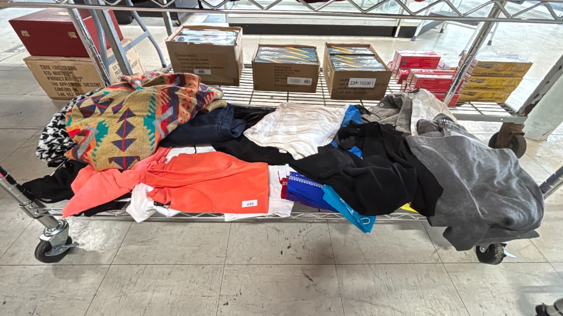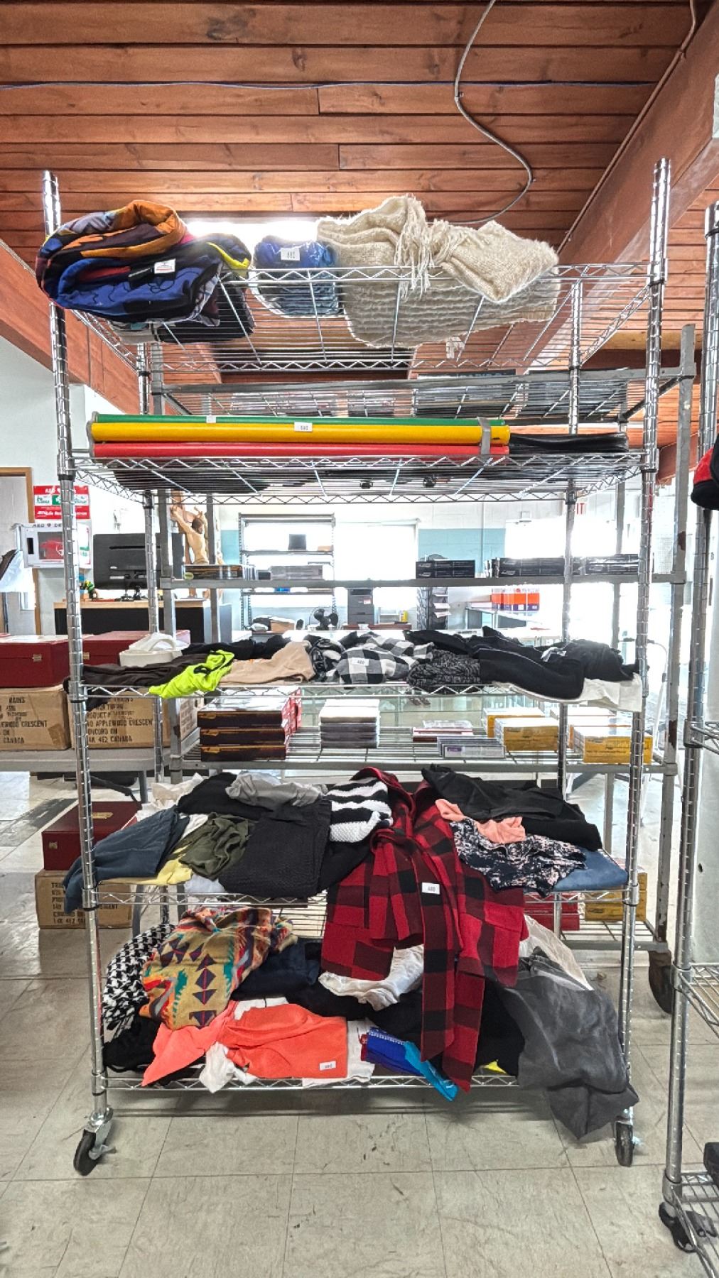 5 SHELVES OF CONTENTS - ASSORTED CLOTHING, BLANKETS & MORE *RACK NOT INCLUDED*