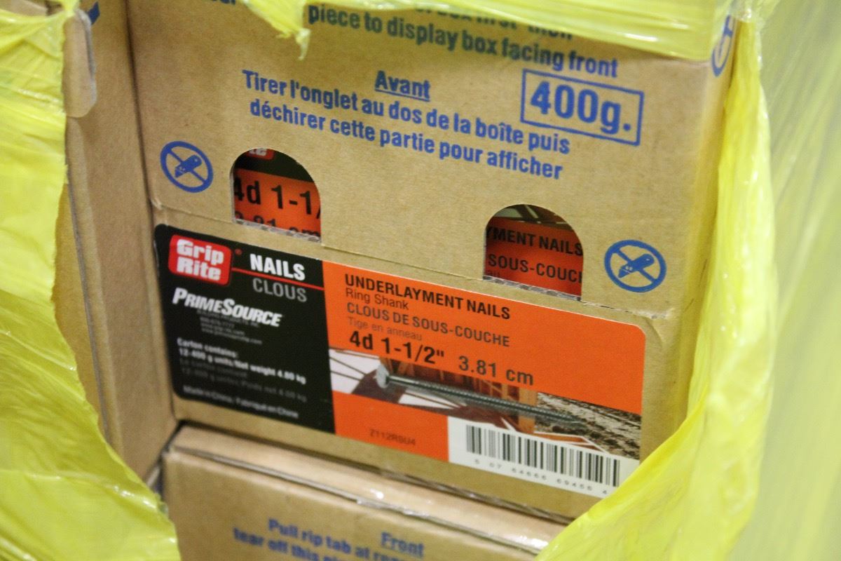 5 STACKS OF ASSORTED SIZE BOXES, TRIM, FINISH & COMMON NAILS