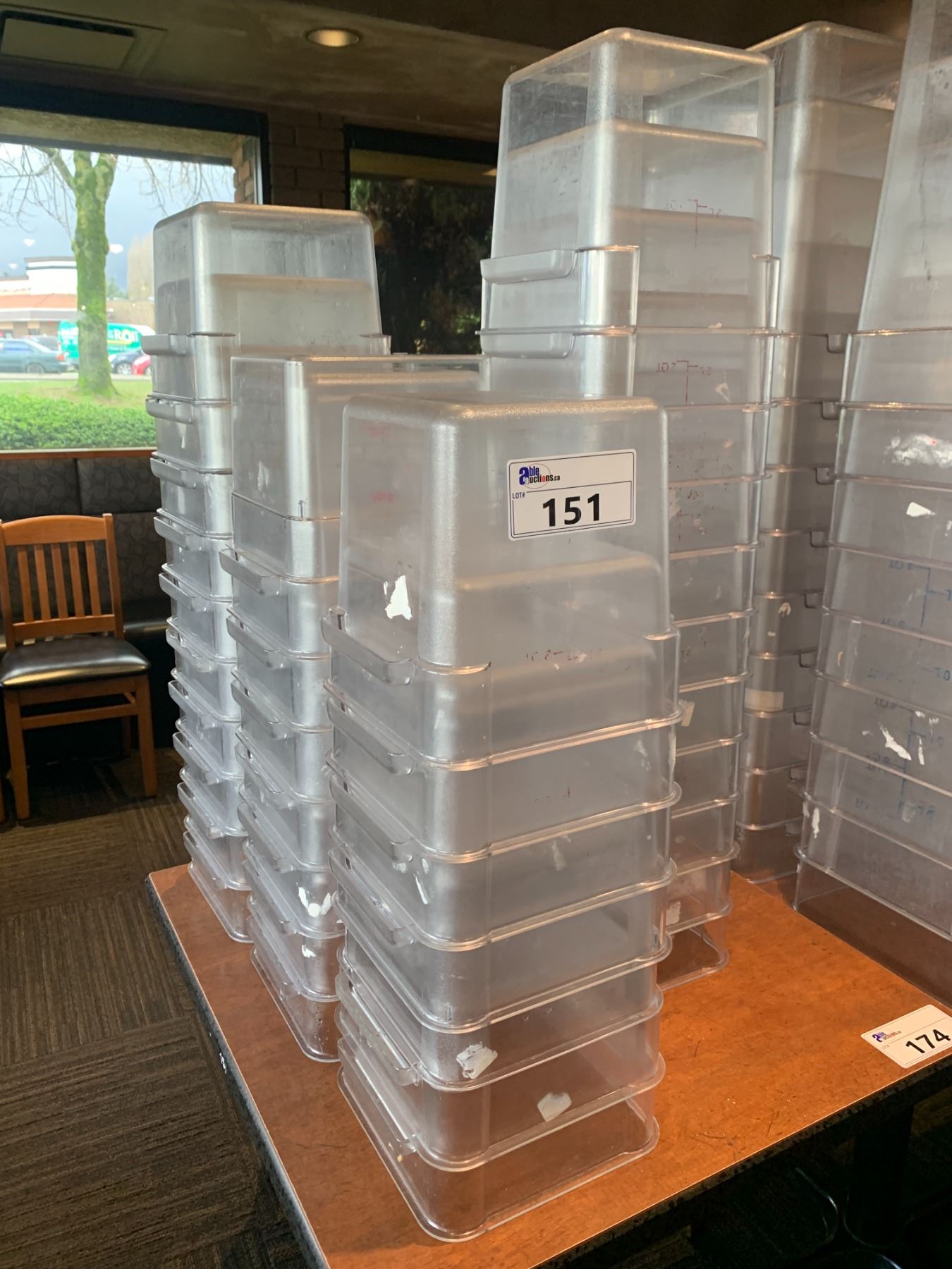5 STACKS OF ASSORTED TRANSPARENT COMMERCIAL PLASTIC CONTAINERS