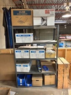 5 TIER GREY METAL PRODUCT SHELF AND REMAINING CONTENTS OF MEZZ INCLUDING ASSORTED PACKING MATERIAL, CASTER WHEELS, EMPTY TOOL BAGS, AND ASSORTED TOTES WITH CONTENTS