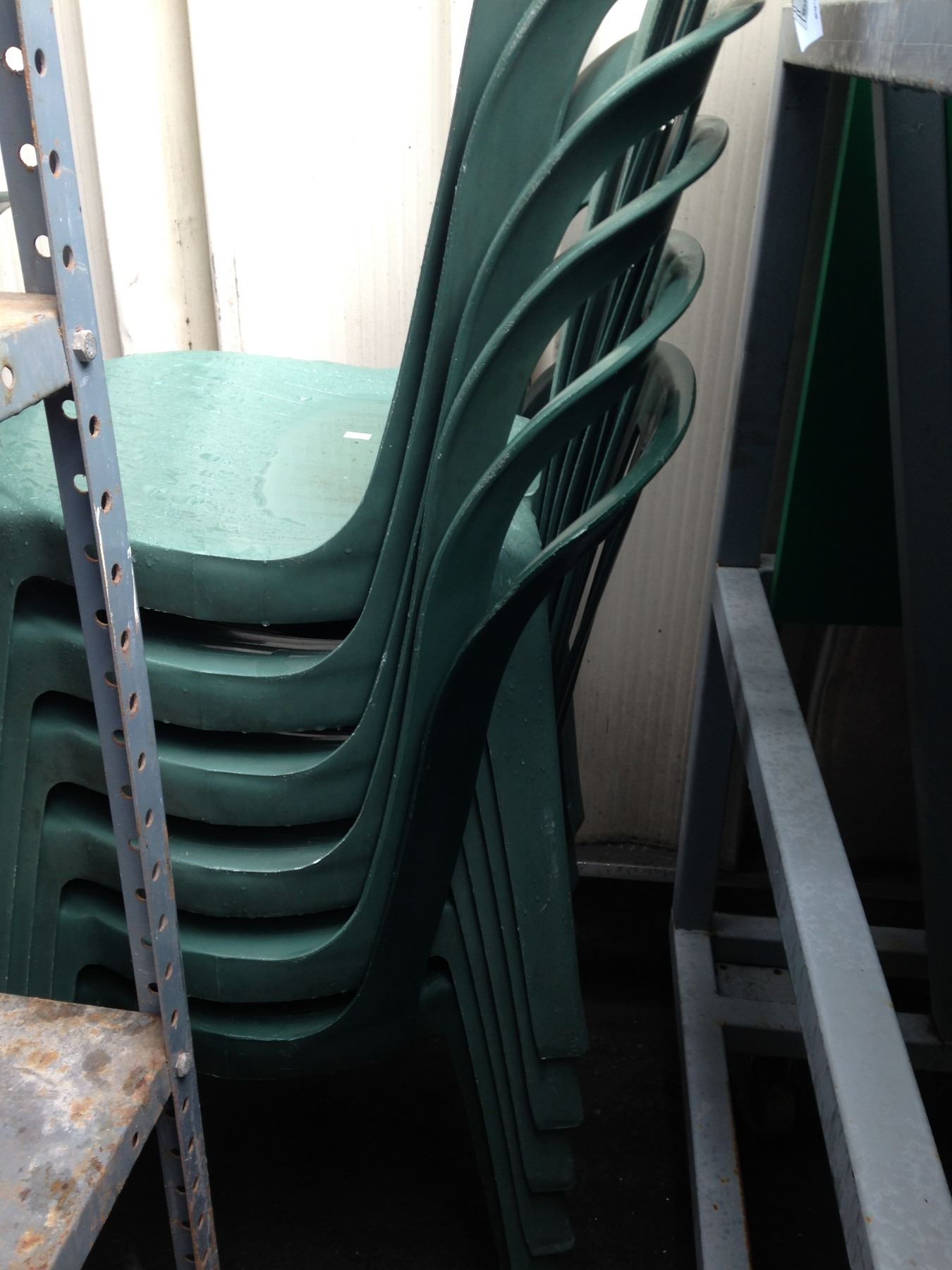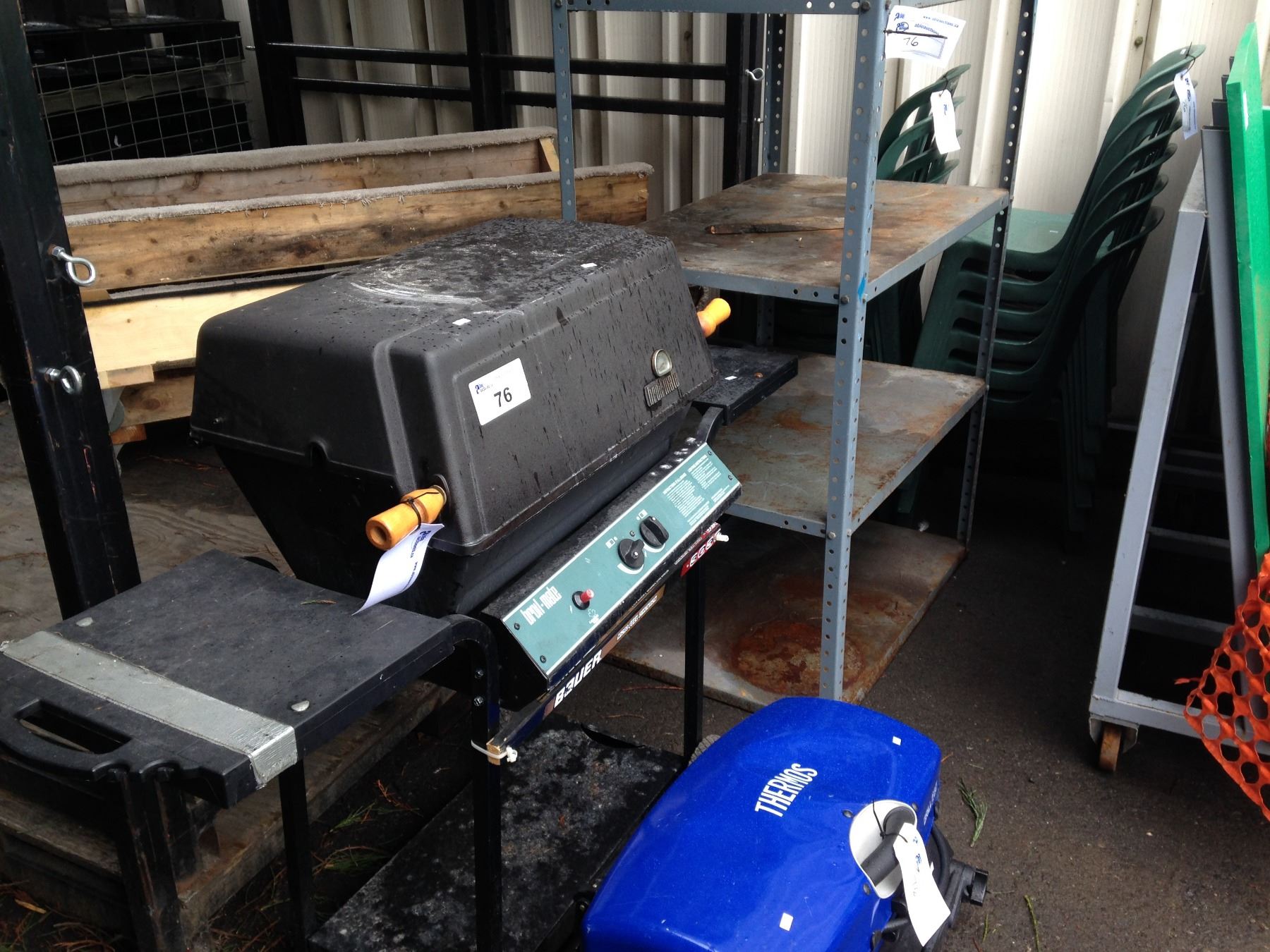 5 TIER METAL SHELF, 2 BBQS, & 2 STACKS OF PLASTIC OUTSIDE CHAIRS