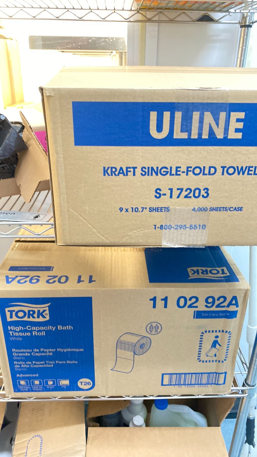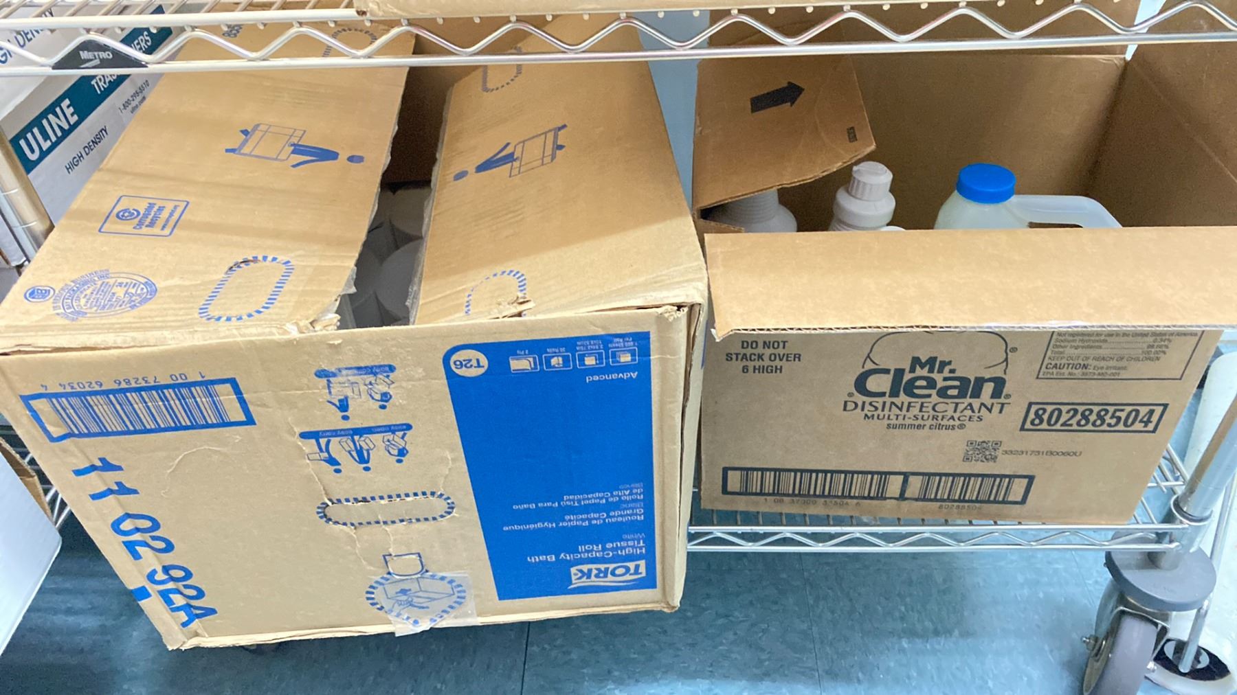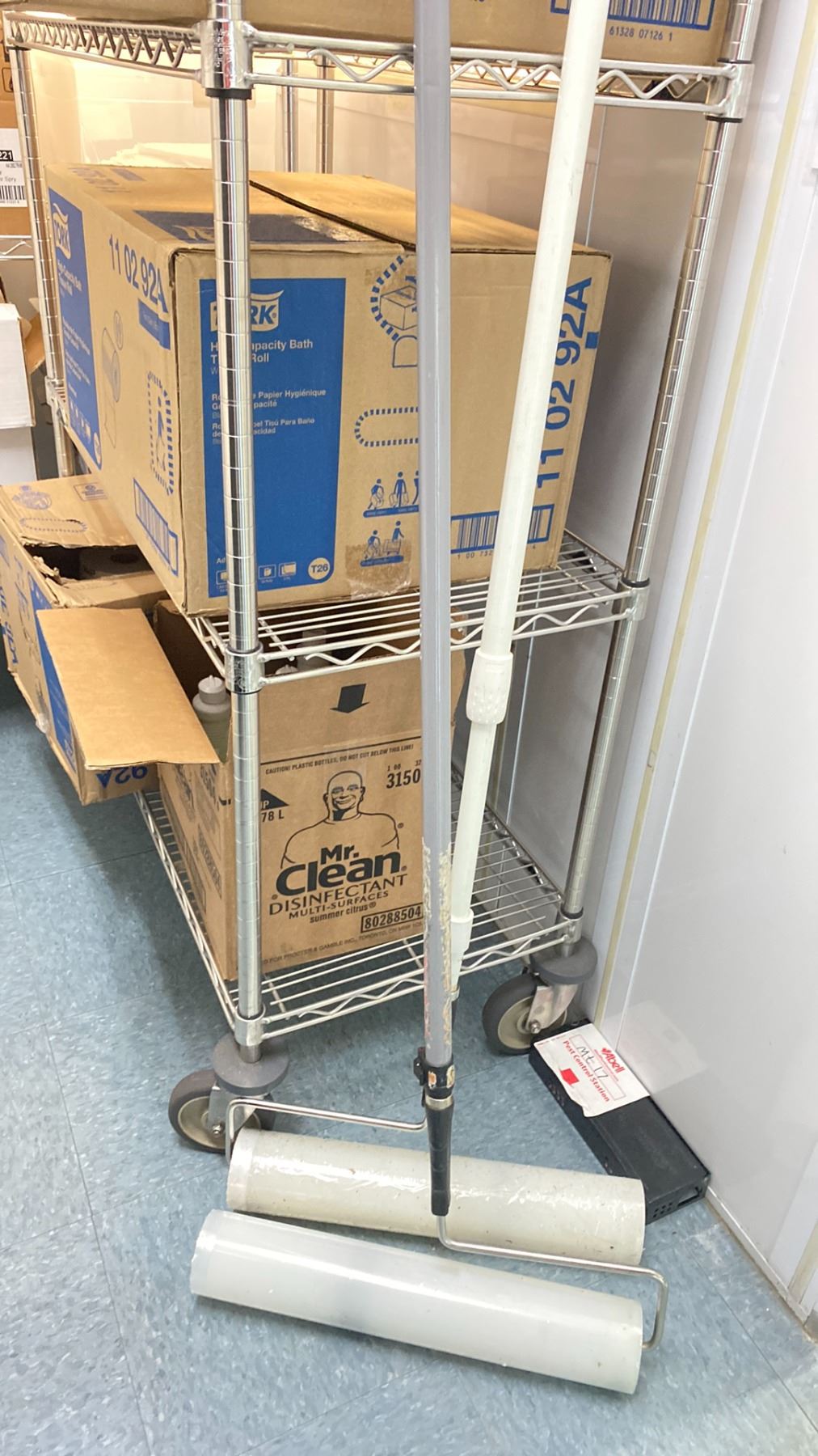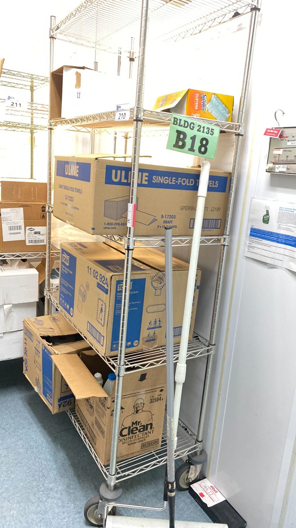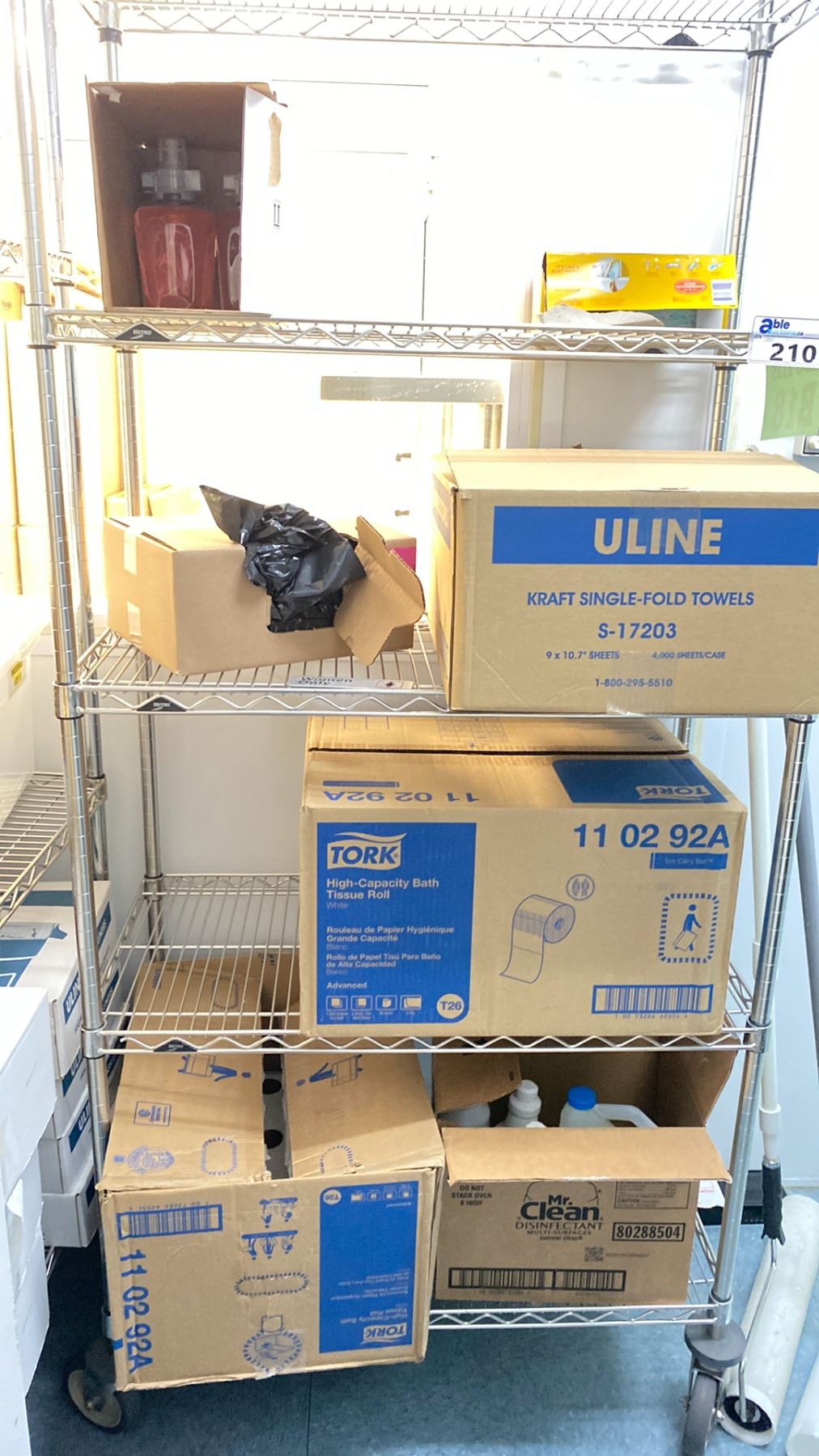 5 TIER MOBILE METRO RACK WITH ASSORTED JANITORIAL SUPPLIES; PAPER TOWEL, DISINFECTANT, TOILET PAPER AND MORE