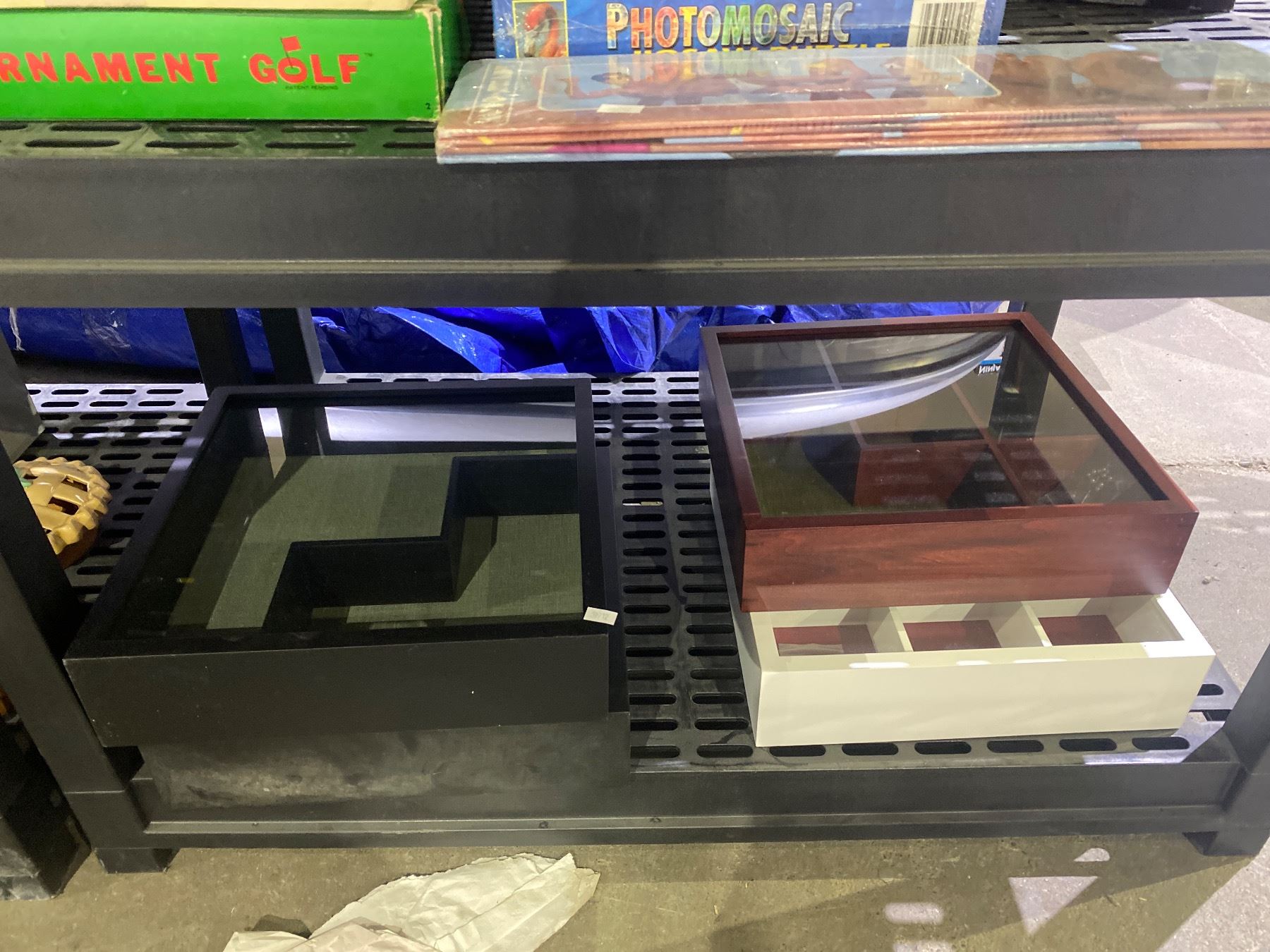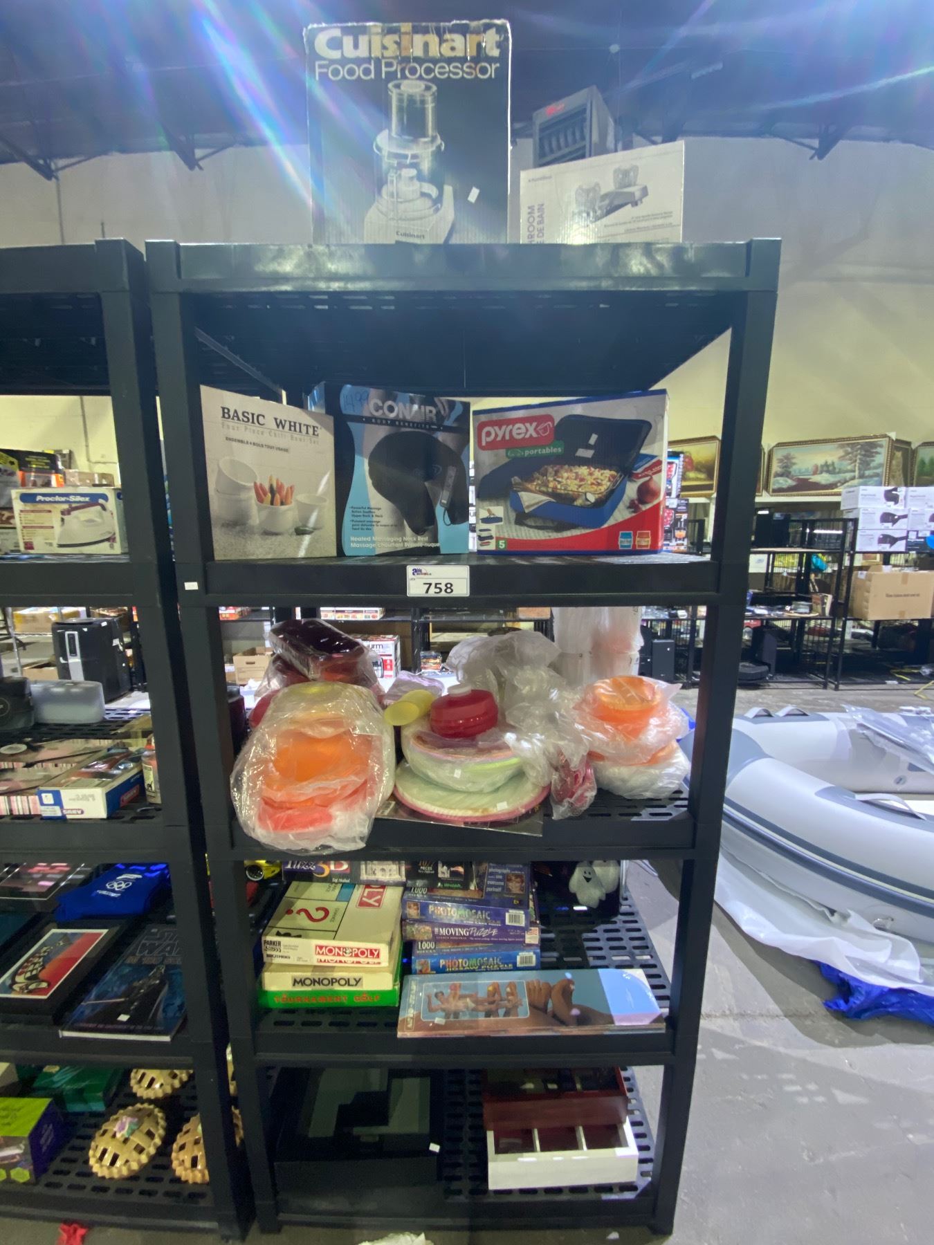 5 TIER SHELVING UNIT WITH CONTENTS: FOOD PROCESSOR, CONAIR HEATED NECK REST MASSAGER, CHILI BOWL SET ASSORTED GAMES, PUZZLES, & MORE