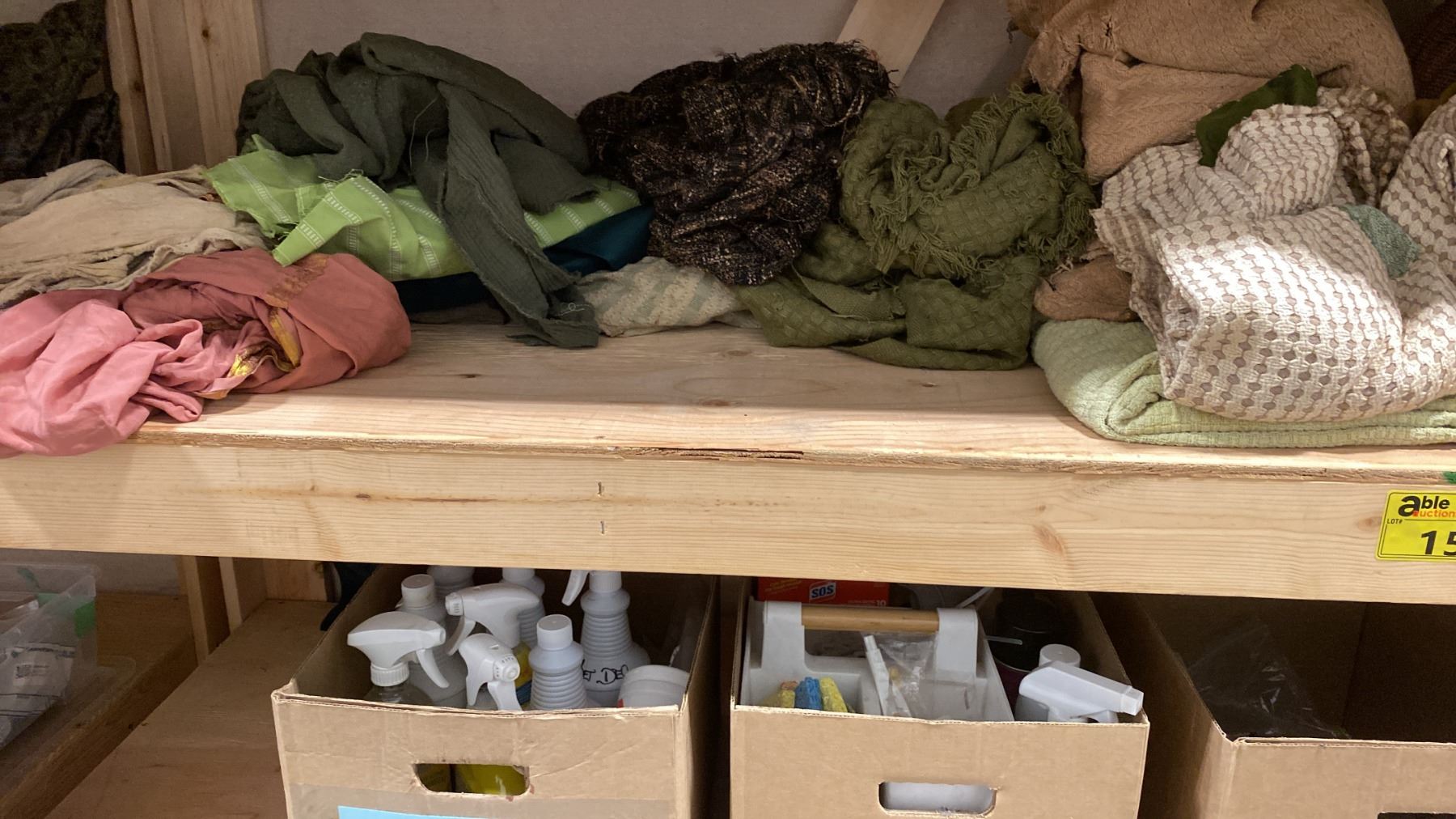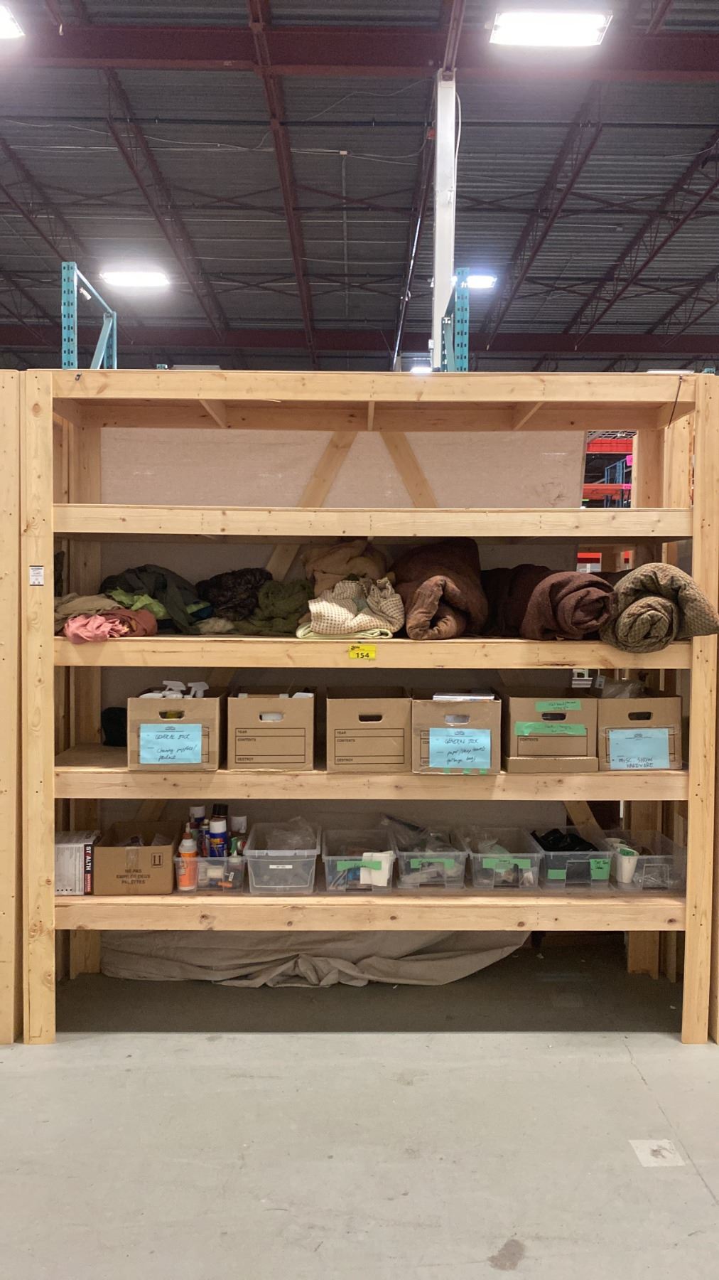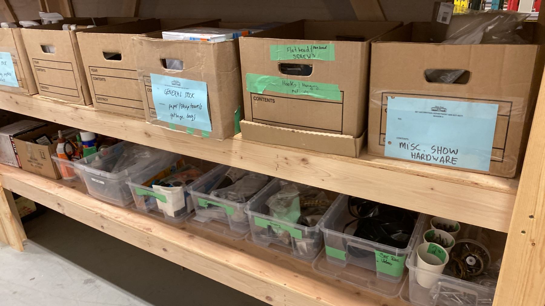 5-TIER WOOD SHELVING UNIT WITH ASSORTED SHOW PROP CONTENTS