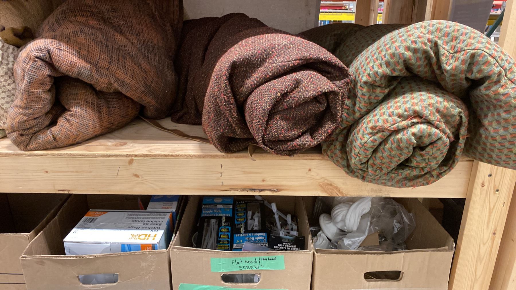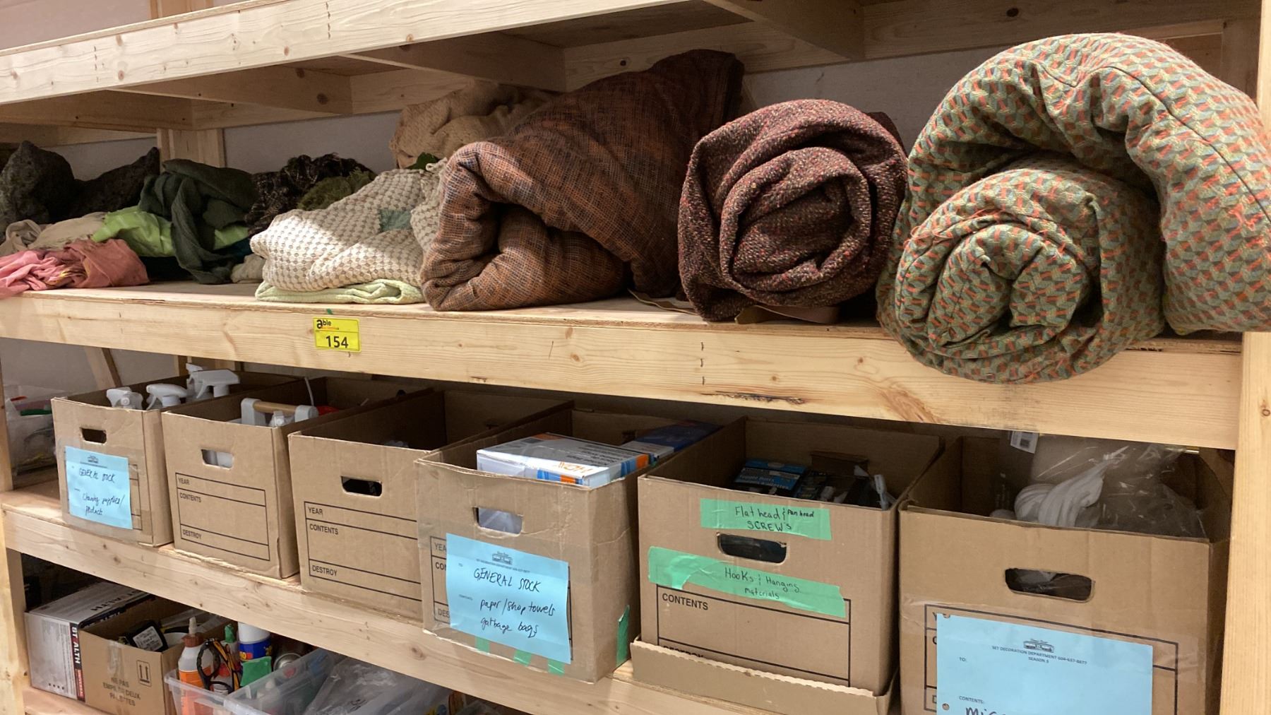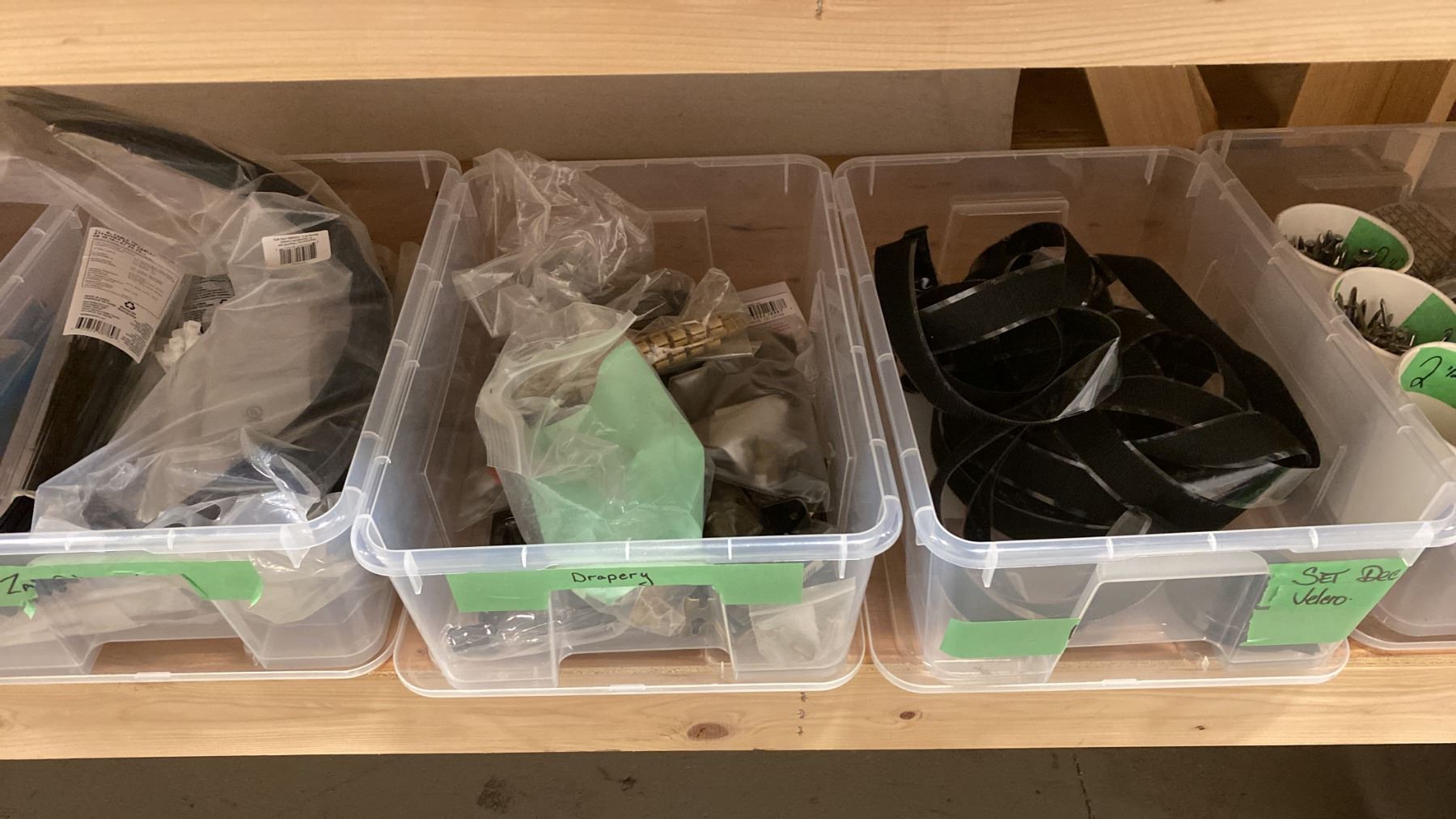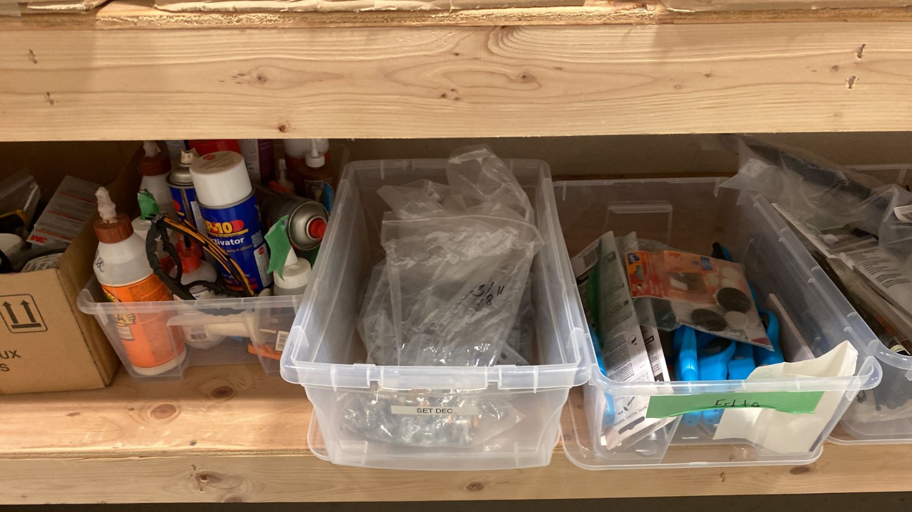 5-TIER WOOD SHELVING UNIT WITH ASSORTED SHOW PROP CONTENTS