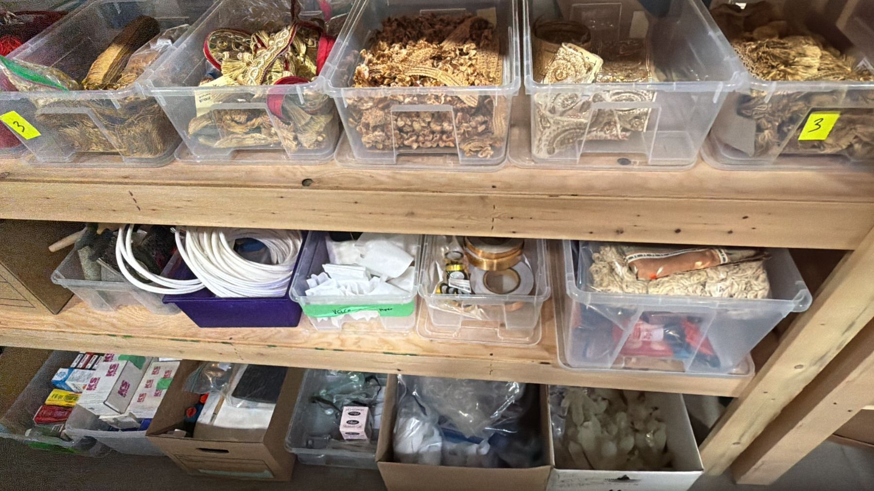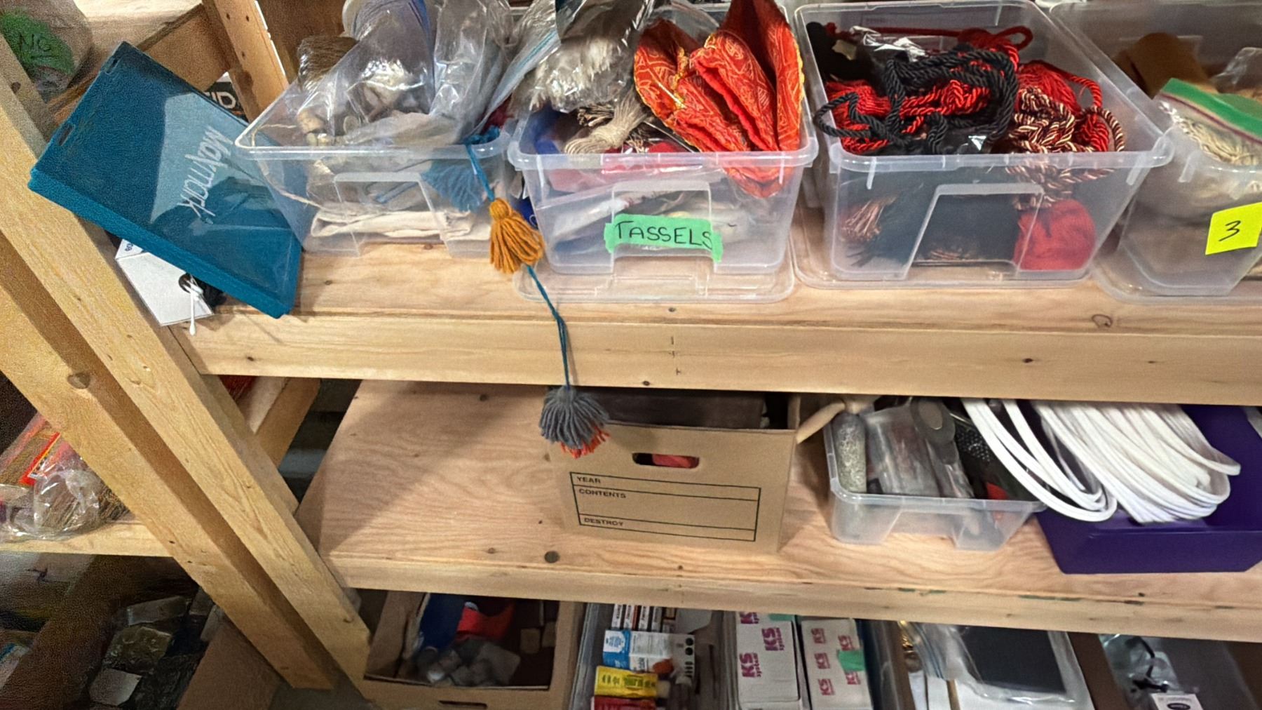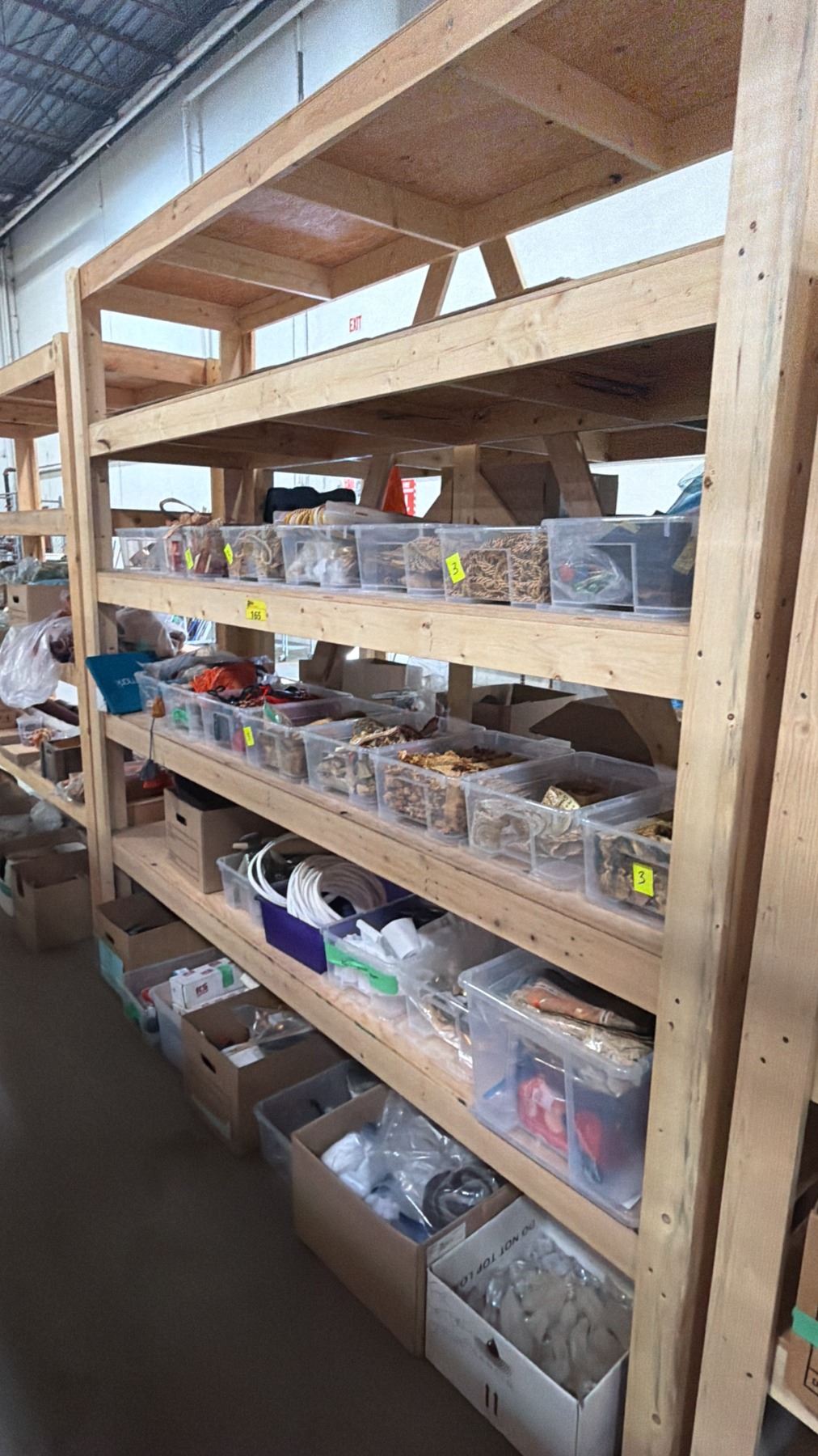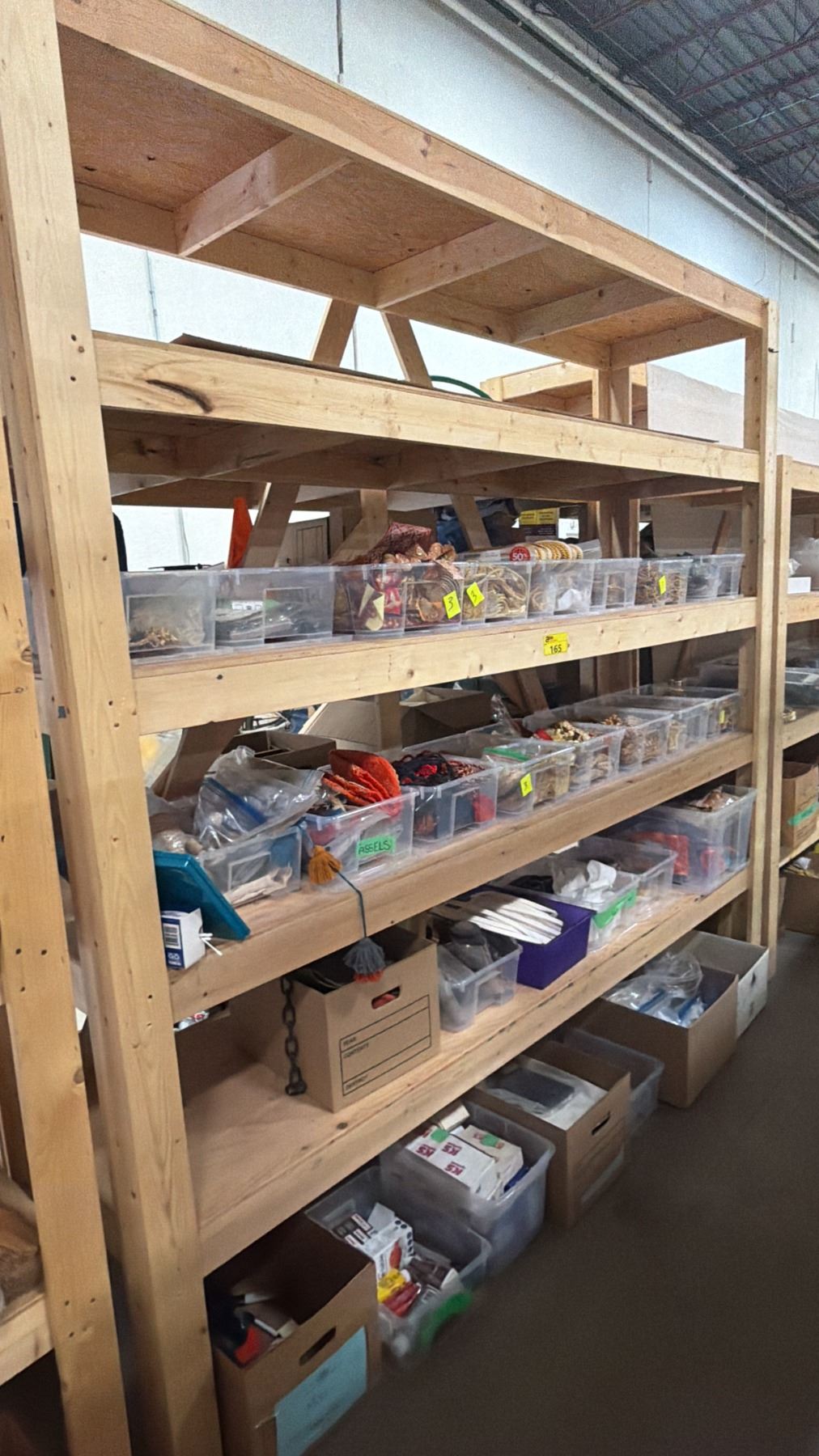 5-TIER WOOD SHELVING UNIT WITH ASSORTED SHOW PROP CONTENTS